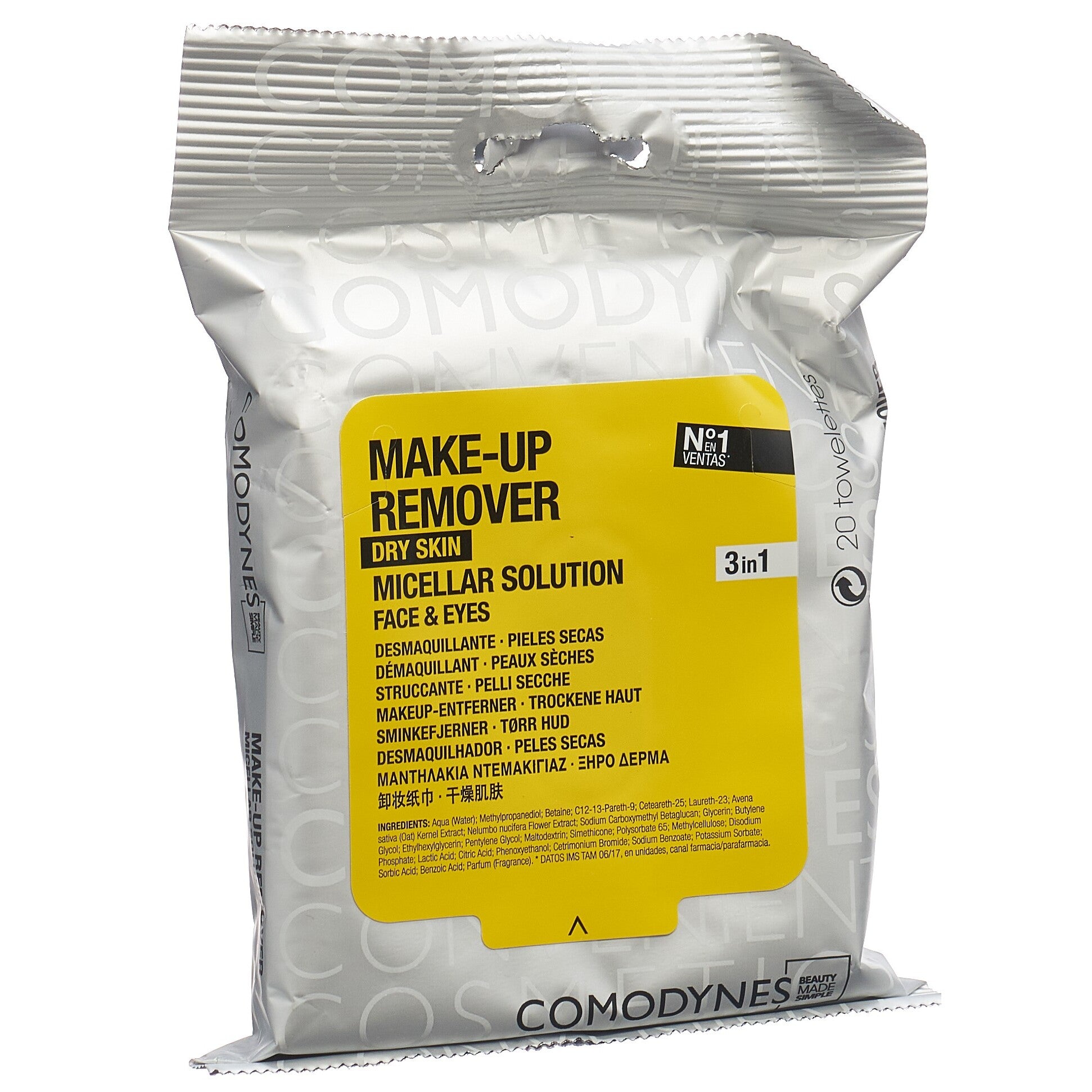 MAKE-UP REMOVER DRY SKIN kombiniert reinigende und feuchtigkeitsspendende Wirkstoffe. Jedes Tuch enthält eine komplette Mizellenbehandlung. Eine einzige Dosis ersetzt die Wirkung von Milch, Gesichtswasser und Make-up-Entferner. Sofortiger 3-in1 Effekt für eine vollständige Reinigung und Hydratation. Extra weiche, 100%-ige Viskose-Tücher werden mit einer mizellaren Lösung (mizellwasser) bei iso-lacrimalem pH-Wert mit ausgezeichneter Haut- und Augentoleranz befeuchtet, wodurch Unreinheiten und Make-up Rückstände entfernt werden und die Haut des Gesichts sauber bleibt und ein angenehmes Gefühl von Frische und Wohlbefinden vermittelt. Das Material und das spezielle Konfektionssystem („kein Gewebe“) ermöglichen eine perfekte Einarbeitung und Beibehaltung der exklusiven Formulierung zum Entfernen von Make-up und für das Peeling.