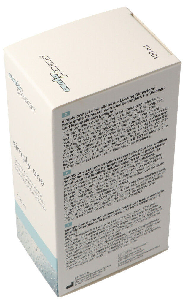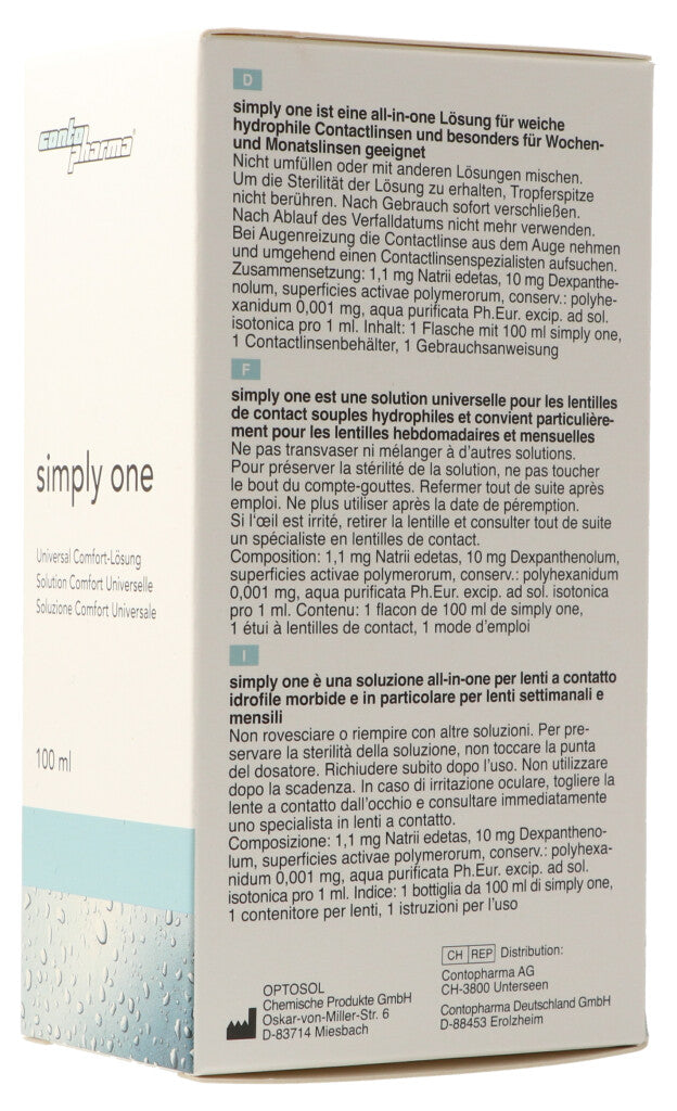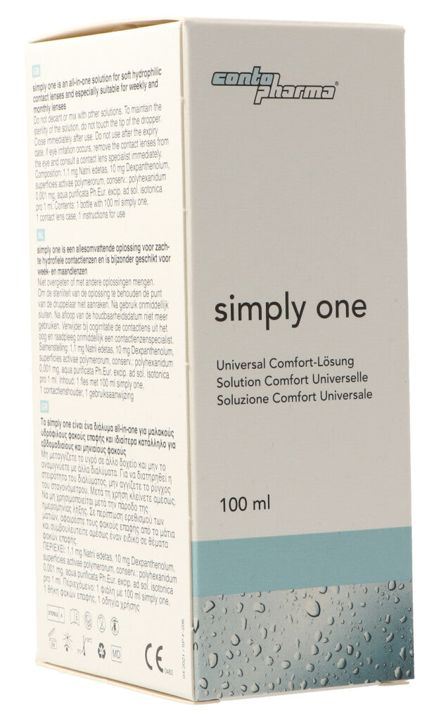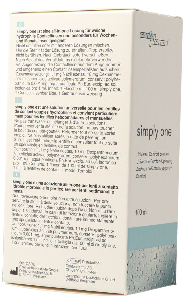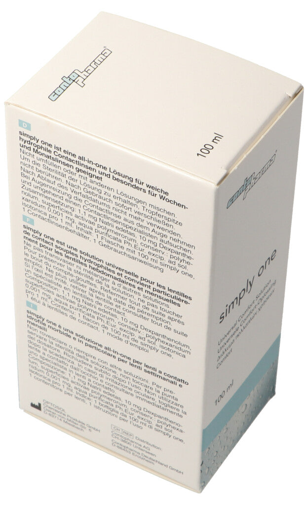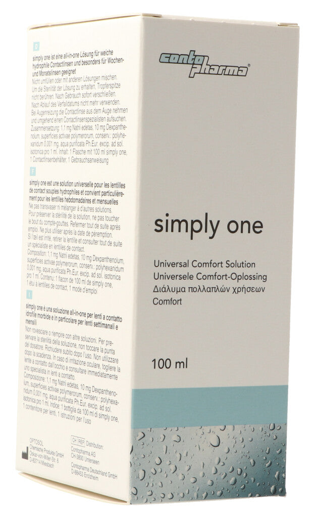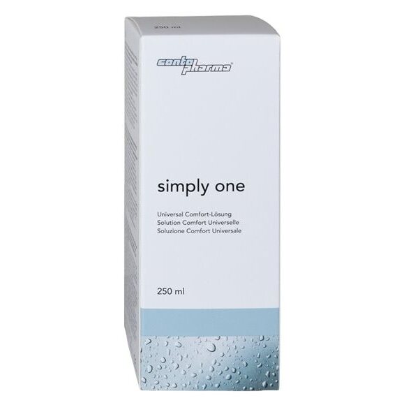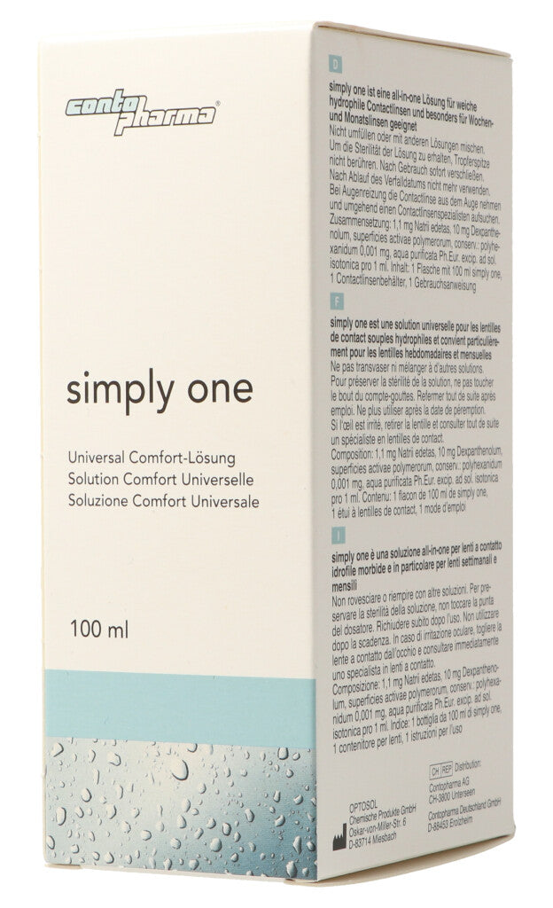 Eine Multifunktions-Lösung soll zum Reinigen, Desinfizieren, Spülen und Aufbewahren sowie Benetzen Verwendung finden, dies alles in einem Produkt. Die Universal Comfort-Lösung "simply one" ergibt einen spontanen wie auch nachhaltig guten Tragekomfort der CL. Die Regeneration der gesunden Hornhaut bei CL-TrägerInnen wird gefördert.