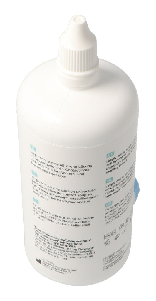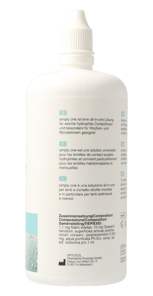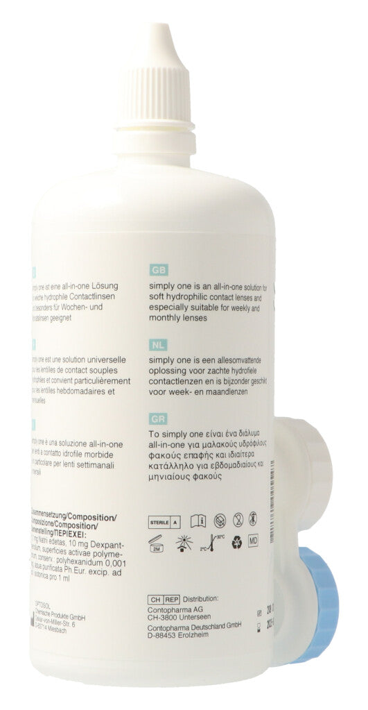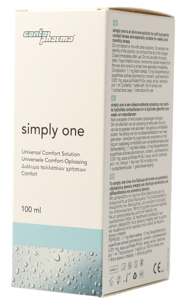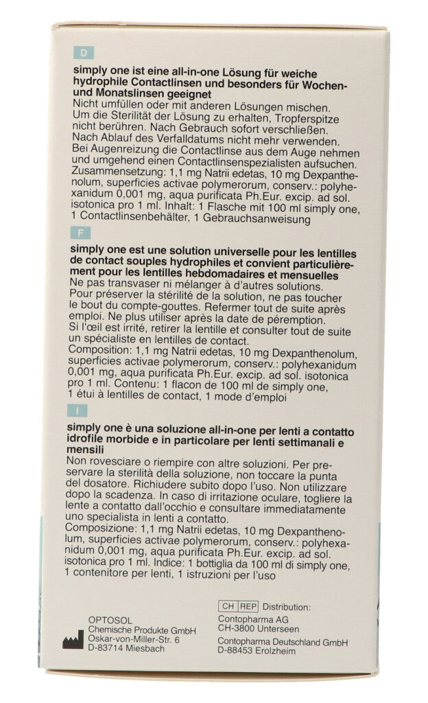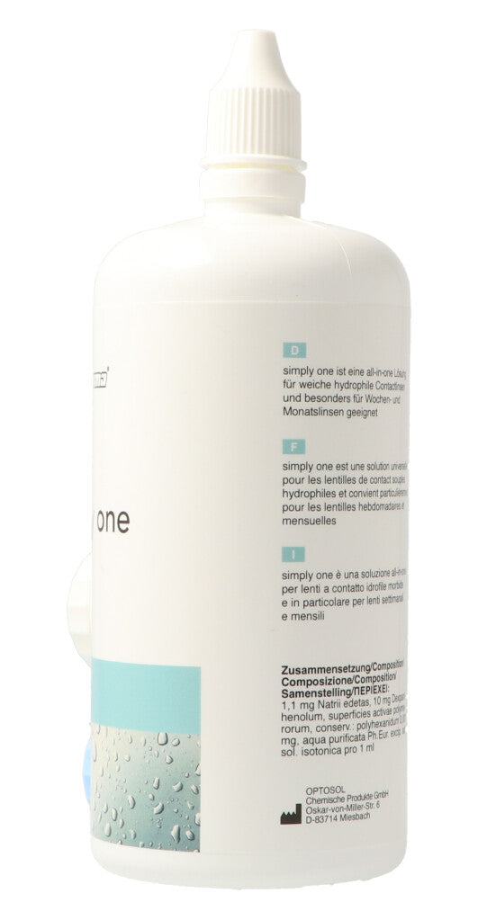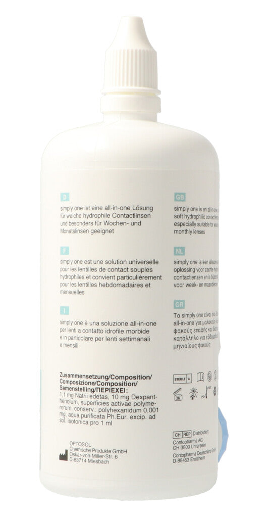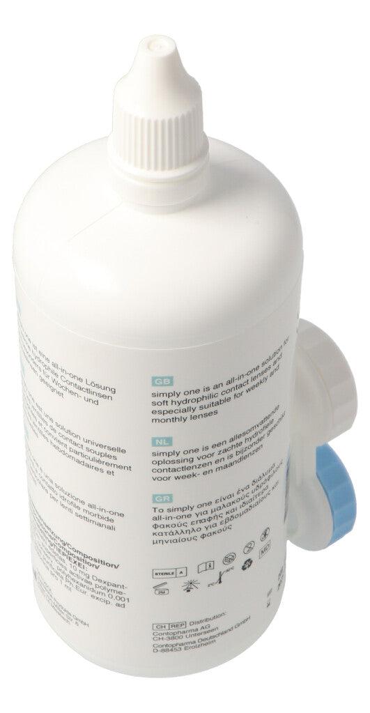 Eine Multifunktions-Lösung soll zum Reinigen, Desinfizieren, Spülen und Aufbewahren sowie Benetzen Verwendung finden, dies alles in einem Produkt. Die Universal Comfort-Lösung "simply one" ergibt einen spontanen wie auch nachhaltig guten Tragekomfort der CL. Die Regeneration der gesunden Hornhaut bei CL-TrägerInnen wird gefördert.