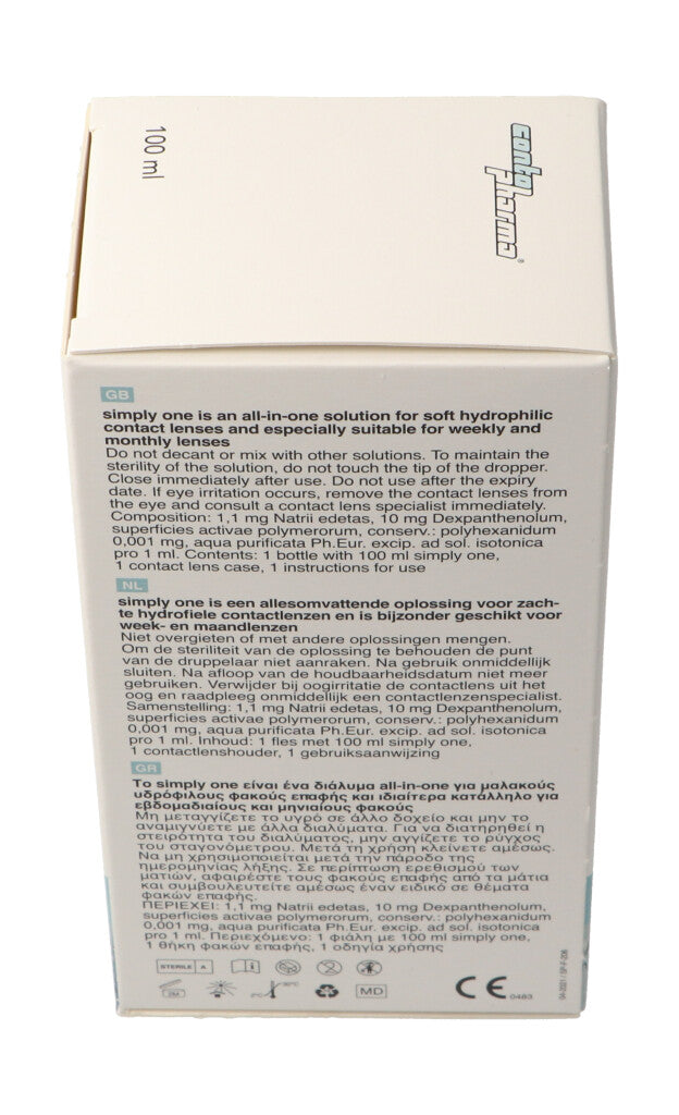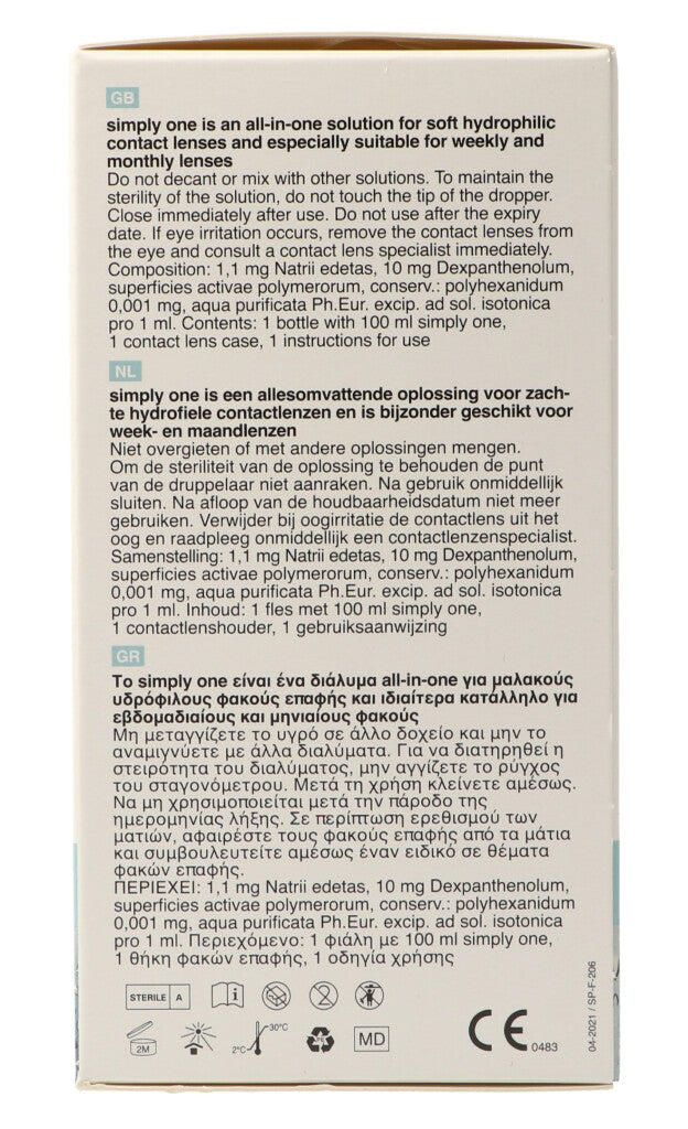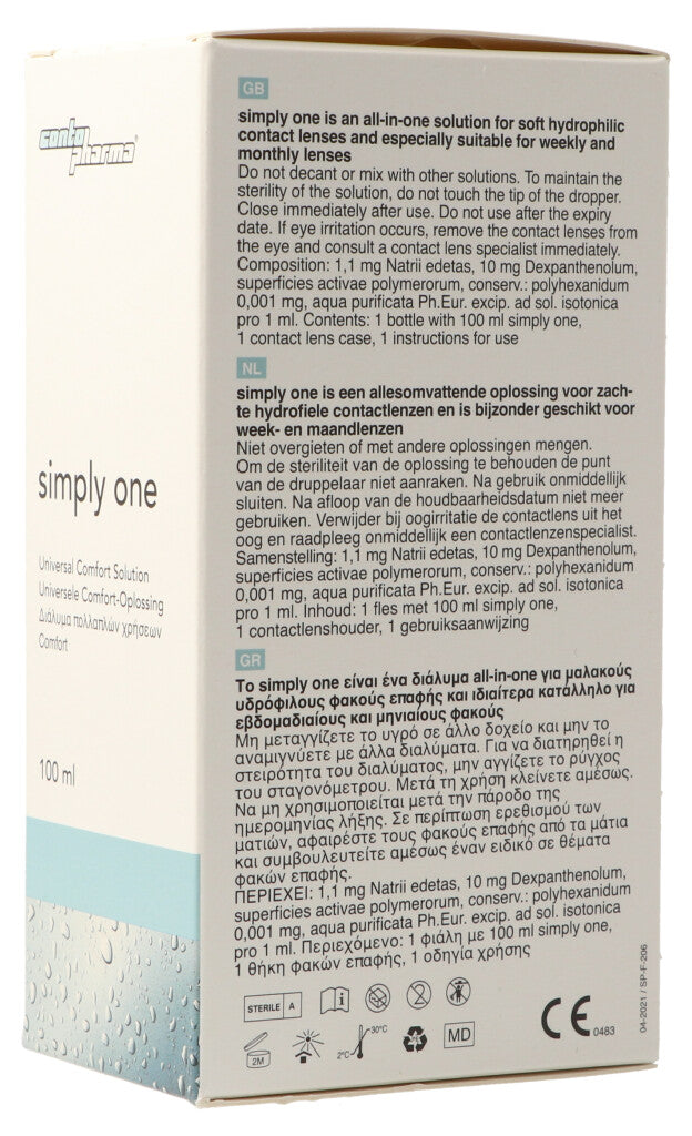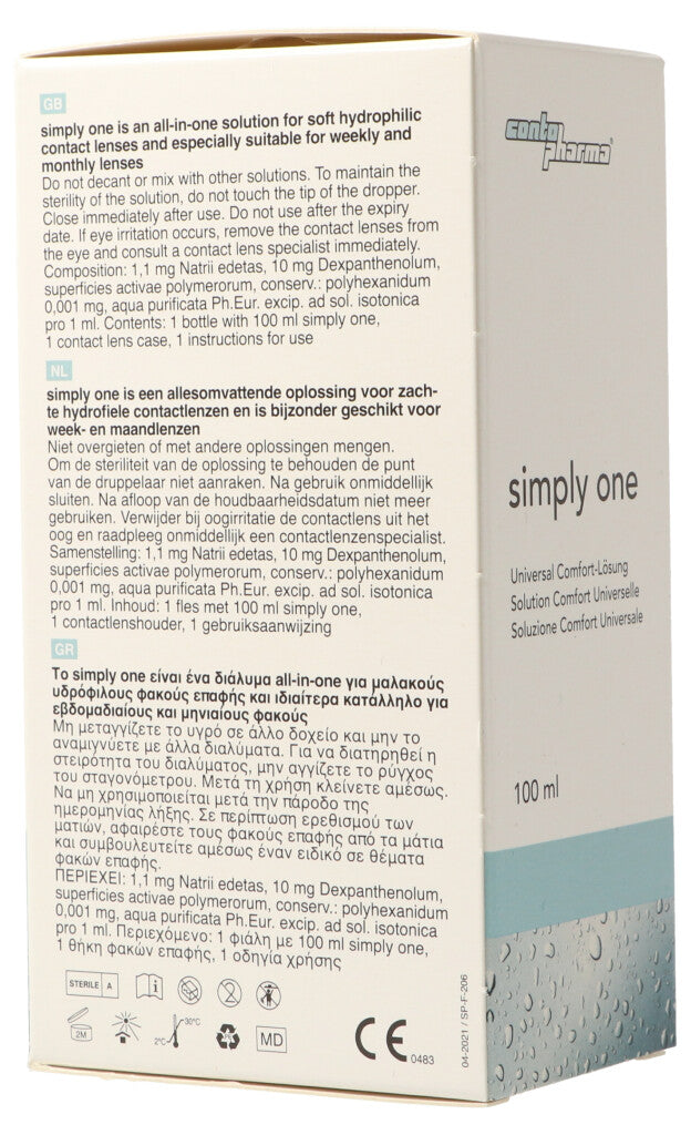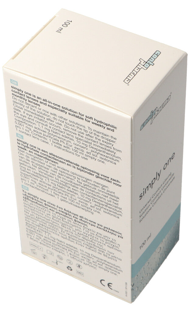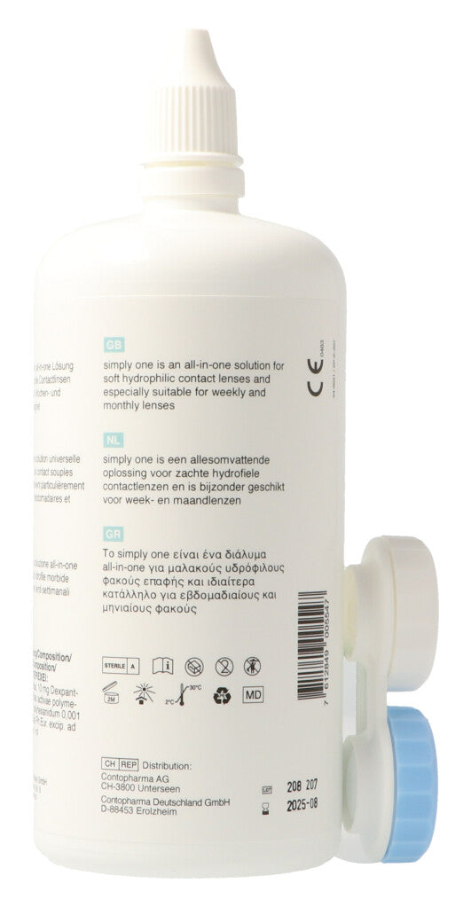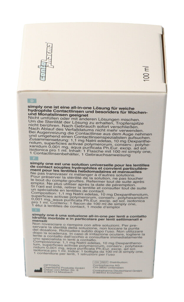 Eine Multifunktions-Lösung soll zum Reinigen, Desinfizieren, Spülen und Aufbewahren sowie Benetzen Verwendung finden, dies alles in einem Produkt. Die Universal Comfort-Lösung "simply one" ergibt einen spontanen wie auch nachhaltig guten Tragekomfort der CL. Die Regeneration der gesunden Hornhaut bei CL-TrägerInnen wird gefördert.