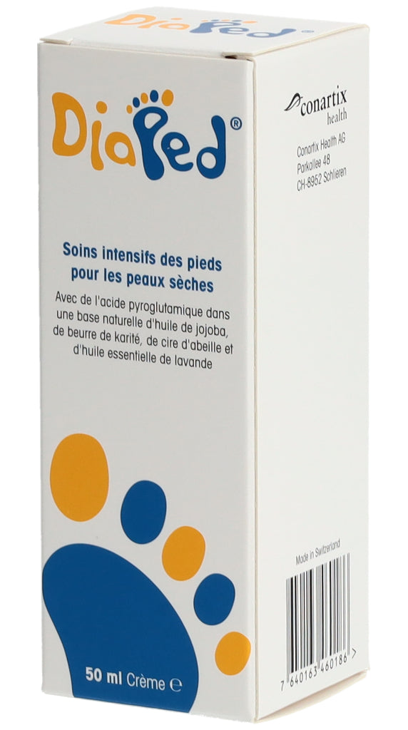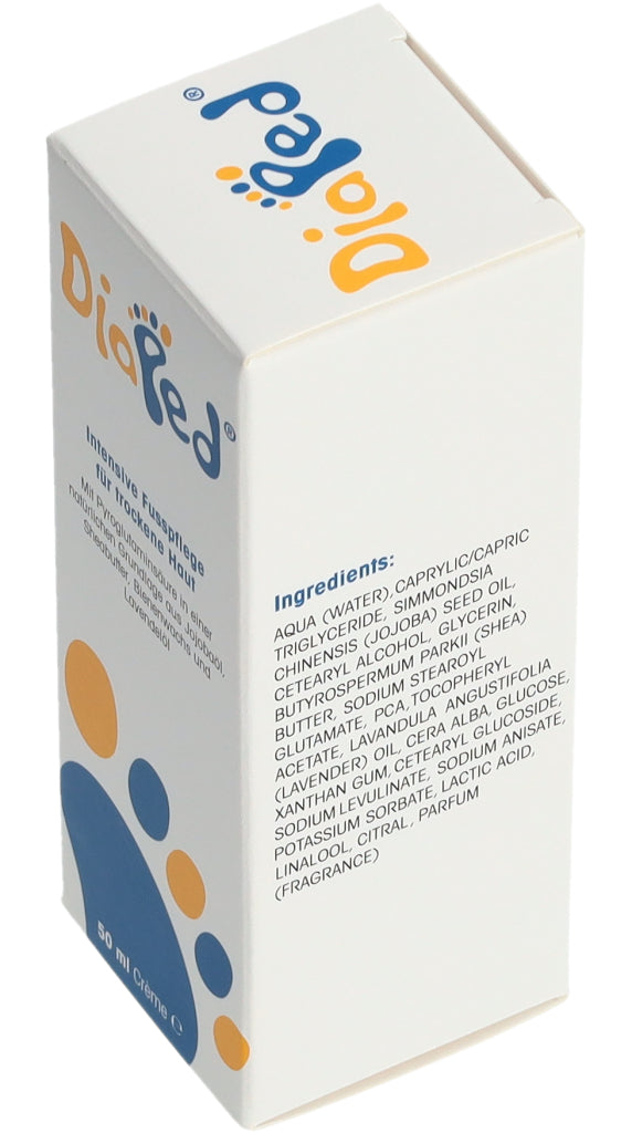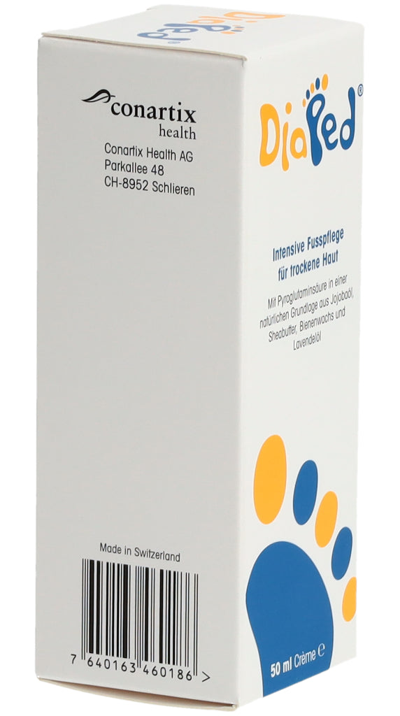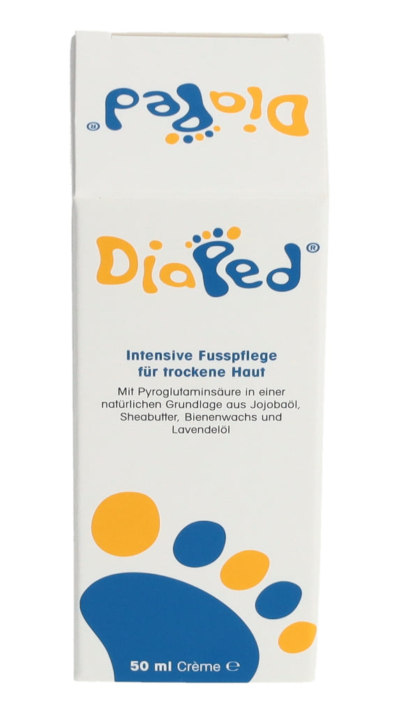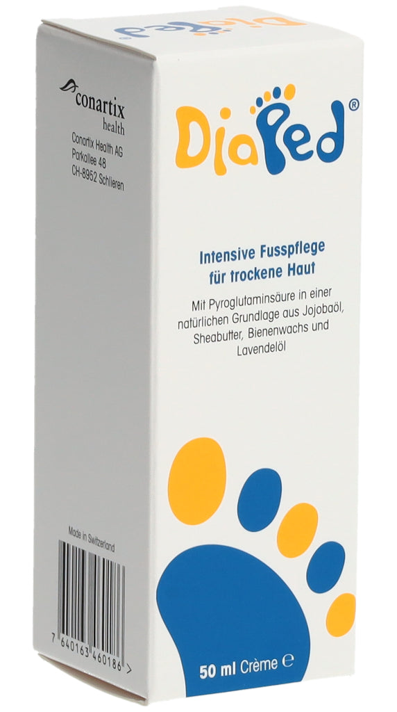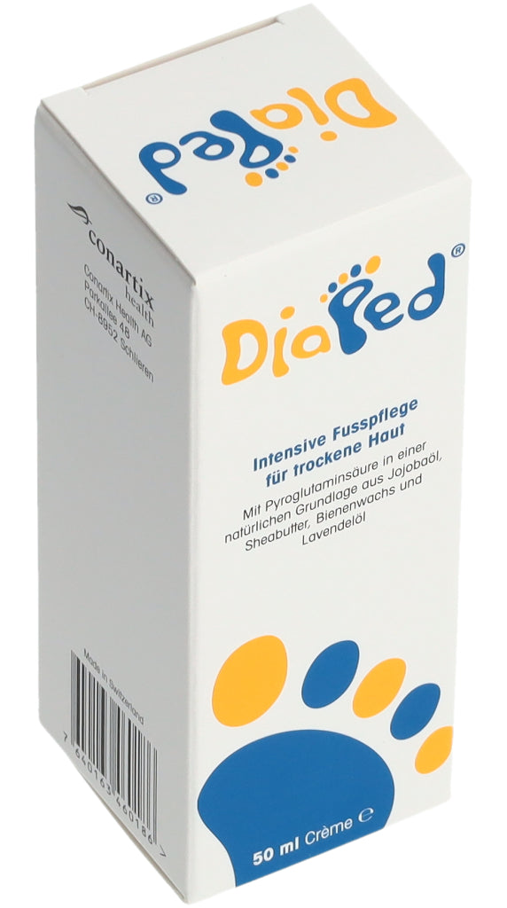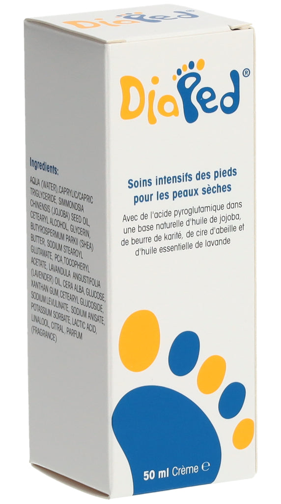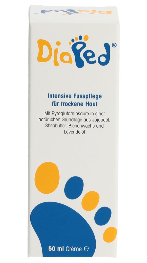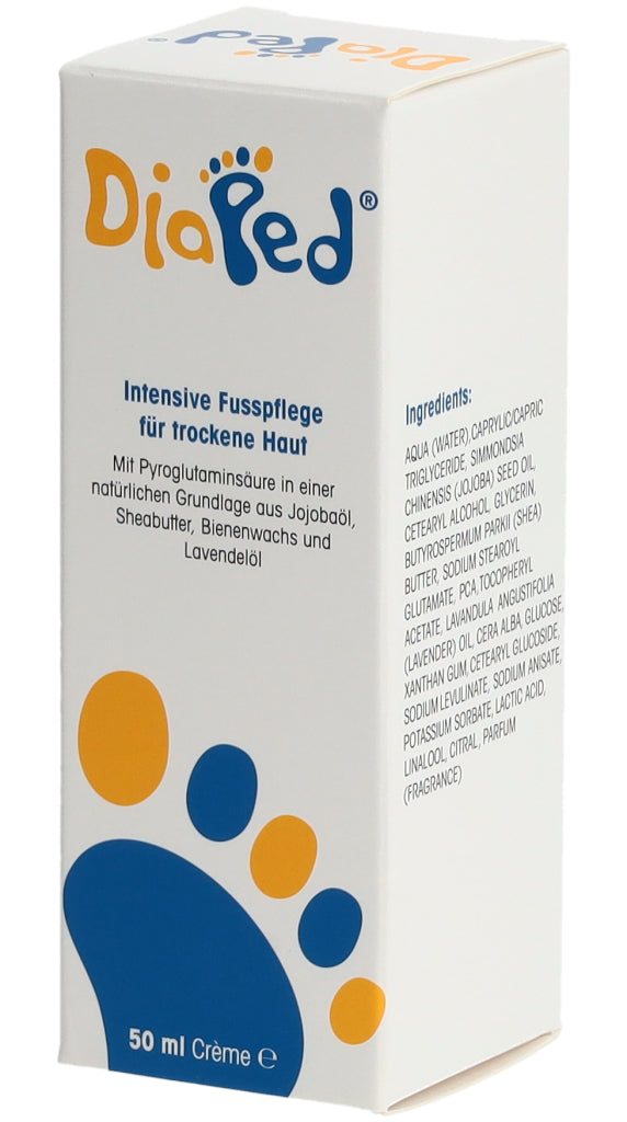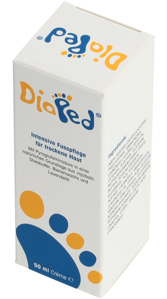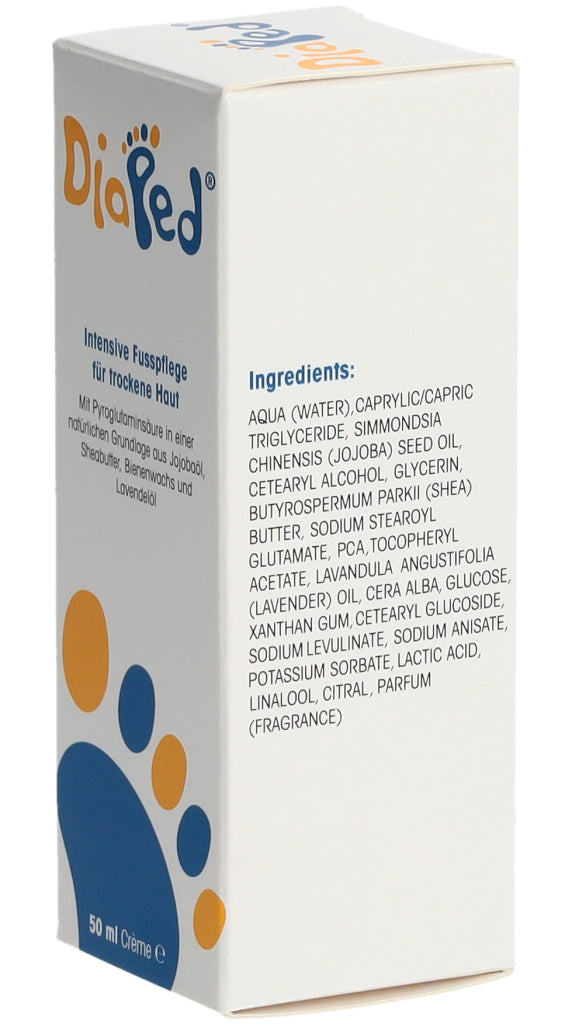 Die DiaPed Fusscrème ist eine intensiv pflegende Crème für die tägliche Pflege von sehr trockenen, rissigen, stark beanspruchten und besonders empfindlichen Füssen. DiaPed enthält Pyroglutaminsäure in einer natürlichen Grundlage aus Jojoba Öl, Shea Butter, Bienenwachs und Lavendelöl. OHNE Parabene. Beim Menschen gehört die Pyroglutaminsäure zum hauteigenen, natürlichen Feuchtigkeitsfaktor (Natural Moisturizing Factor, NMF). Sie hilft der Haut, Feuchtigkeit zu speichern. Die Pyroglutaminsäure ist eine der effektivsten feuchtigkeitsbindenden Substanzen. Ein weiterer wichtiger Inhaltsstoff ist Shea Butter. Shea Butter enthält Allantoin, welches die Haut nährt und die Wundheilung fördert. Deshalb ist Shea Butter ein besonders guter Inhaltsstoff, wenn es um die Pflege von sehr trockener und rissiger Haut geht. Jojoba Öl ist eigentlich kein Öl, sondern ein Wachs, das besonders tanninreich ist. Tannine wirken adstringierend. Sie helfen die Schweissproduktion zu reduzieren und kleine Risse zu schliessen.