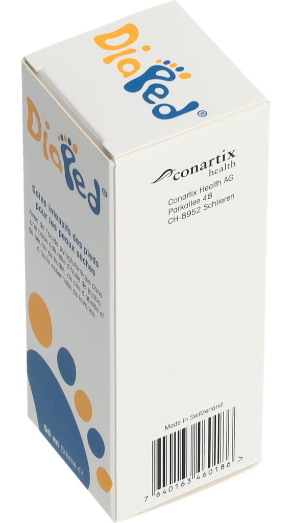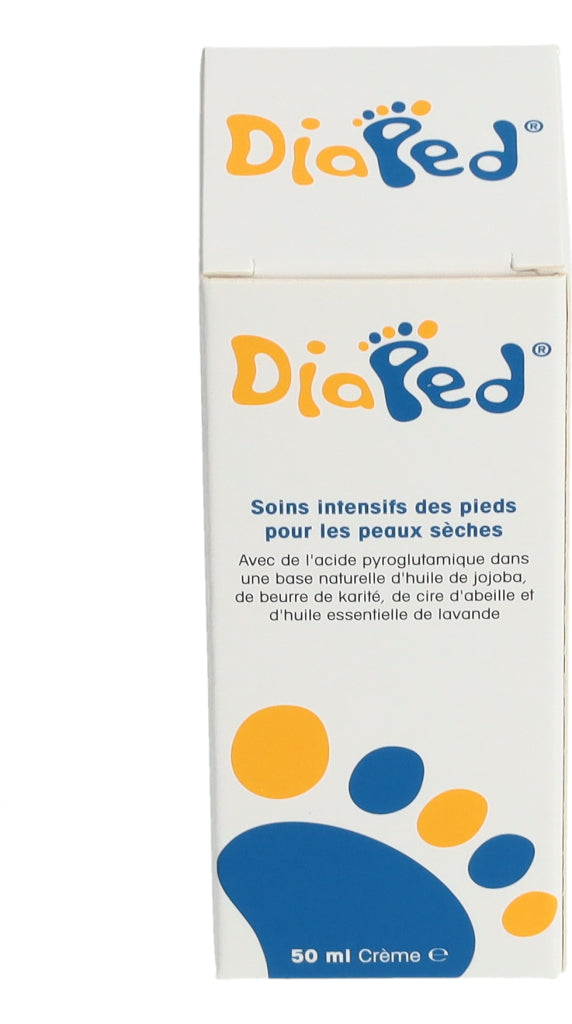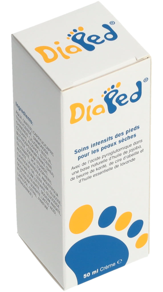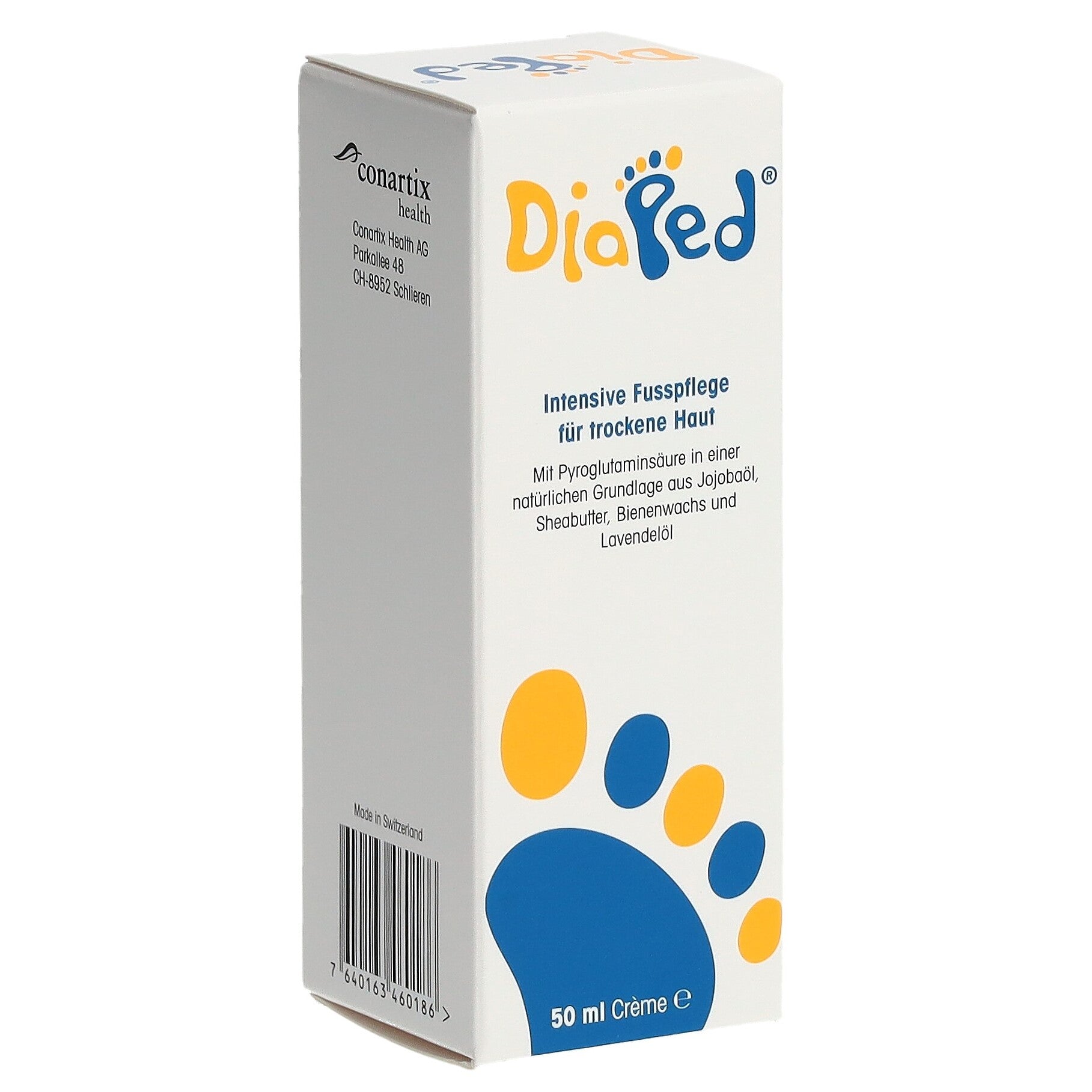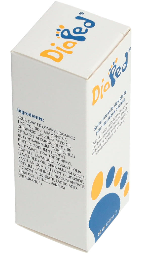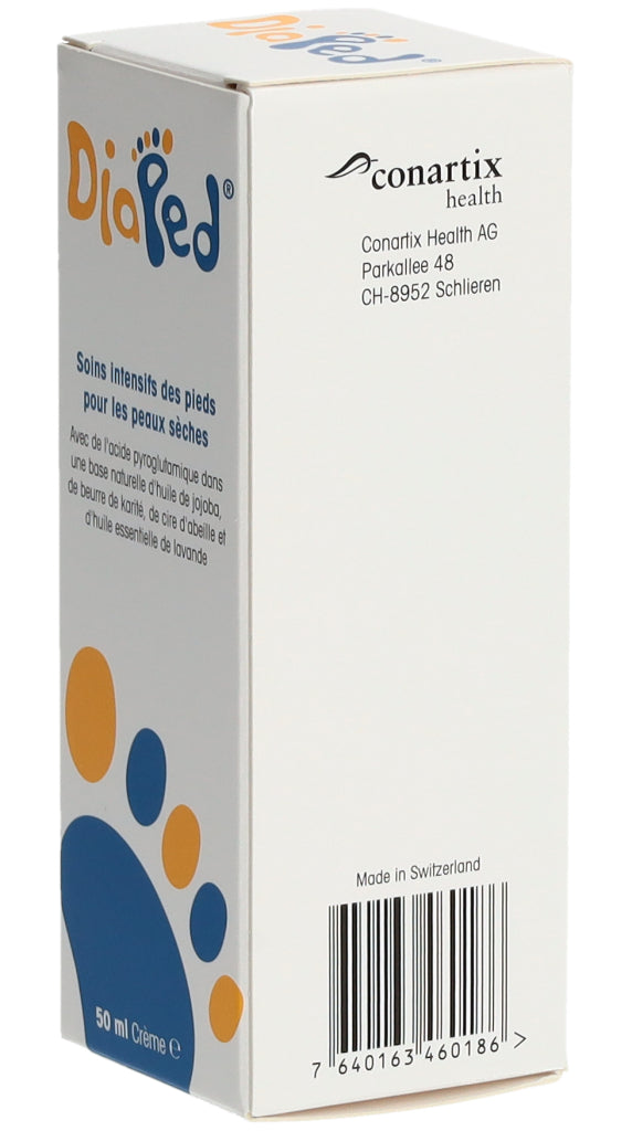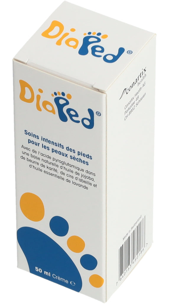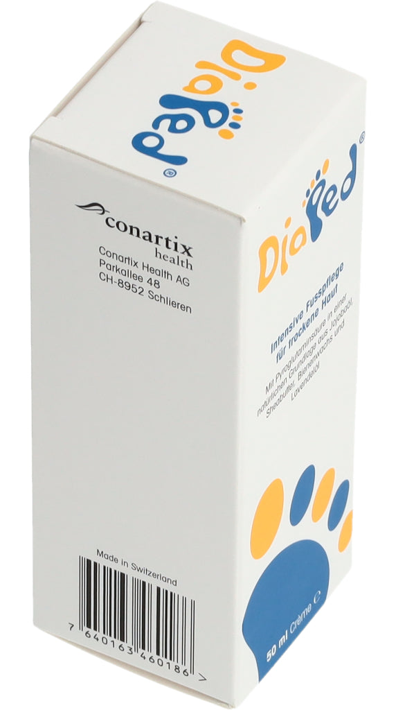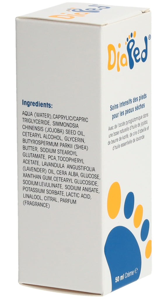 Die DiaPed Fusscrème ist eine intensiv pflegende Crème für die tägliche Pflege von sehr trockenen, rissigen, stark beanspruchten und besonders empfindlichen Füssen. DiaPed enthält Pyroglutaminsäure in einer natürlichen Grundlage aus Jojoba Öl, Shea Butter, Bienenwachs und Lavendelöl. OHNE Parabene. Beim Menschen gehört die Pyroglutaminsäure zum hauteigenen, natürlichen Feuchtigkeitsfaktor (Natural Moisturizing Factor, NMF). Sie hilft der Haut, Feuchtigkeit zu speichern. Die Pyroglutaminsäure ist eine der effektivsten feuchtigkeitsbindenden Substanzen. Ein weiterer wichtiger Inhaltsstoff ist Shea Butter. Shea Butter enthält Allantoin, welches die Haut nährt und die Wundheilung fördert. Deshalb ist Shea Butter ein besonders guter Inhaltsstoff, wenn es um die Pflege von sehr trockener und rissiger Haut geht. Jojoba Öl ist eigentlich kein Öl, sondern ein Wachs, das besonders tanninreich ist. Tannine wirken adstringierend. Sie helfen die Schweissproduktion zu reduzieren und kleine Risse zu schliessen.