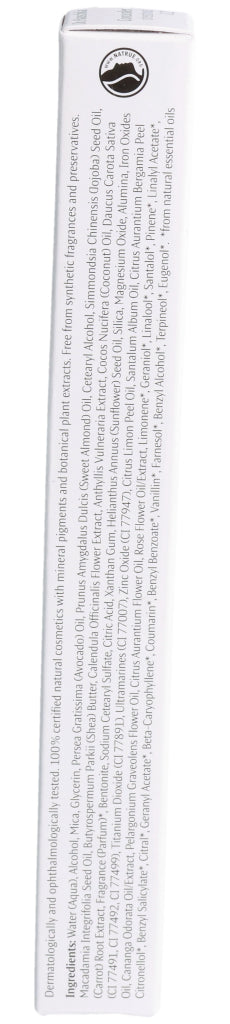 Wasser, Alkohol, Glimmer, pflanzliches Glycerin, Avocadoöl, Mandelöl, Fettalkohole, Jojobaöl, Macadamianussöl, Sheabutter, Auszüge aus Ringelblume und Wundklee, Kokosöl, Auszug aus Karotte, Ätherische Öle, Bentonit, Fettalkohole (sulfatiert), Zitronensäure, Xanthan, Sonnenblumenöl, Kieselsäure, Magnesiumoxid, Aluminiumoxid, Eisenoxide, Titandioxid, Zinkoxid. *aus natürlichen ätherischen Ölen.