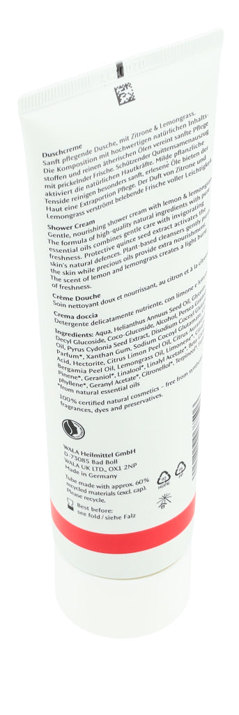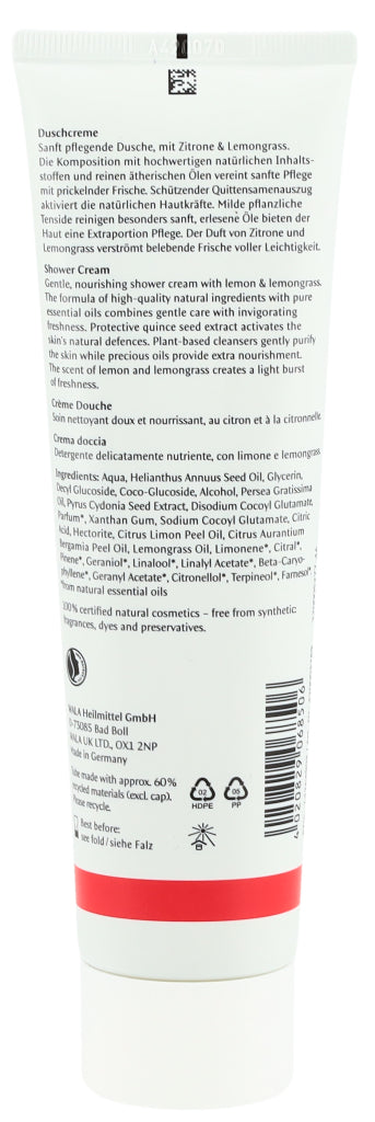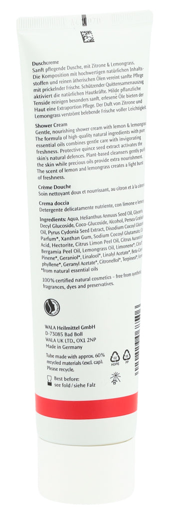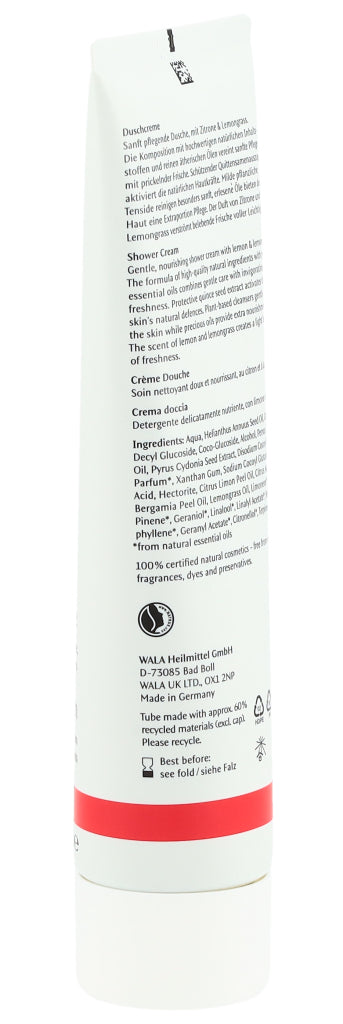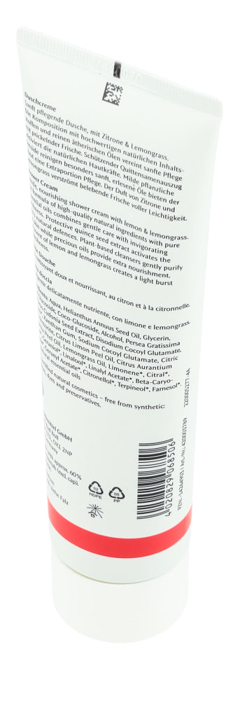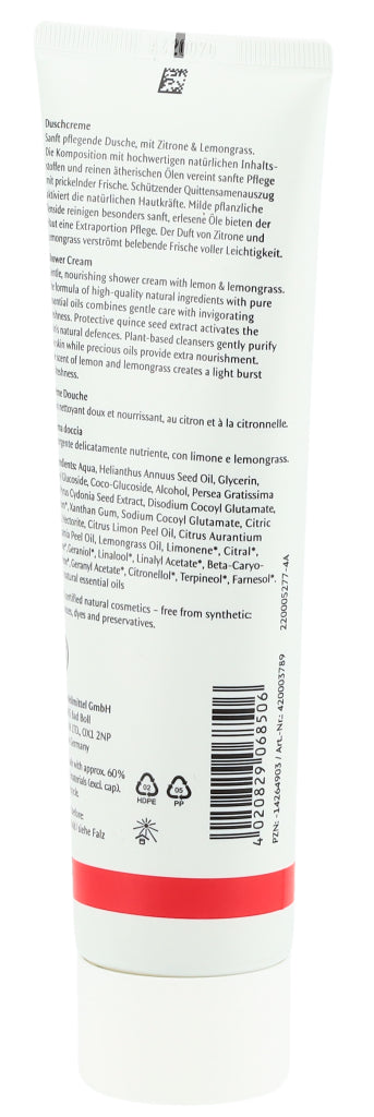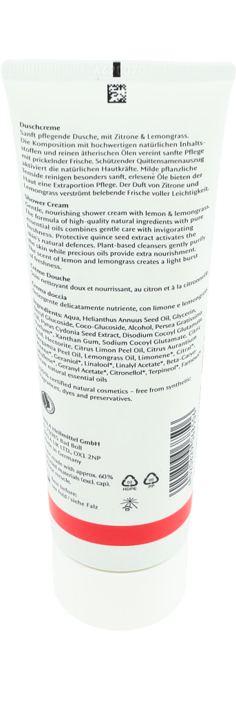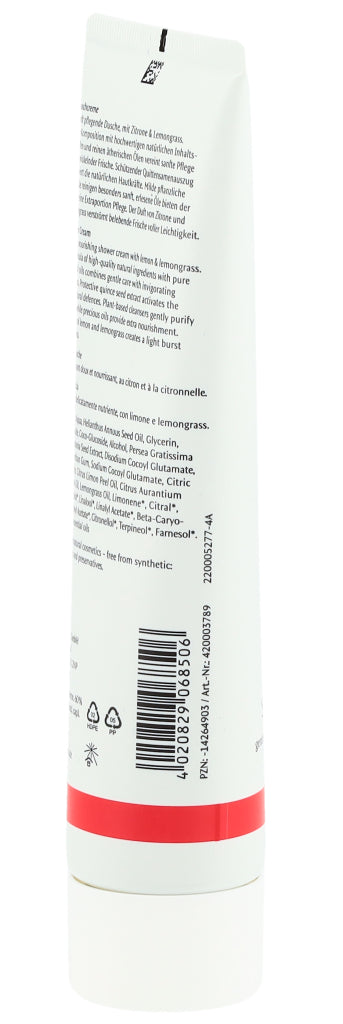 Die Dr. Hauschka Duschcreme ist besonders hautverträglich, sanft, cremig und leicht schäumend. Dieser leichte Schaum bietet mithilfe rein pflanzliche Tensiden eine sanfte Reinigung, ohne dabei die Haut auszutrocknen und duftet zugleich nach Zitrone und Zitronengras.