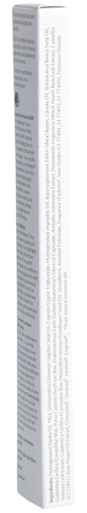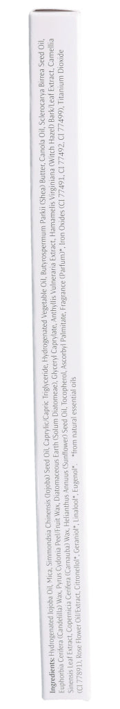 Jojobawachs, Glimmer, Jojobaöl, Neutralöl, Pflanzenöl (gehärtet), Sheabutter, Canolaöl, Marulaöl, Candelillawachs, Quittenwachs, Kieselerde, Glycerin-Fettsäureester, Auszüge aus Wundklee, Zaubernuss und Schwarztee, Carnaubawachs, Sonnenblumenöl, Ätherische Öle, Vitamin E, Vitamin-C-Palmitat, Eisenoxid. *aus natürlichen ätherischen Ölen.