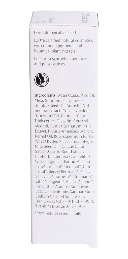 Wasser, Alkohol, Glimmer, Jojobaöl, Auszug aus Wundklee, Kokosöl, Neutralöl, pflanzliches Glycerin, Fettalkohole, Auszug aus Granatapfel, Aprikosenkernöl, Sheabutter, Macadamianussöl, Auszug aus Karotte, Candelillawachs, Ätherische Öle, Sonnenblumenöl, Bentonit, Xanthan, Fettalkohole (sulfatiert), Kieselsäure, Eisenoxide, Titandioxid. *aus natürlichen ätherischen Ölen.