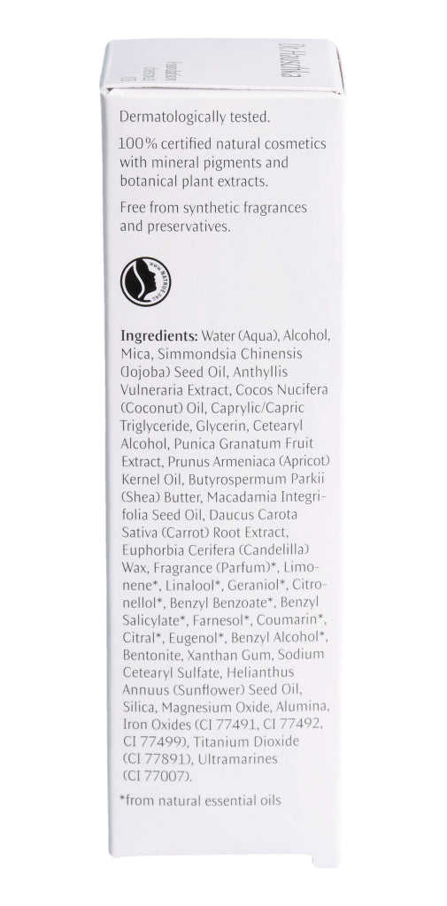Wasser, Alkohol, Glimmer, Jojobaöl, Auszug aus Wundklee, Kokosöl, Neutralöl, pflanzliches Glycerin, Fettalkohole, Auszug aus Granatapfel, Aprikosenkernöl, Sheabutter, Macadamianussöl, Auszug aus Karotte, Candelillawachs, Ätherische Öle, Sonnenblumenöl, Bentonit, Xanthan, Fettalkohole (sulfatiert), Kieselsäure, Eisenoxide, Titandioxid. *aus natürlichen ätherischen Ölen.