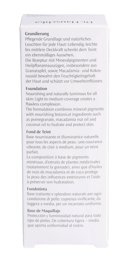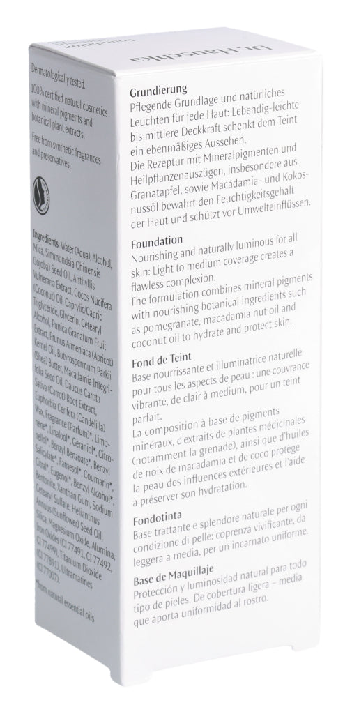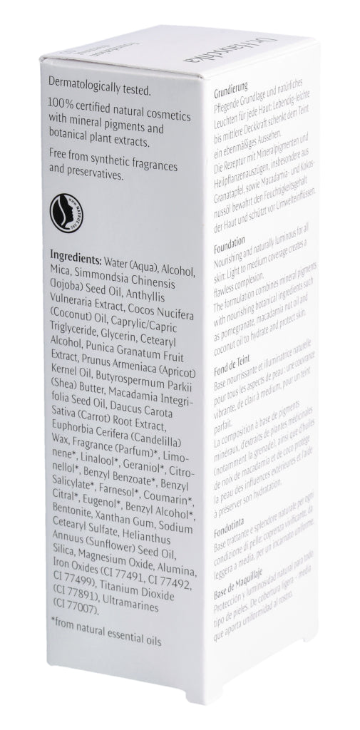 Pflegende Grundlage und natürliches Leuchten für jede Haut: Lebendig-leichte bis mittlere Deckkraft schenkt dem Teint ein ebenmäßiges Aussehen. Die Rezeptur mit Mineralpigmenten und Heilpflanzenauszügen, insbesondere aus Granatapfel, sowie Macadamia- und Kokosnussöl bewahrt den Feuchtigkeitsgehalt der Haut und schützt vor Umwelteinflüssen.