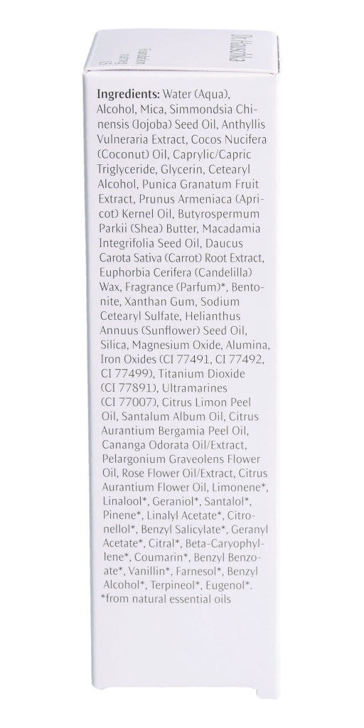 Wasser, Alkohol, Glimmer, Jojobaöl, Auszug aus Wundklee, Kokosöl, Neutralöl, pflanzliches Glycerin, Fettalkohole, Auszug aus Granatapfel, Aprikosenkernöl, Sheabutter, Macadamianussöl, Auszug aus Karotte, Candelillawachs, Ätherische Öle, Sonnenblumenöl, Bentonit, Xanthan, Fettalkohole (sulfatiert), Kieselsäure, Eisenoxide, Titandioxid. *aus natürlichen ätherischen Ölen.