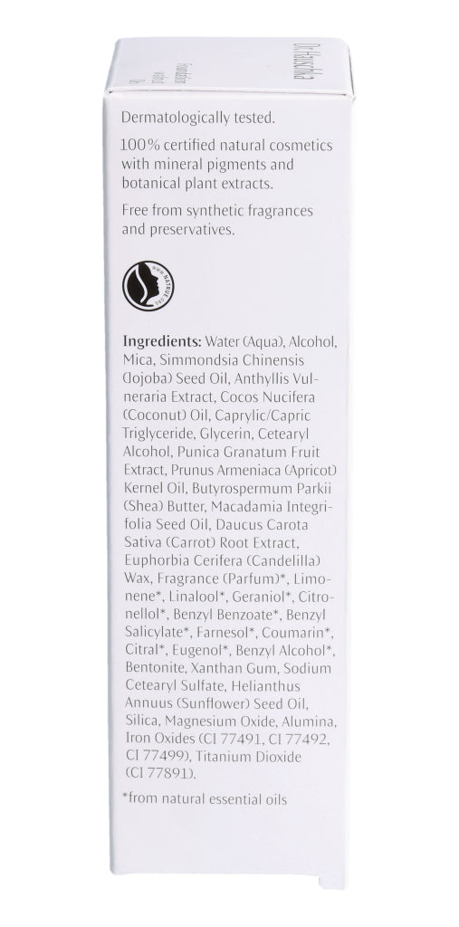 Wasser, Alkohol, Glimmer, Jojobaöl, Auszug aus Wundklee, Kokosöl, Neutralöl, pflanzliches Glycerin, Fettalkohole, Auszug aus Granatapfel, Aprikosenkernöl, Sheabutter, Macadamianussöl, Auszug aus Karotte, Candelillawachs, Ätherische Öle, Sonnenblumenöl, Bentonit, Xanthan, Fettalkohole (sulfatiert), Kieselsäure, Eisenoxide, Titandioxid. *aus natürlichen ätherischen Ölen.