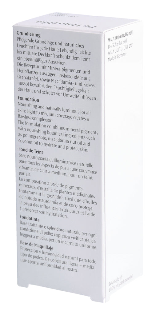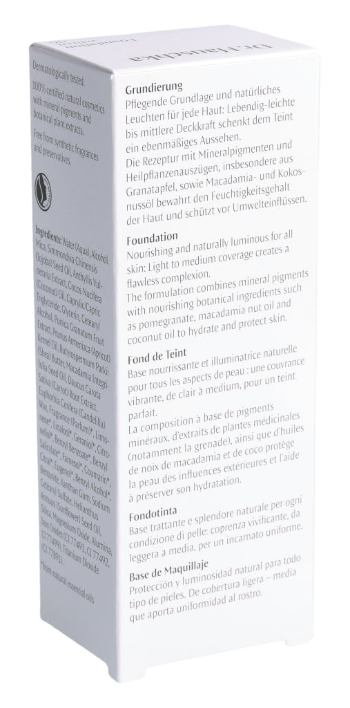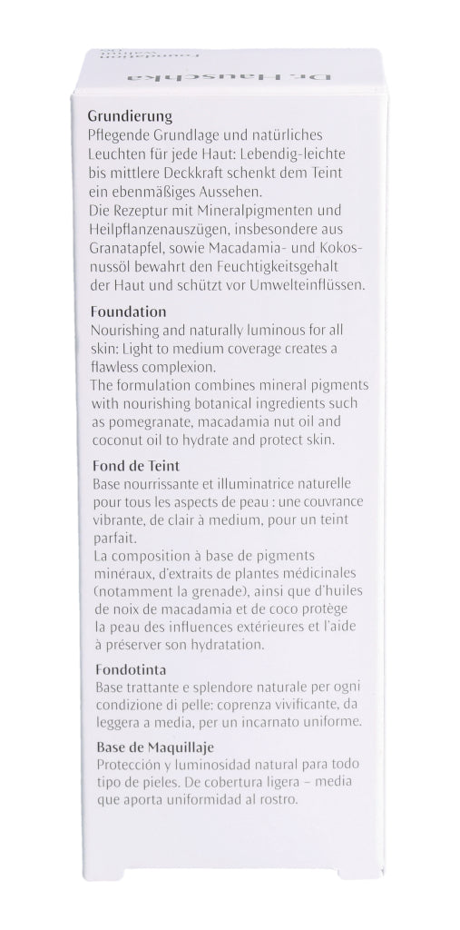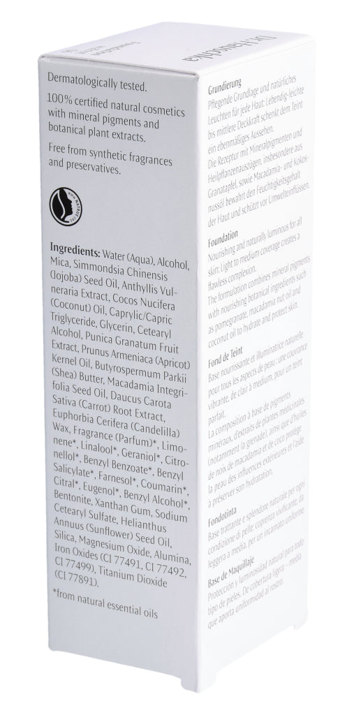 Pflegende Grundlage und natürliches Leuchten für jede Haut: Lebendig-leichte bis mittlere Deckkraft schenkt dem Teint ein ebenmäßiges Aussehen. Die Rezeptur mit Mineralpigmenten und Heilpflanzenauszügen, insbesondere aus Granatapfel, sowie Macadamia- und Kokosnussöl bewahrt den Feuchtigkeitsgehalt der Haut und schützt vor Umwelteinflüssen.