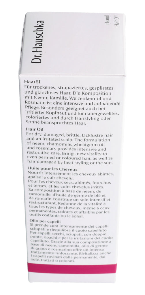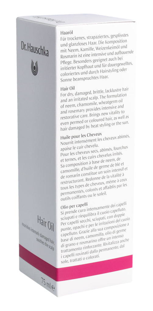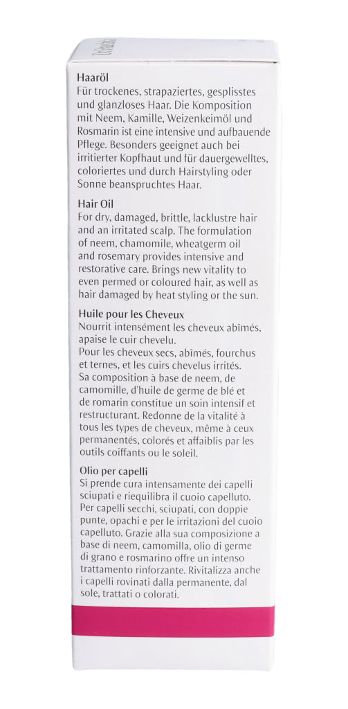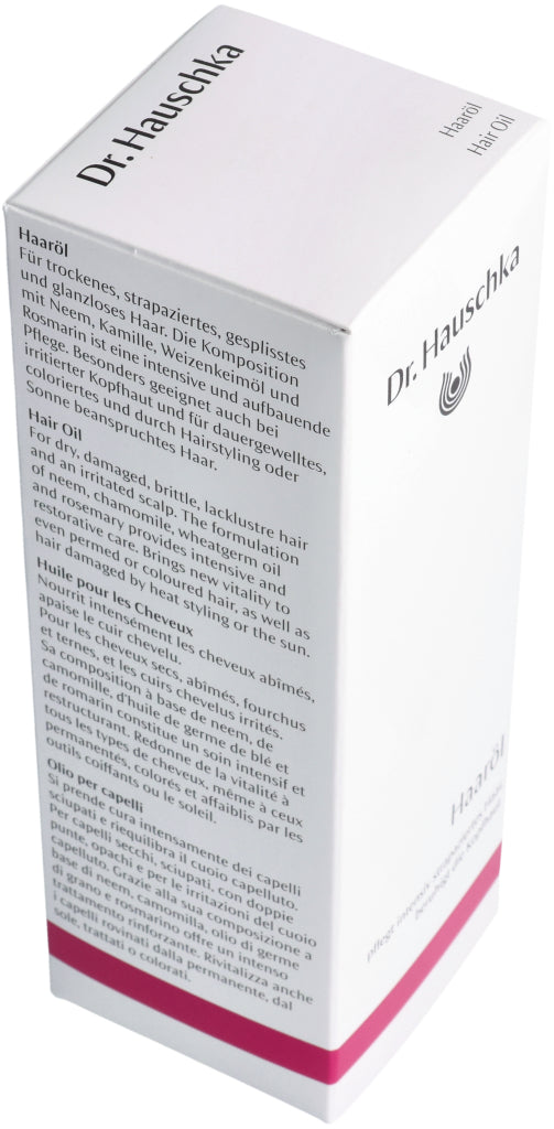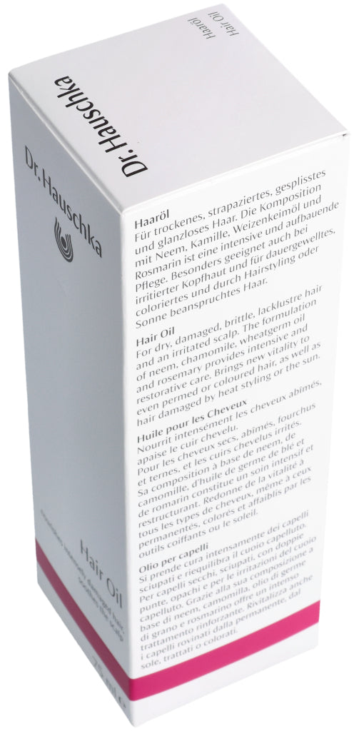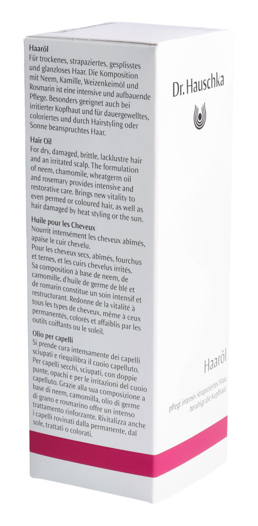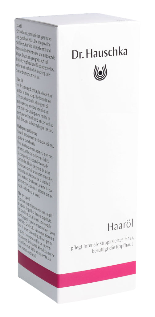 Das Haaröl von Dr. Hauschka hat mit seiner aussergewöhnlichen Zusammensetzung aus Neem, Kamille, Weizenkeimöl und Rosmarin einerseits eine kräftigende Wirkung auf das Haar und andererseits eine beruhigende auf die Kopfhaut.