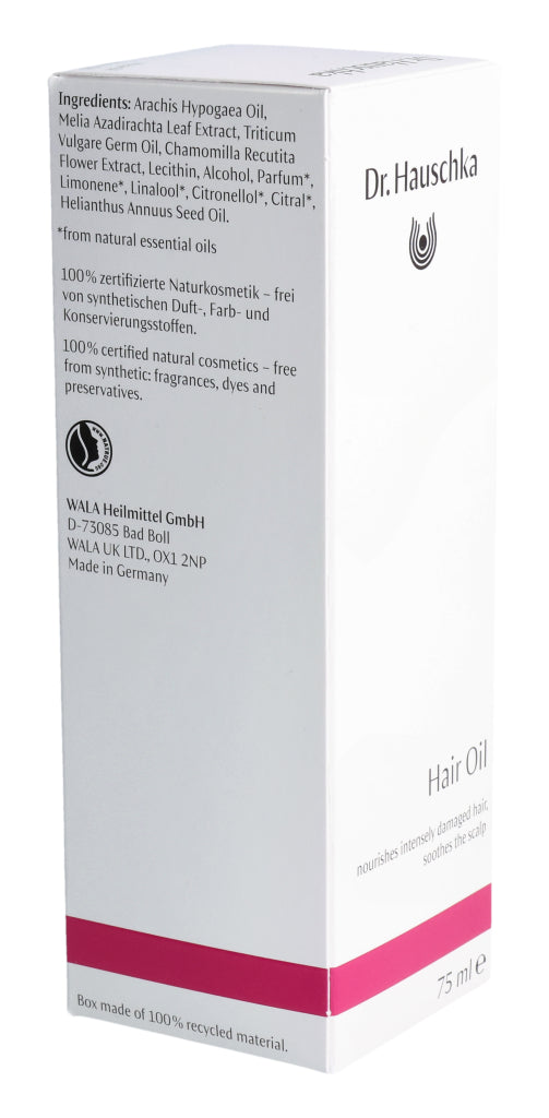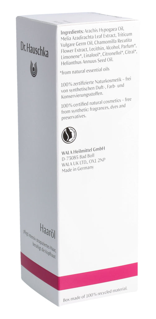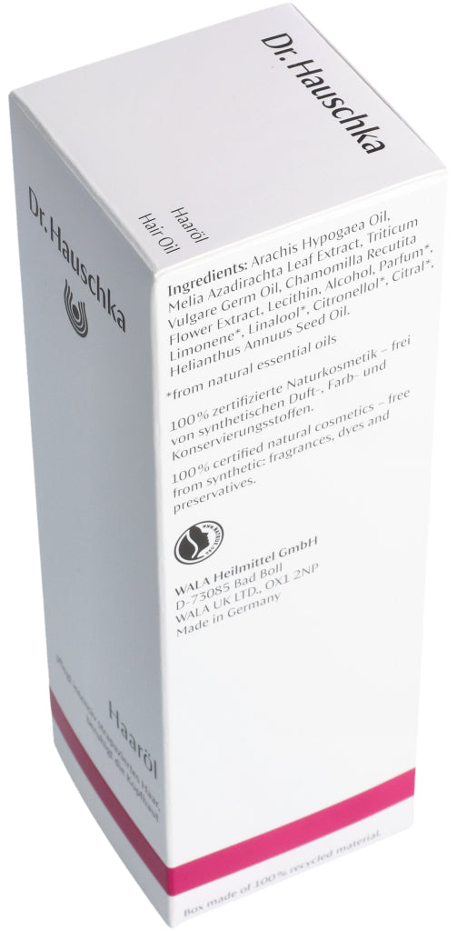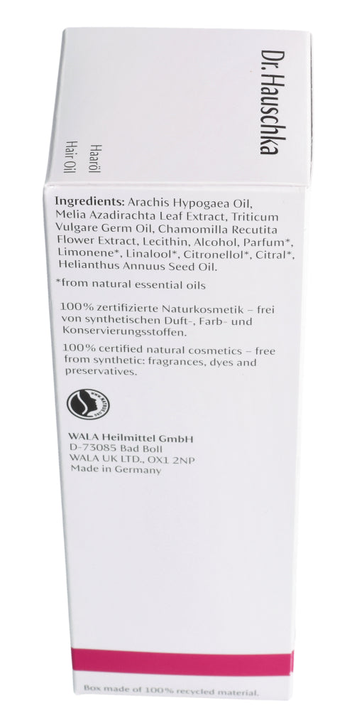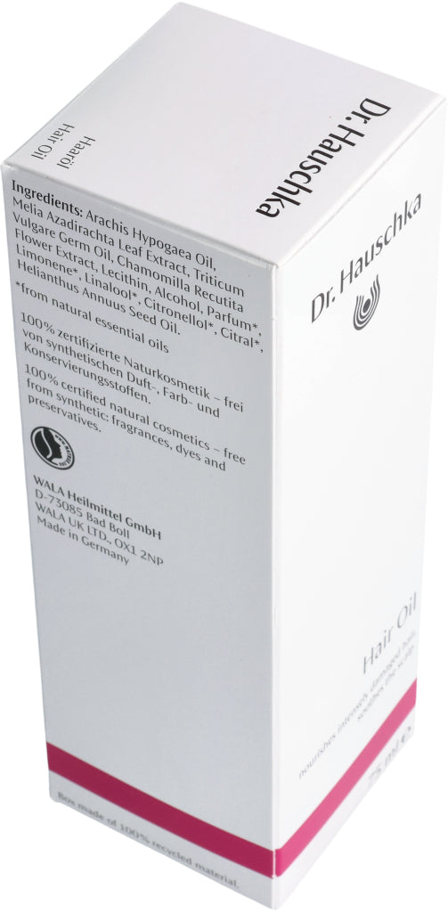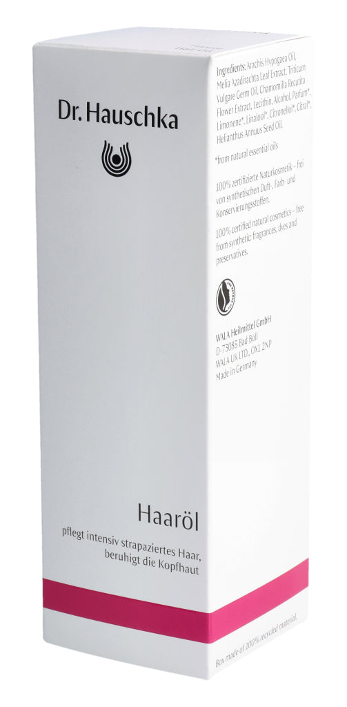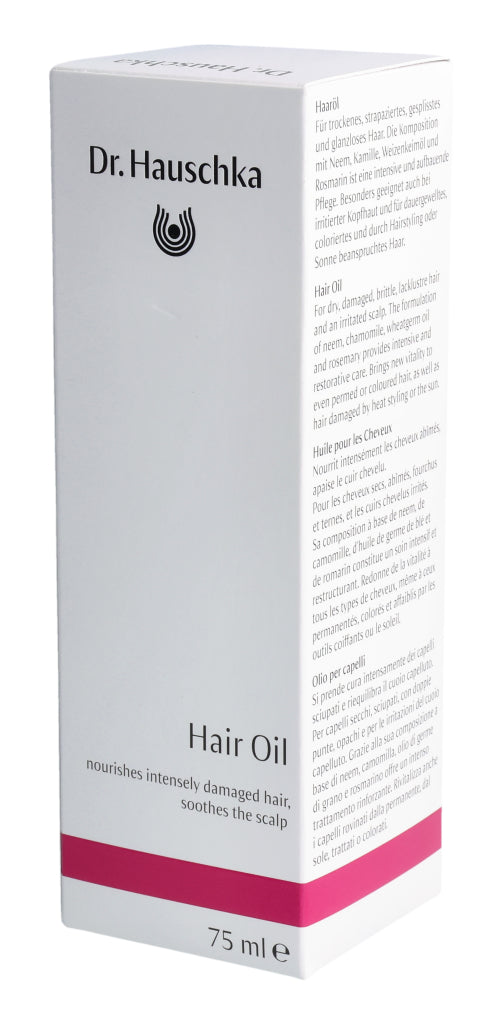 Das Haaröl von Dr. Hauschka hat mit seiner aussergewöhnlichen Zusammensetzung aus Neem, Kamille, Weizenkeimöl und Rosmarin einerseits eine kräftigende Wirkung auf das Haar und andererseits eine beruhigende auf die Kopfhaut.