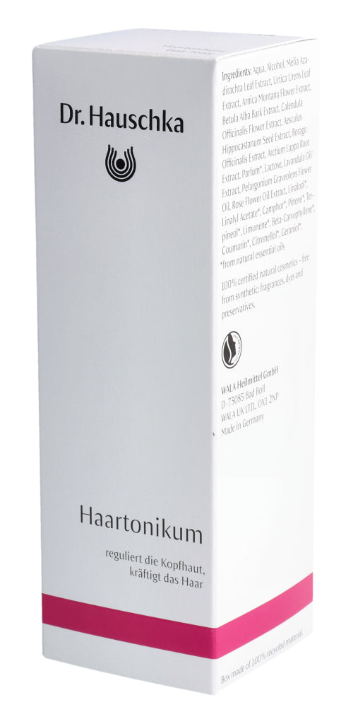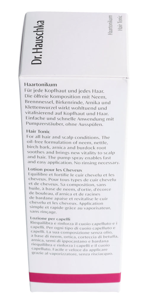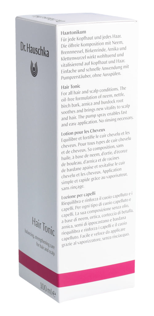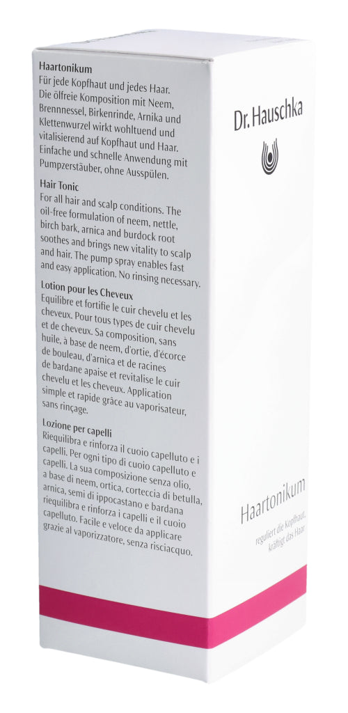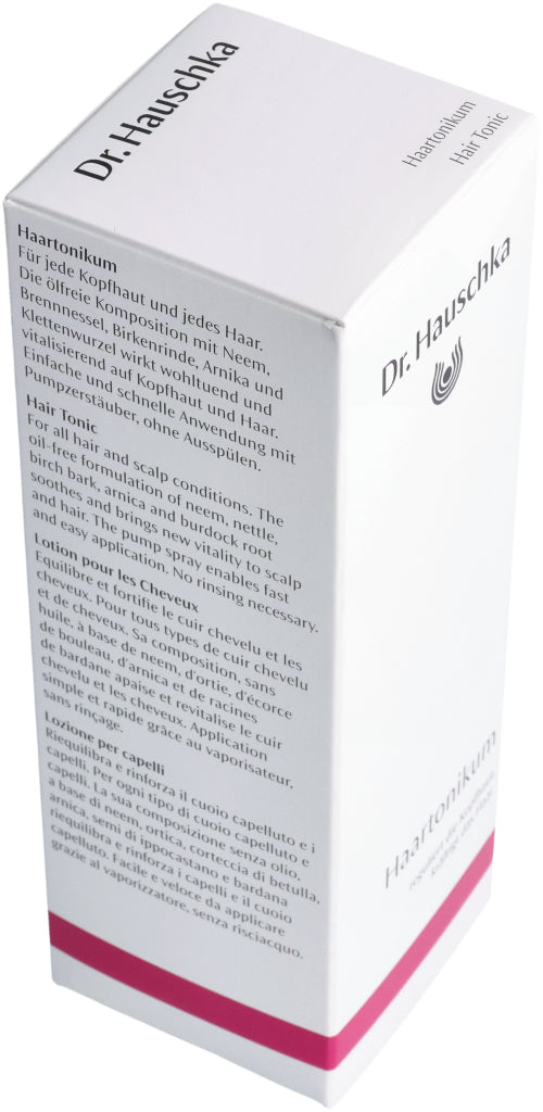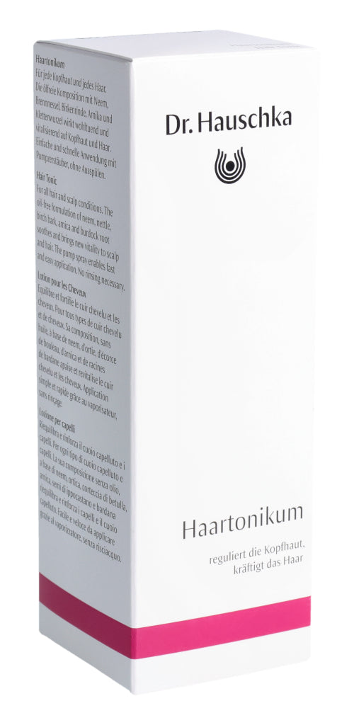 Das Haartonikum von Dr. Hauschka hat mit seiner aussergewöhnlichen Zusammensetzung aus Neem, Brennnessel, Birkenrinde, Arnika und Klettenwurzel eine wohltuende Wirkung auf die unterschiedlichen Kopfhaut- und Haarbedürfnisse. Dank der normalisierenden Wirkung des Haartonikums, kann bei einer zu hohen Fettproduktion eine Schuppenbildung vorgebeugt werden. Bei feinem Haar hingegen verleiht das Tonikum mehr Festigkeit und Fülle.