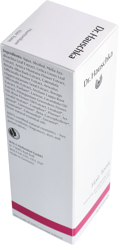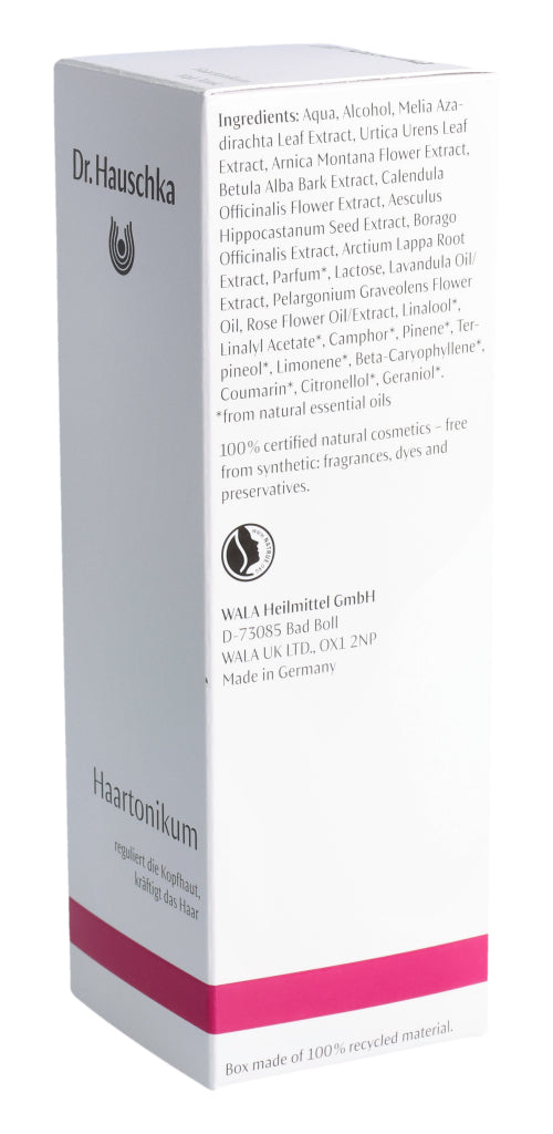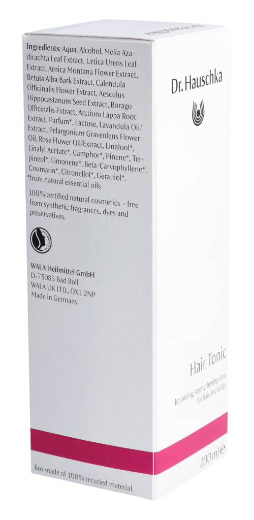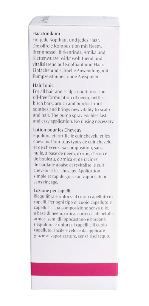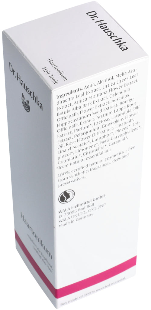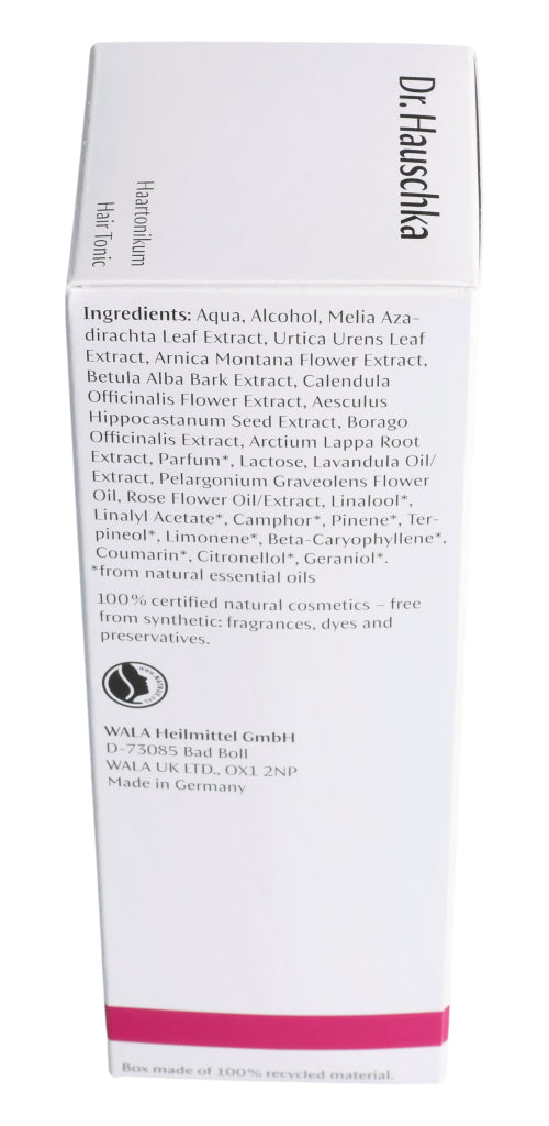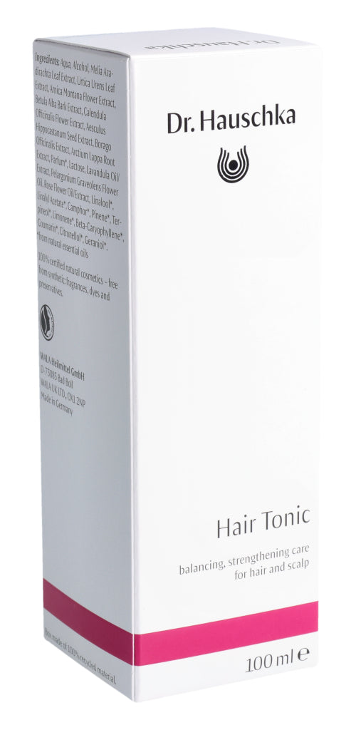 Das Haartonikum von Dr. Hauschka hat mit seiner aussergewöhnlichen Zusammensetzung aus Neem, Brennnessel, Birkenrinde, Arnika und Klettenwurzel eine wohltuende Wirkung auf die unterschiedlichen Kopfhaut- und Haarbedürfnisse. Dank der normalisierenden Wirkung des Haartonikums, kann bei einer zu hohen Fettproduktion eine Schuppenbildung vorgebeugt werden. Bei feinem Haar hingegen verleiht das Tonikum mehr Festigkeit und Fülle.
