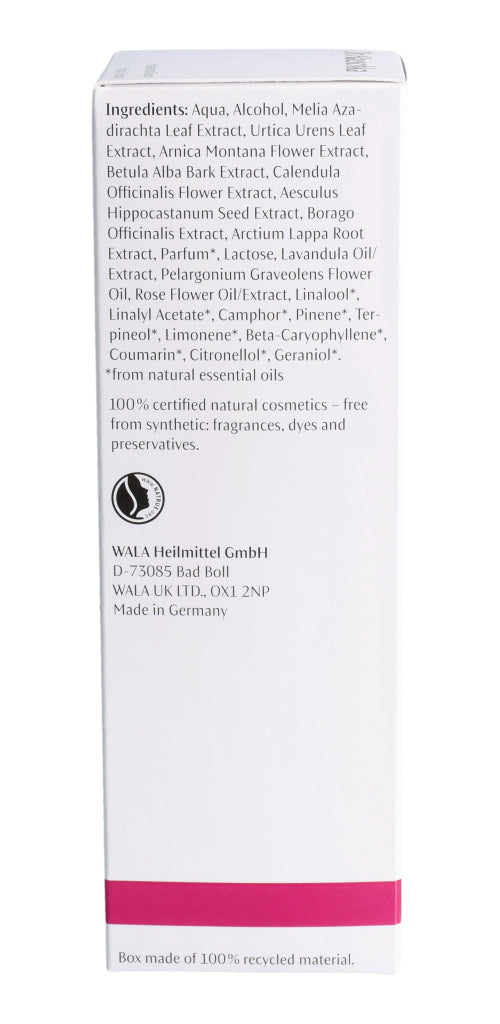 Wasser, Alkohol, Auszüge aus Neemblättern, Brennnesselblättern, Arnikablüten, Birkenrinde, Ringelblume, Rosskastaniensamen, Borretsch und Klettenwurzel, Ätherische Öle, Milchzucker..