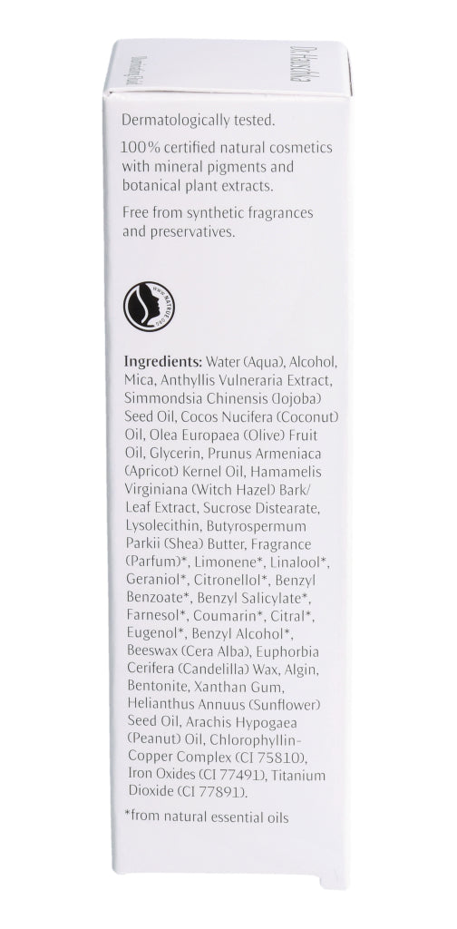 Wasser, Alkohol, Glimmer, Auszug aus Wundklee, Jojobaöl, Kokosöl, Olivenöl, pflanzliches Glycerin, Aprikosenkernöl, Auszug aus Zaubernuss, Zucker-Fettsäureester, Lecithin (hydrolysiert), Sheabutter, Ätherische Öle, Bienenwachs, Candelillawachs, Alginat, Bentonit, Xanthan, Sonnenblumenöl, Erdnussöl, Chlorophyll, Eisenoxid, Titandioxid. *aus natürlichen ätherischen Ölen.