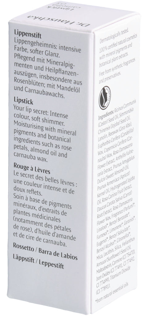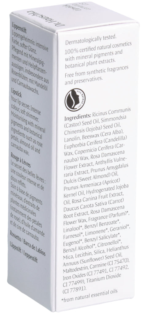 Lippengeheimnis: intensive Farbe, softer Glanz. Pflegend mit Mineralpigmenten und Heilpflanzenauszügen, insbesondere aus Rosenblüten; mit Mandelöl und Carnaubawachs.