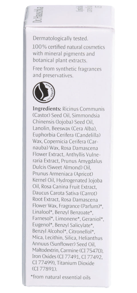 Rizinusöl, Jojobaöl, Glimmer, Wollwachs, Bienenwachs, Candelillawachs, Carnaubawachs, Auszüge aus Rosenblüten und Wundklee, Mandelöl, Aprikosenkernöl, Maltodextrin, Jojobawachs, Auszüge aus Hagebutte und Karotte, Rosenwachs, Ätherische Öle, Lecithin, Sonnenblumenöl, Karmin, Eisenoxide, Titandioxid. *aus natürlichen ätherischen Ölen.