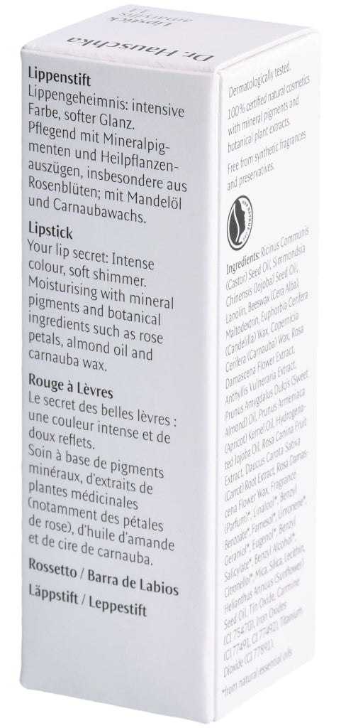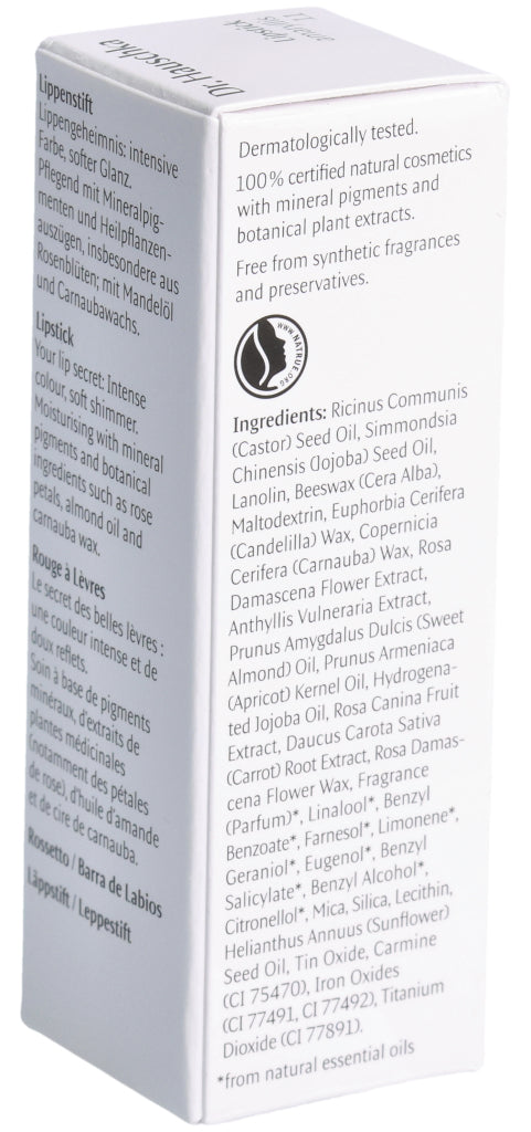Lippengeheimnis: intensive Farbe, softer Glanz. Pflegend mit Mineralpigmenten und Heilpflanzenauszügen, insbesondere aus Rosenblüten; mit Mandelöl und Carnaubawachs.