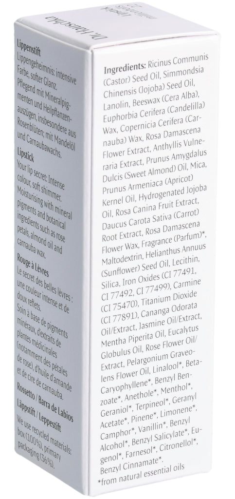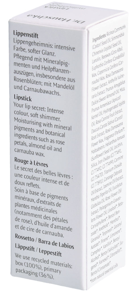 Lippengeheimnis: intensive Farbe, softer Glanz. Pflegend mit Mineralpigmenten und Heilpflanzenauszügen, insbesondere aus Rosenblüten; mit Mandelöl und Carnaubawachs.