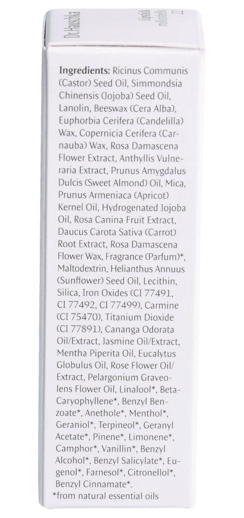 Rizinusöl, Jojobaöl, Glimmer, Wollwachs, Bienenwachs, Candelillawachs, Carnaubawachs, Auszüge aus Rosenblüten und Wundklee, Mandelöl, Aprikosenkernöl, Maltodextrin, Jojobawachs, Auszüge aus Hagebutte und Karotte, Rosenwachs, Ätherische Öle, Lecithin, Sonnenblumenöl, Karmin, Eisenoxide, Titandioxid. *aus natürlichen ätherischen Ölen.