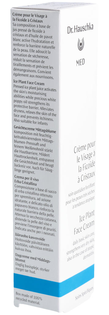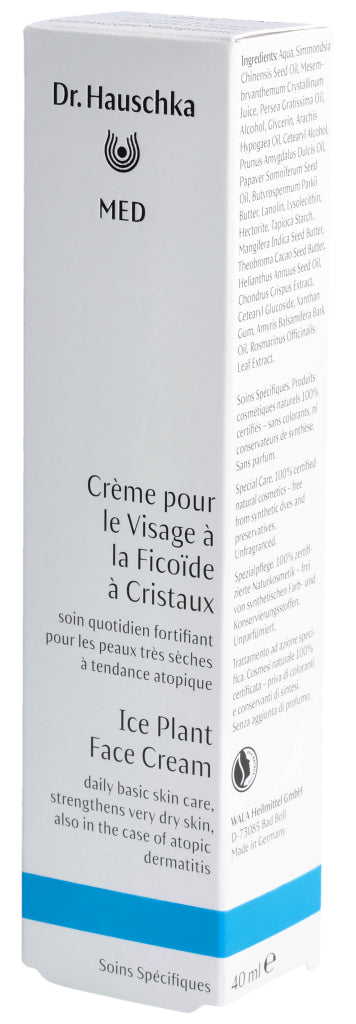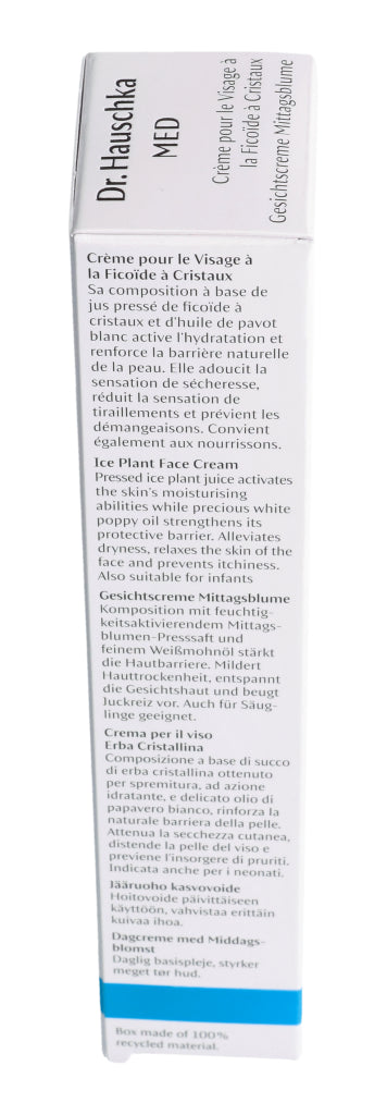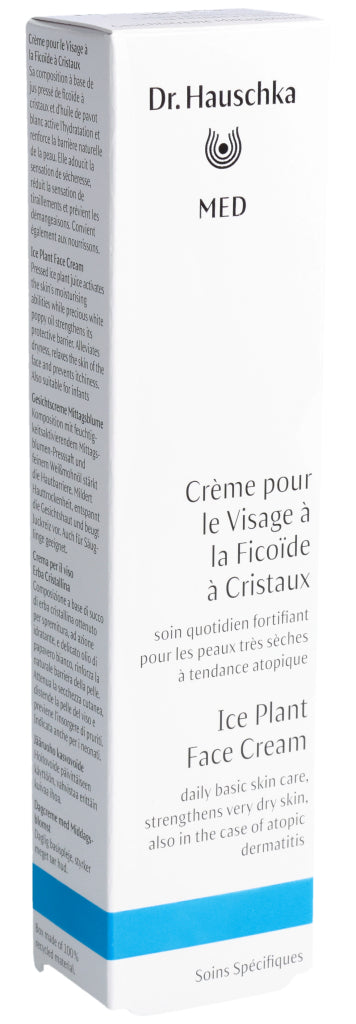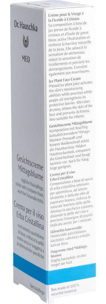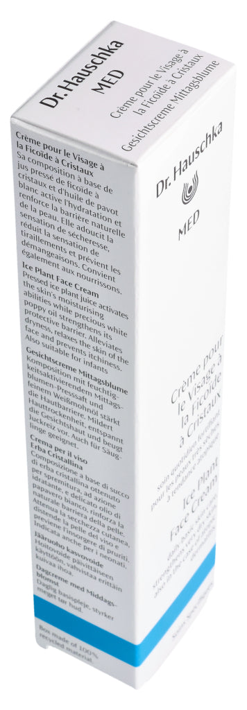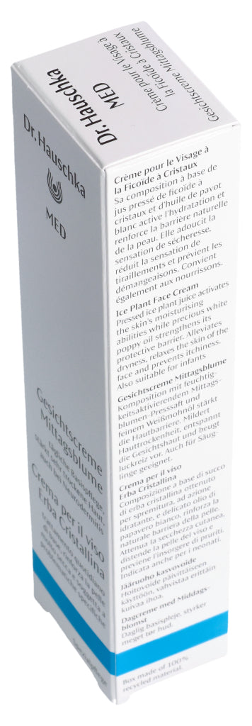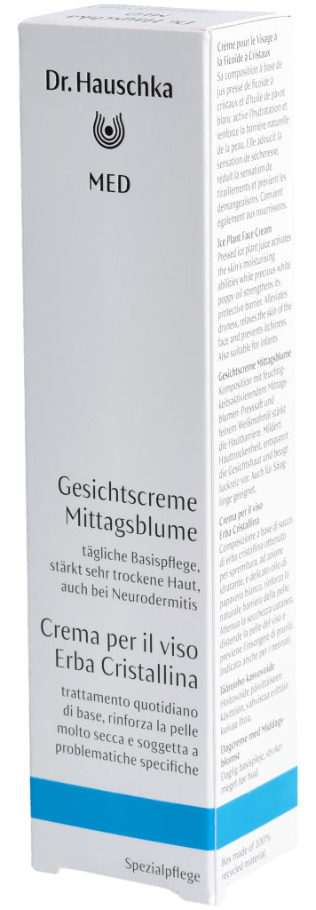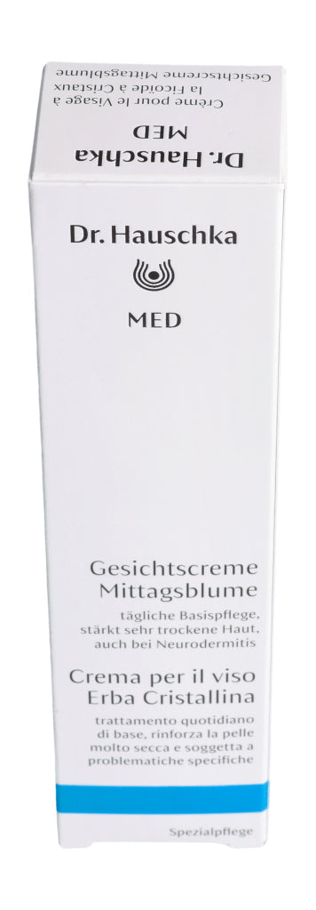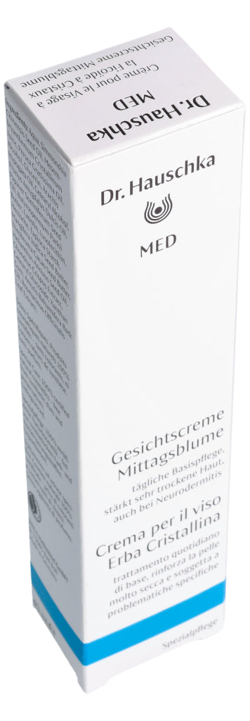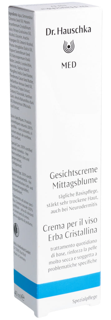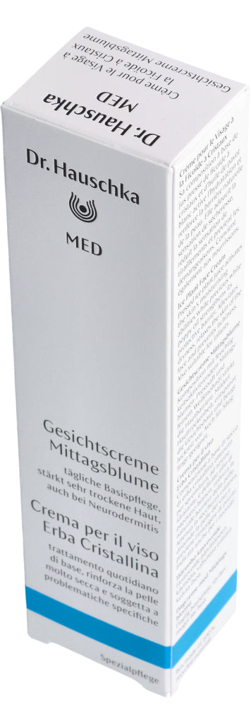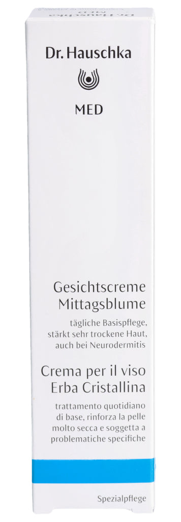 Die Dr. Hauschka Med Gesichtscreme Mittagsblume ist eine Basispflege für das Gesicht. Sie reduziert das Spannungsgefühl, beruhigt trockene, juckende Haut und versorgt sie mit langanhaltender Feuchtigkeit. Dabei wird die Hautbarriere gestärkt und widerstandsfähiger. Dank der guten Verträglichkeit kann die Gesichtscreme auch bei zu Neurodermitis neigender Haut verwendet werden. Die Mittagsblume ist mit dem pflanzlichen Öl des Weissmohns kombiniert. Diese Kombination fühlt sich weich auf der Haut an und zieht sofort ein, ohne einen Fettfilm zu hinterlassen. Die Dr. Hauschka Med Gesichtscreme mit Mittagsblume kann auch sehr gut als Make-up Grundlage aufgetragen werden.