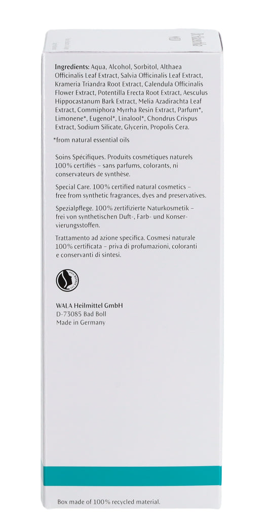 Wasser, Alkohol, Sorbit, Auszüge aus Eibischblättern, Salbei, Ratanhia, Ringelblume, Tormentill, Rosskastanienrinde, Neemblättern und Myrrhe, Ätherische Öle, Natrium-Magnesium-Silikat, Glycerin, Propolis..