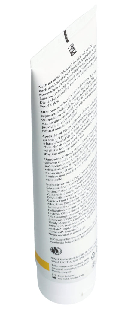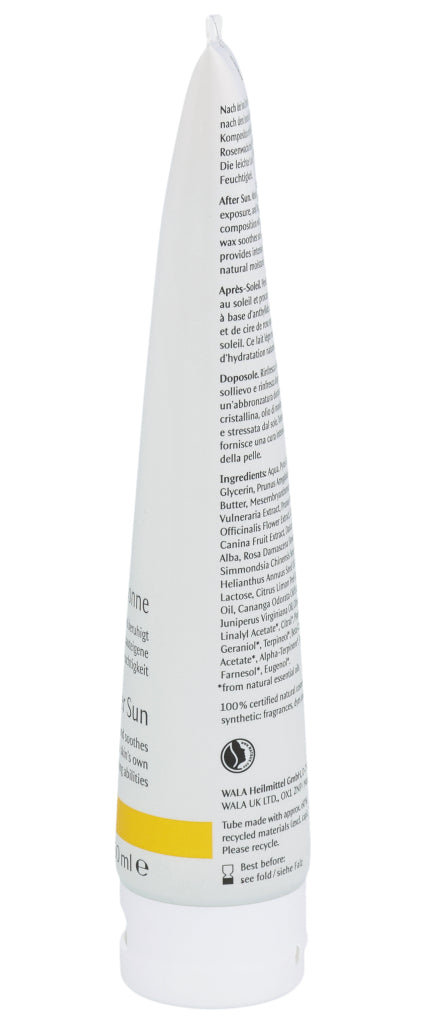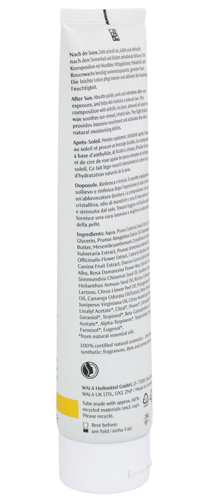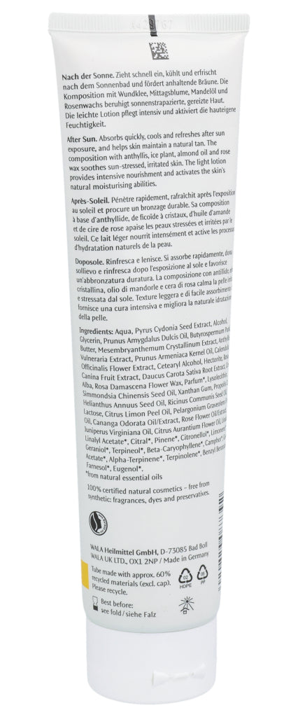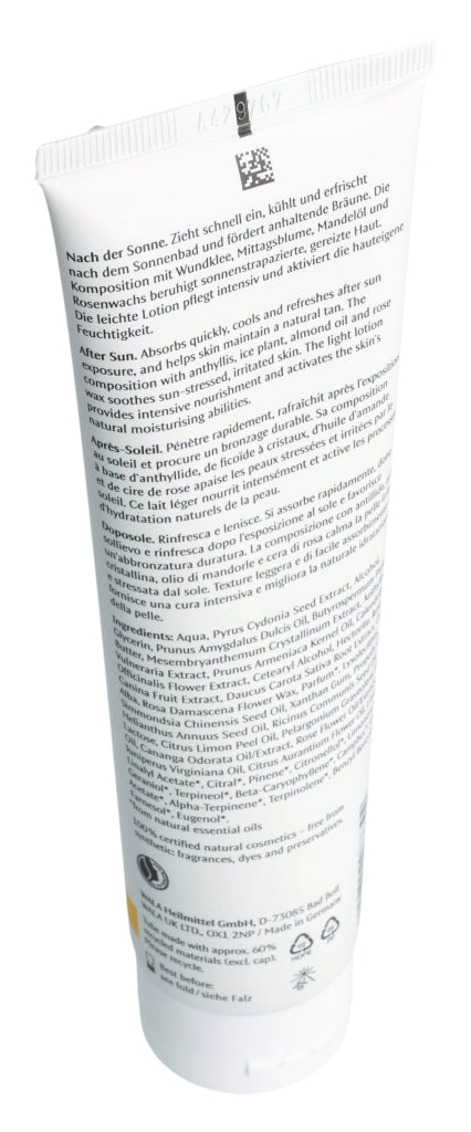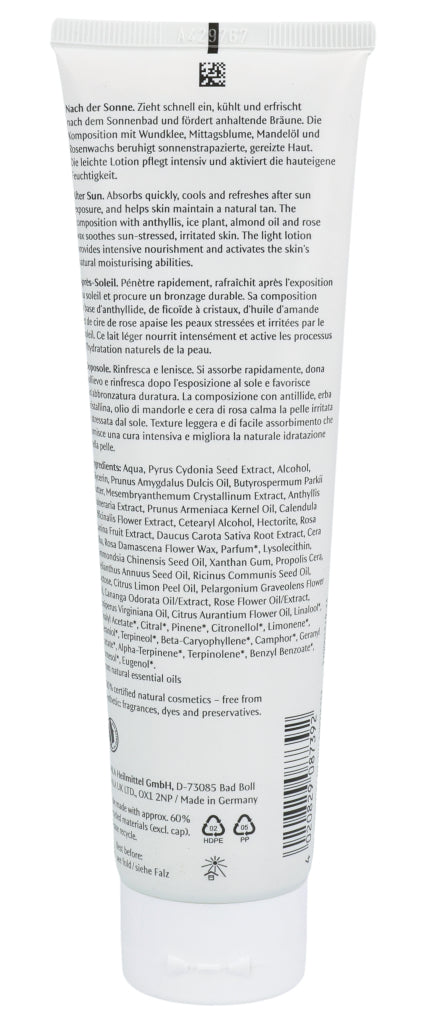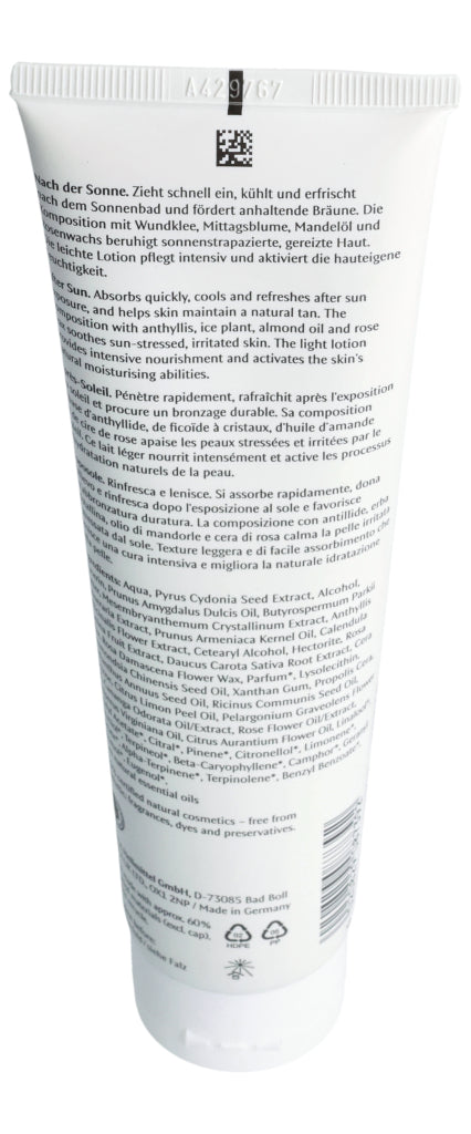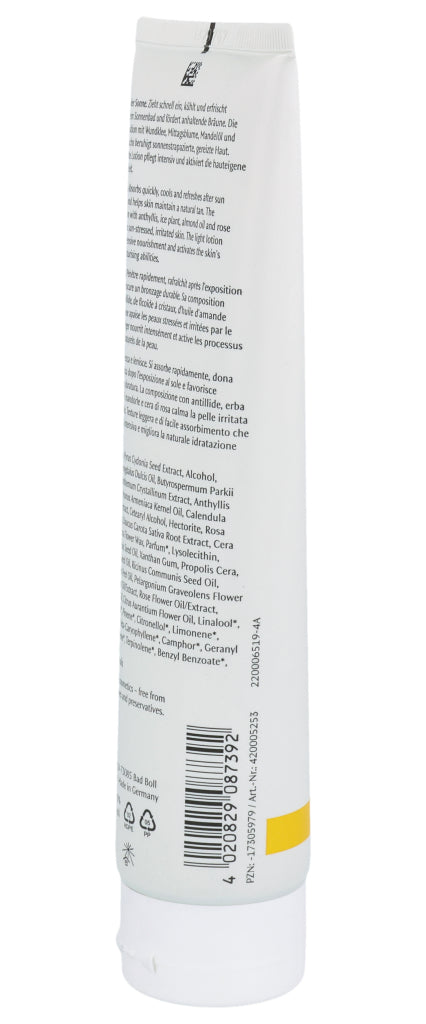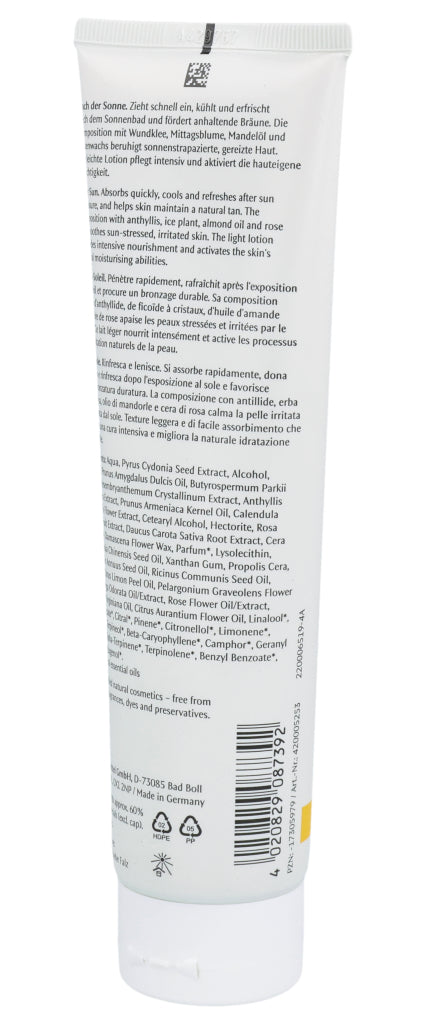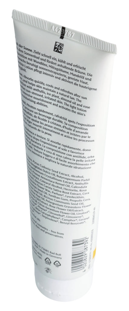 Nach einem Tag in der Sonne kann die Haut trotz Sonnenschutz leicht gereizt und erhitzt sein, sie wirkt trockener als sonst. Eine reichhaltige und kühlende Pflege unterstützt sie darin, sich von dem Sonnentag zu erholen. Die Bräune bleibt so länger erhalten. Die Lotion mit der angenehmen Konsistenz erfrischt und entspannt empfindliche Haut nach dem Sonnenbad. Ringelblume und Wundklee beruhigen sonnenstrapazierte Haut. Mandelöl, Sheabutter und Rosenwachs pflegen intensiv und helfen der Haut, Feuchtigkeit zu bewahren.