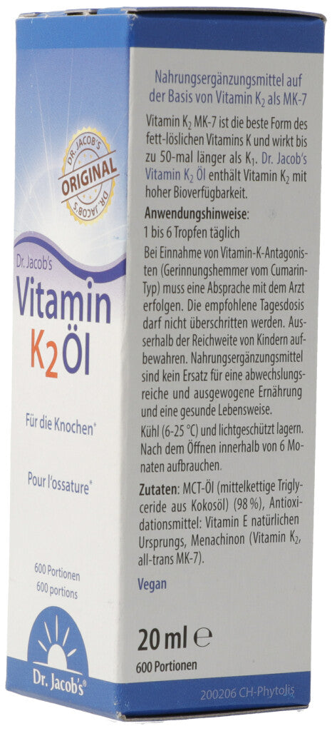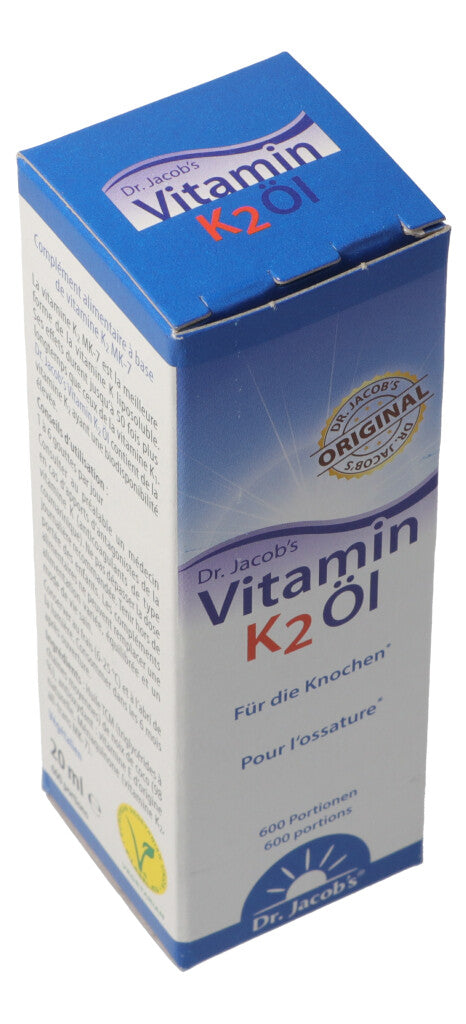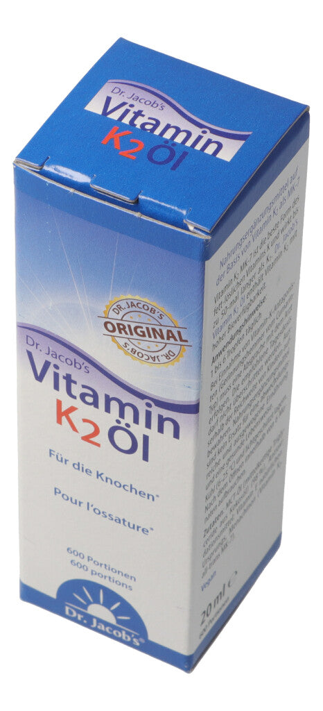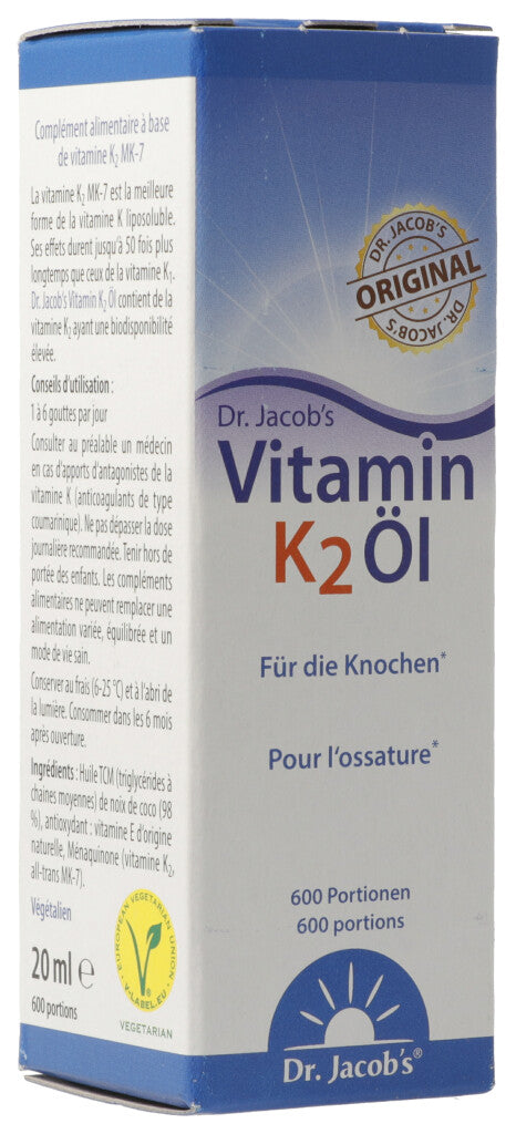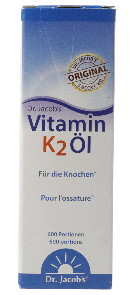 *Vitamin K trägt zur Erhaltung normaler Knochen bei, indem es Osteocalcin, ein zentrales Protein im Knochenstoffwechsel, aktiviert, sodass Calcium effektiv in die Knochen eingebaut werden kann. Da Vitamin D3 die Bildung von Osteocalcin anregt und damit ebenfalls zur Erhaltung normaler Knochen beiträgt, ist die kombinierte Aufnahme von D3 und K2, wie in Dr. Jacob’s Vitamin D3K2 Öl, besonders empfehlenswert.