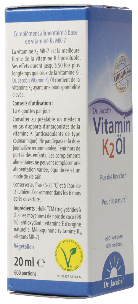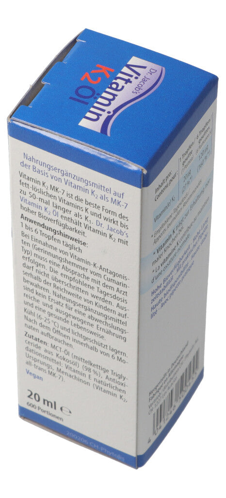 Dr. Jacob’s Vitamin-Öle sind leicht dosierbar, kinderfreundlich und auch ideal bei Schluckbeschwerden. Mit 640 Tropfen pro Flasche ist es zudem sehr ergiebig. Ein Tropfen enthält 20 μg Vitamin K2 (all-trans MK-7).