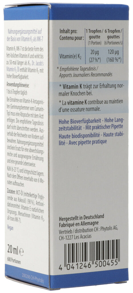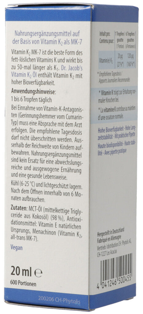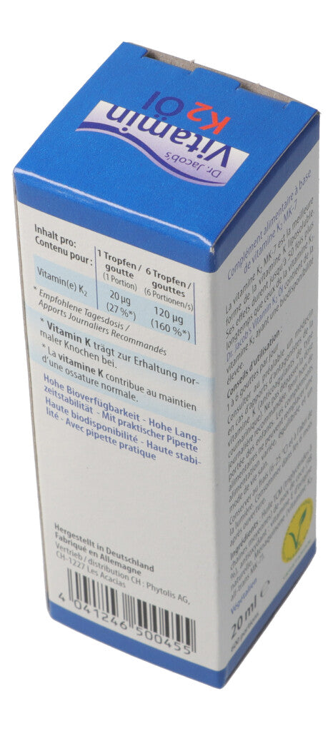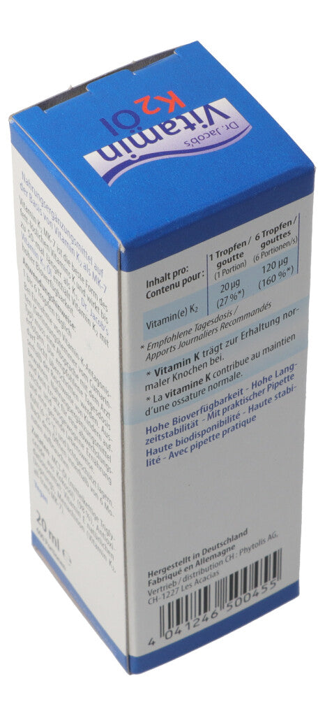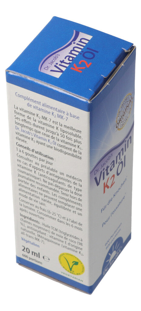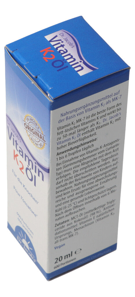 Vitamin K2 MK-7 ist die beste Form des fettlöslichen Vitamins K und wirkt bis zu 50-mal länger als K1. Dr. Jacob’s Vitamin K2 Öl enthält Vitamin K2 mit hoher Bioverfügbarkeit.