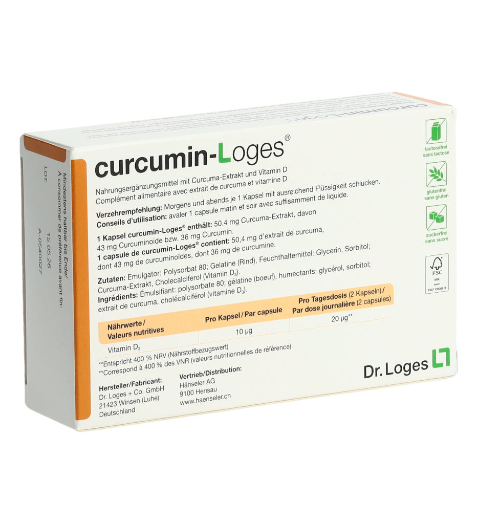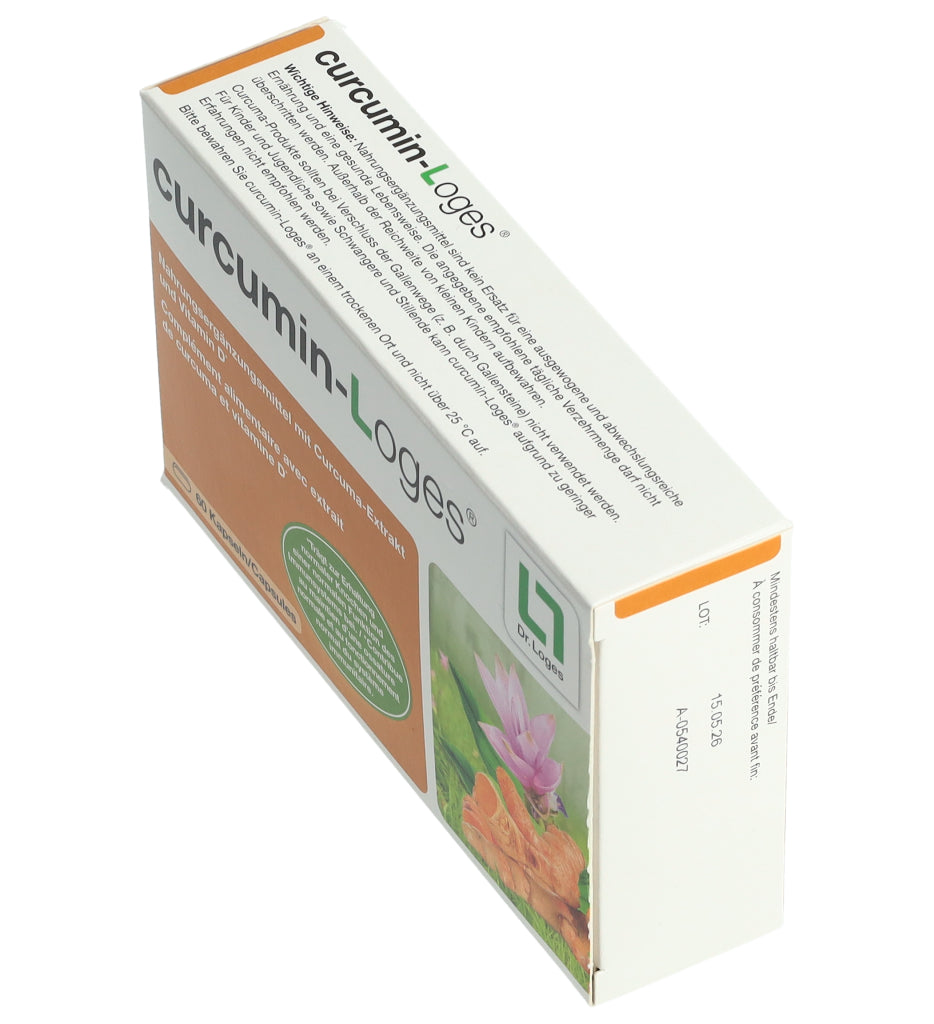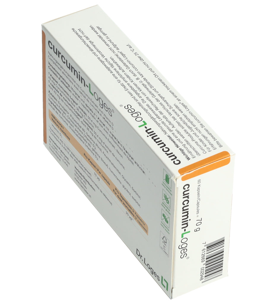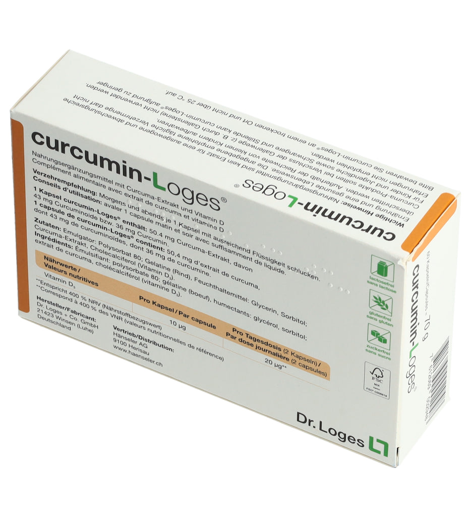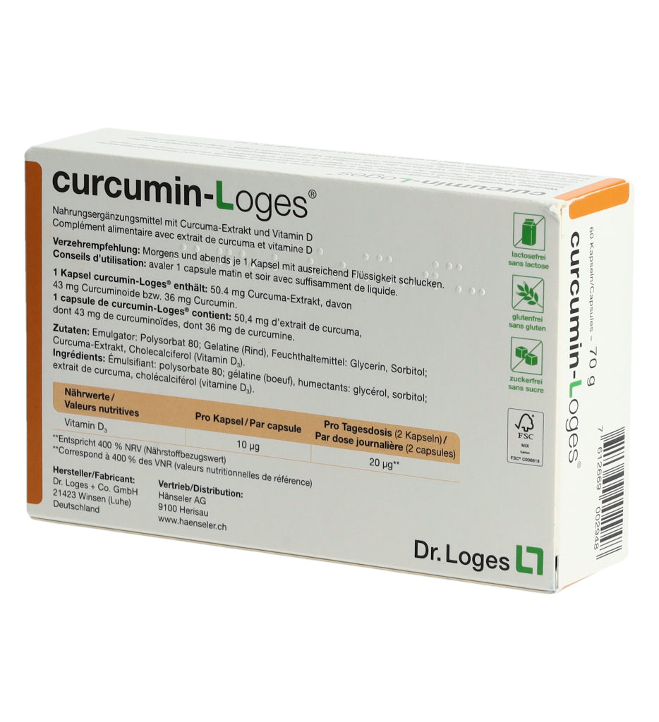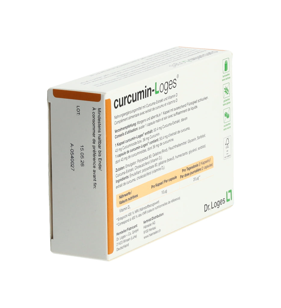 curcumin-Loges ist ein Nahrungsergänzungsmittel mit Curcuma-Extrakt und Vitamin D. Eine Kapsel enthält 50.4 mg Curcuma-Extrakt, davon 43 mg Curcuminoide bzw. 36 mg Curcumin. Morgens und abends je 1 Kapsel mit ausreichend Flüssigkeit schlucken.