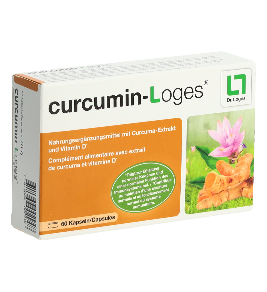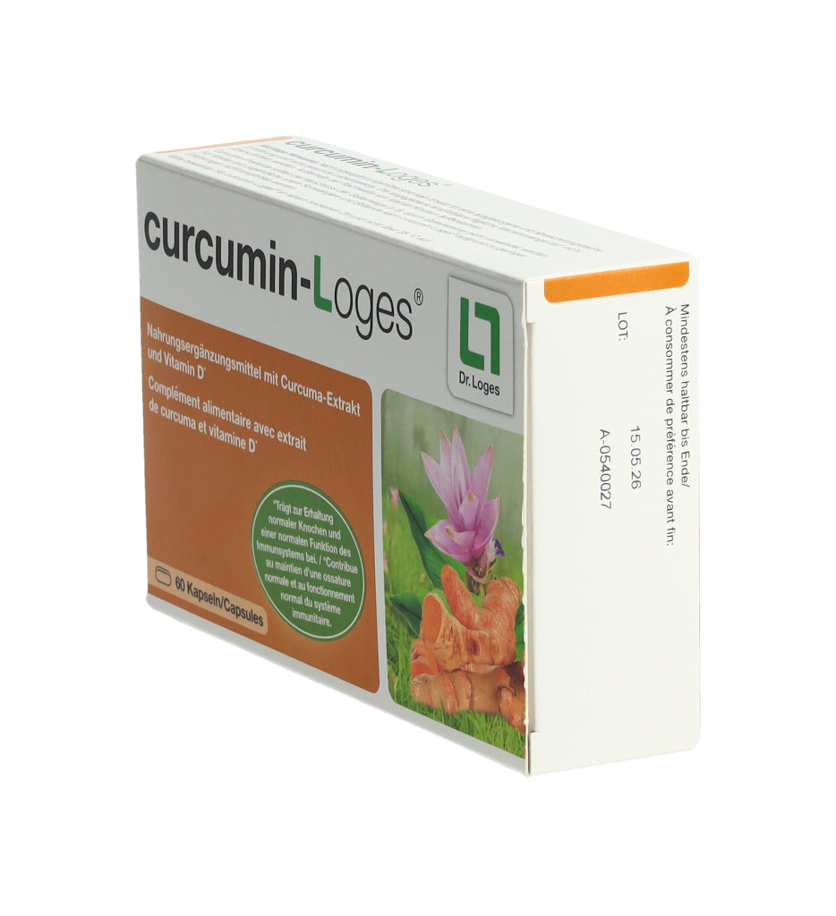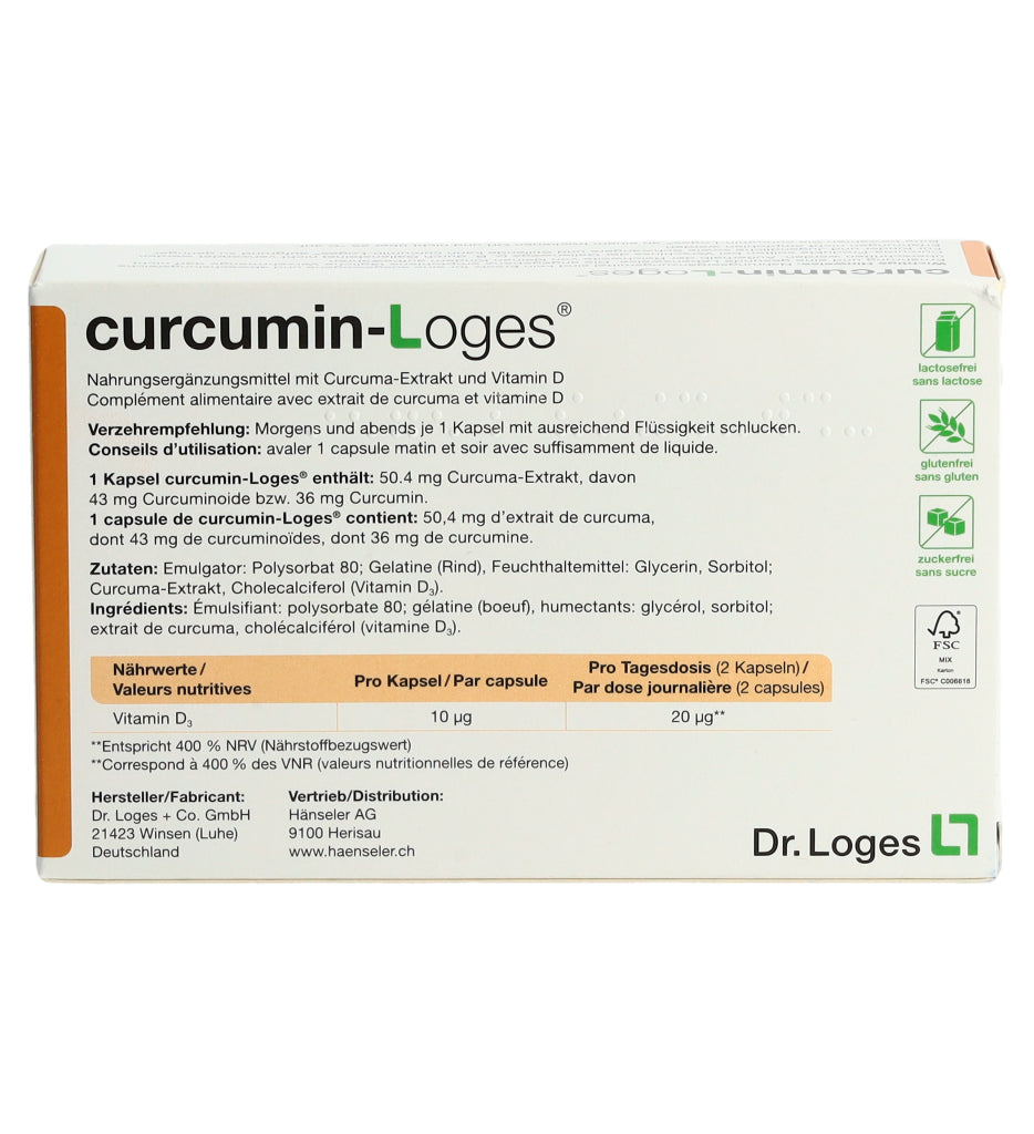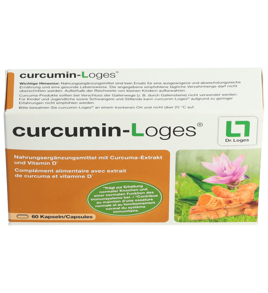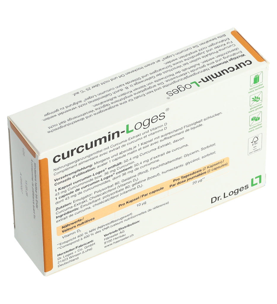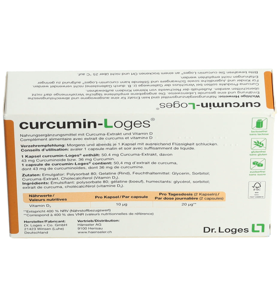 curcumin-Loges ist ein Nahrungsergänzungsmittel mit Curcuma-Extrakt und Vitamin D. Eine Kapsel enthält 50.4 mg Curcuma-Extrakt, davon 43 mg Curcuminoide bzw. 36 mg Curcumin. Morgens und abends je 1 Kapsel mit ausreichend Flüssigkeit schlucken.