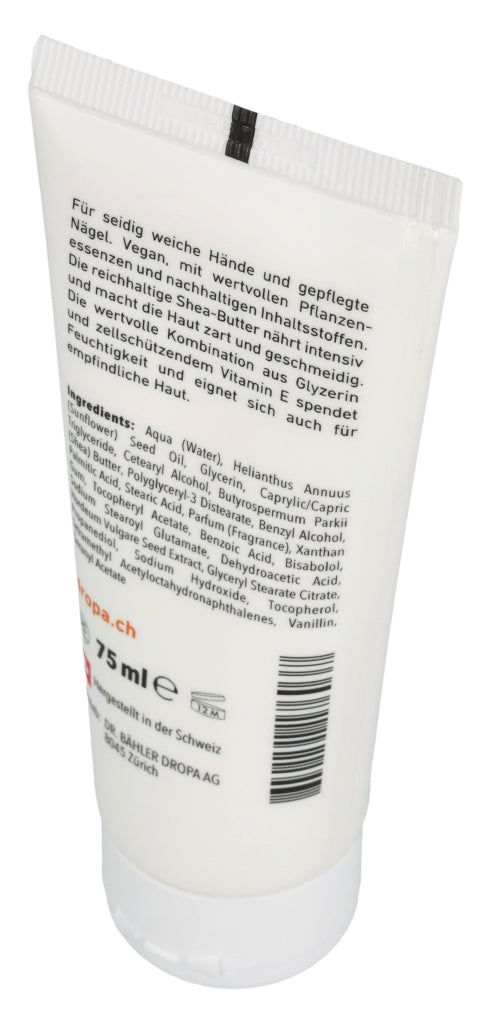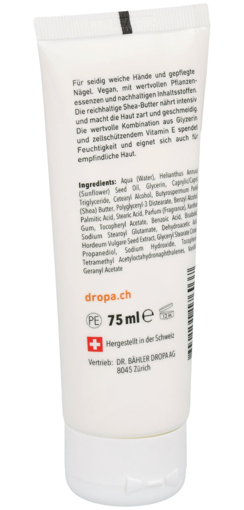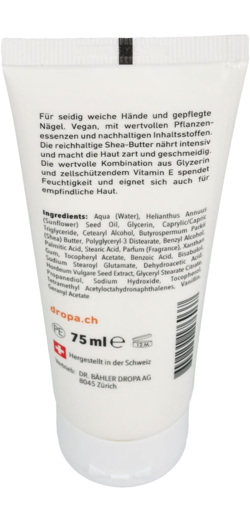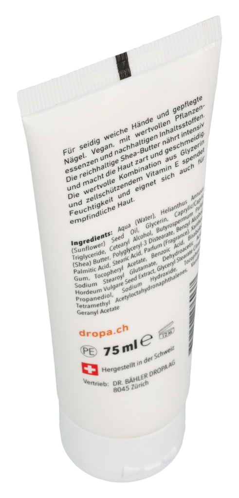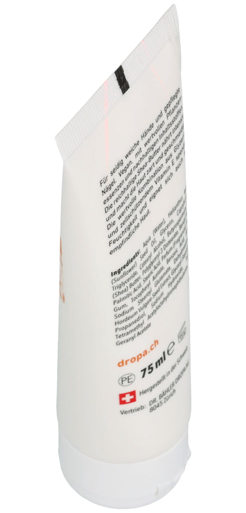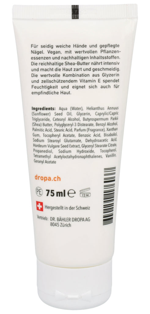 Die zart duftende DROPA Handcreme pflegt stark beanspruchte Hände mit rissiger und aufgesprungener Haut. Vegan, mit wertvollen Pflanzenessenzen und nachhaltigen Inhaltsstoffen. Die reichhaltige Shea-Butter nährt intensiv und macht die Haut zart und geschmeidig. Die wertvolle Kombination aus Glyzerin und zellschützendem Vitamin E spendet Feuchtigkeit und eignet sich auch für empfindliche Haut.