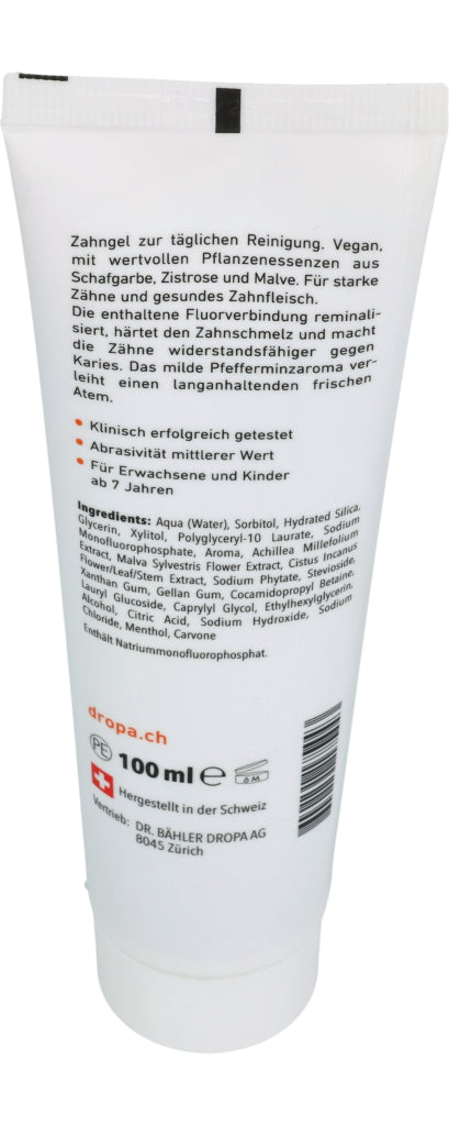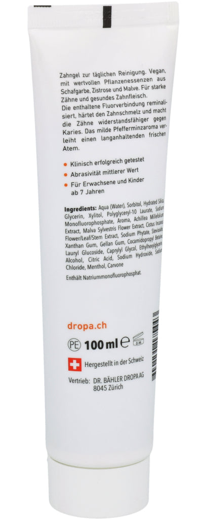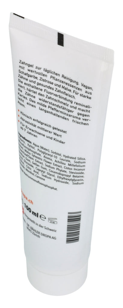Das DROPA Zahngel für die tägliche Zahnreinigung schützt dank der enthaltenen Fluorverbindung gegen Karies. Die vegane Zusammensetzung mit wertvollen Pflanzenessenzen aus Schafgarbe, Zistrose und Malve angereichert, pflegt sanft Zähne und Zahnfleisch. Das milde Pfefferminzaroma verleiht einen langanhaltenden frischen Atem. Enthält Natriummonofluorophosphat.