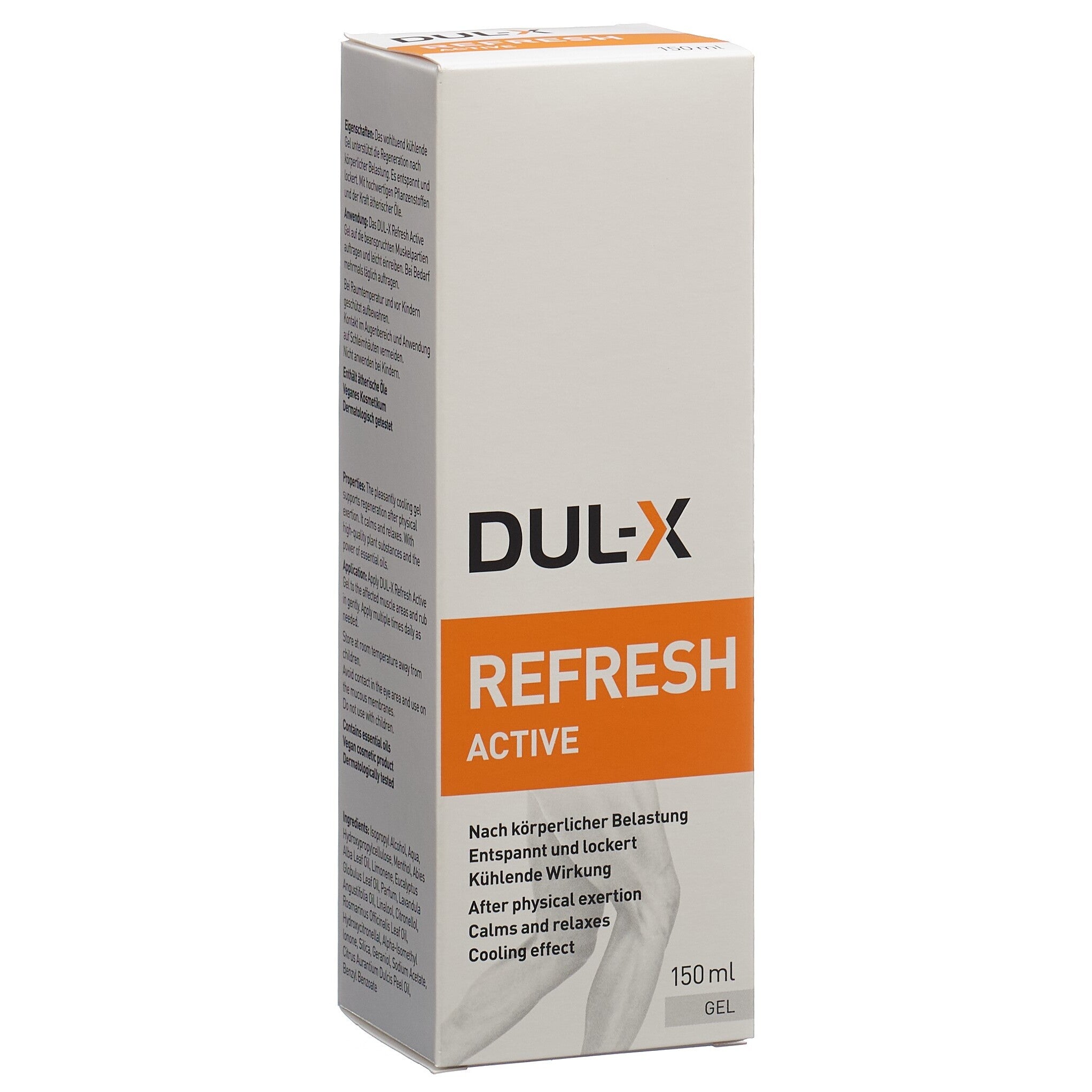 Eigenschaften: Das wohltuend kühlende Gel unterstützt die Regeneration nach körperlicher Belastung. Es entspannt und lockert. Mit hochwertigen Pflanzenstoffen und der Kraft ätherischer Öle. Anwendung: Das DUL-X Refresh Active Gel auf die beanspruchten Muskelpartien auftragen und leicht einreiben. Bei Bedarf mehrmals täglich auftragen.