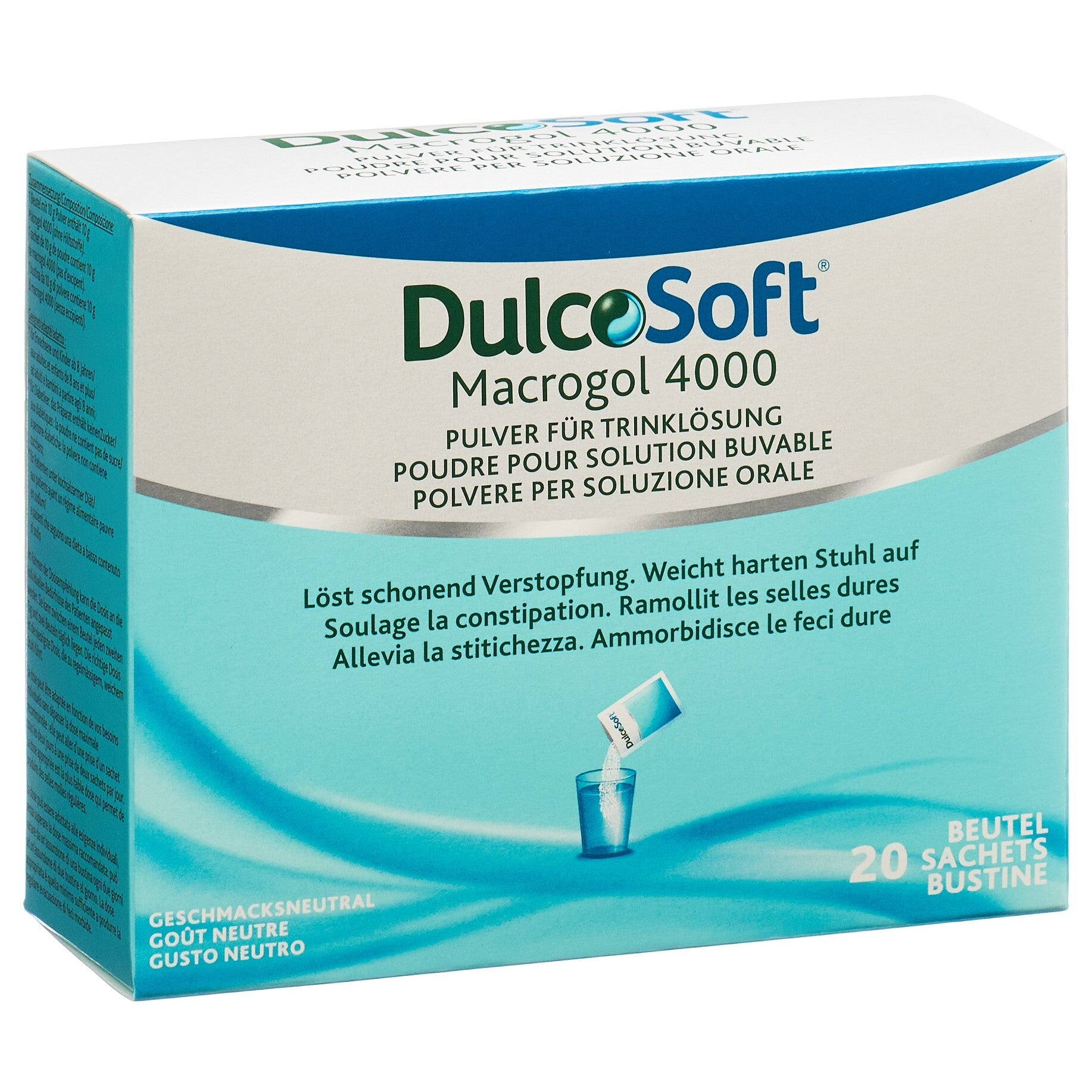 Das Dulcosoft Macrogol 4000 Pulver löst sanft Verstopfungen und weicht harten Stuhl auf. Die Trinklösung funktioniert ähnlich wie ein Schwamm, das getrunkene Wasser wird aufgenommen und gezielt in den Darm transportiert. Dadurch wird der Stuhl aufgeweicht und gewinnt an Volumen. Das Pulver ist geschmacksneutral und kann mit einem Getränk nach Wahl verdünnt werden. Für einen weichen Stuhl nach zirka 24-72 Stunden.