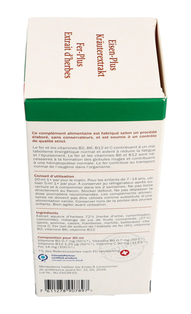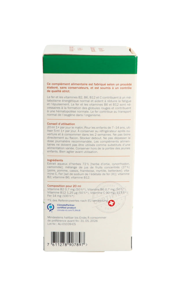 Wässriger Kräuterauszug 72% [Brennnesselkraut, Hagebutte, Kamille]; Mischung aus Fruchtsaftkonzentraten (27%) [Birne, Apfel, schwarze Johannisbeere, Himbeer, Heidelbeer, Rande]; Vitamin C; Eisen (Eisen(III)-Natrium-EDTA); Vitamin B2; Vitamin B6; Vitamin B12..