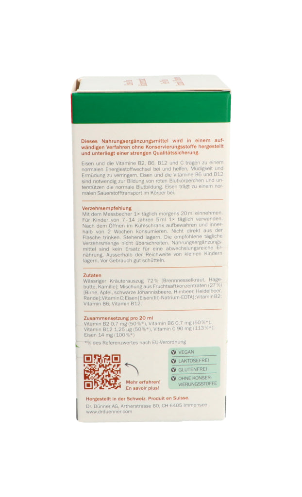 Eisen unterstützt den Energiestoffwechsel und trägt zur Verringerung von Müdigkeit und Ermüdung bei. Mit Hagebutte, Brennnessel, Kamille, Vitamin C und B-Vitaminen.