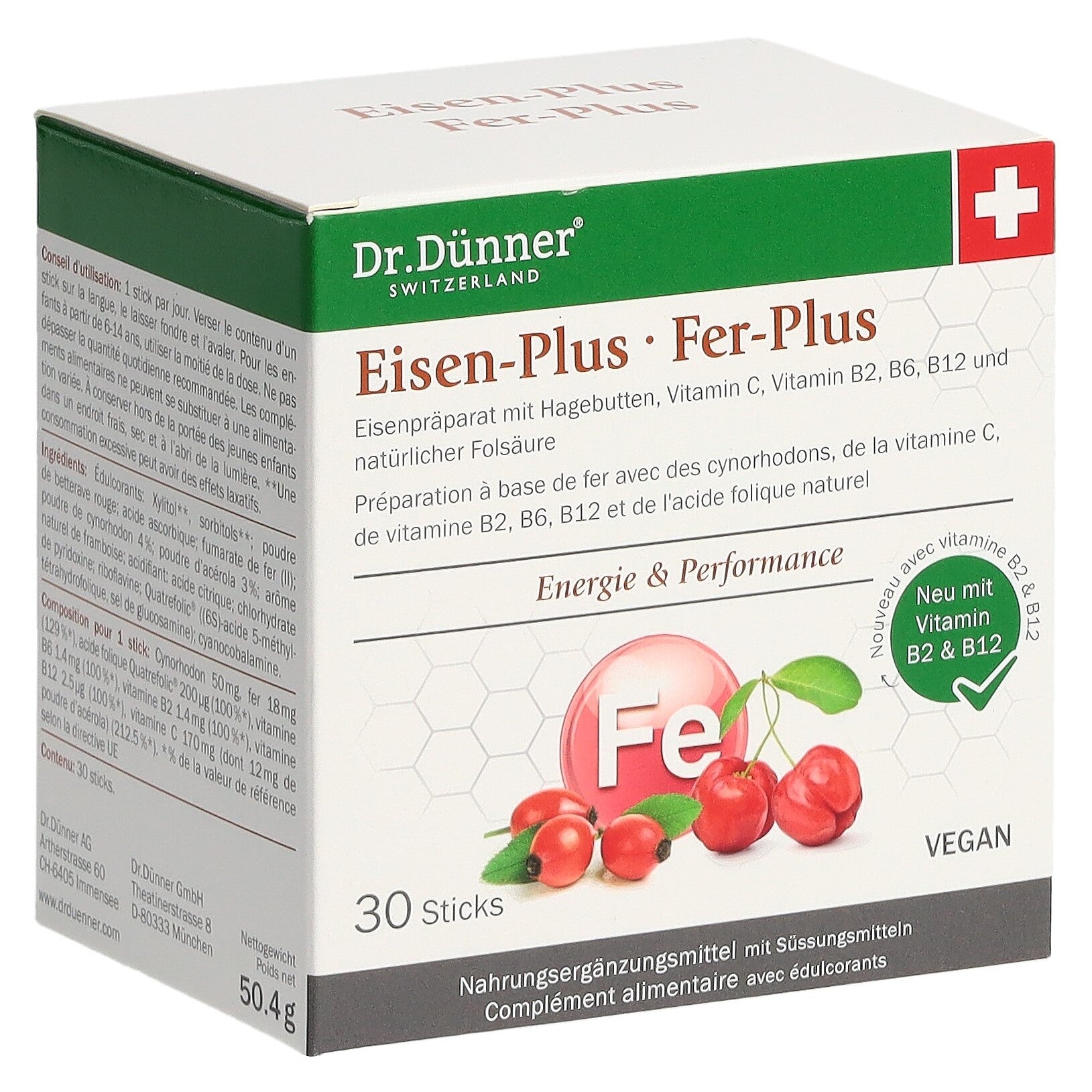 Eisen, Folsäure und die Vitamine B2, B6, B12 und C tragen zu einem normalen Energiestoffwechsel bei und helfen, Müdigkeit und Ermüdung zu verringern. Eisen und die Vitamine B6 und B12 sind notwendig zur Bildung von roten Blutkörperchen und unterstützen die normale Blutbildung. Eisen trägt zu einem normalen Sauerstofftransport im Körper bei. Vitamin C erhöht die Eisenaufnahme. Die Sticks enthalten zudem Hagebutten und haben einen angenehmen Himbeergeschmack ganz ohne Zucker. Eine effiziente und einzigartige Formulierung macht unsere Eisen Plus Sticks zu etwas ganz Besonderem.