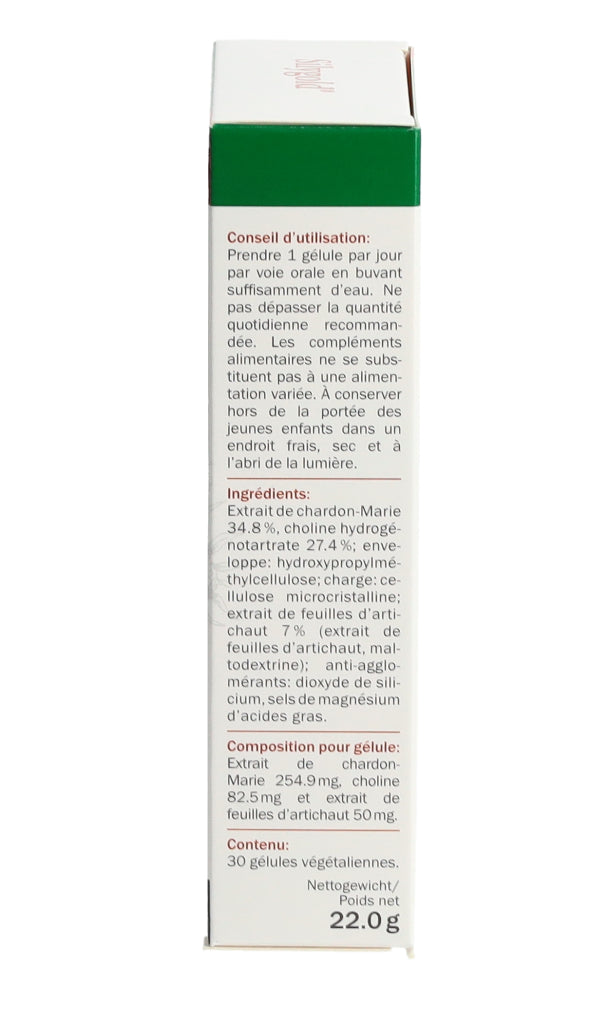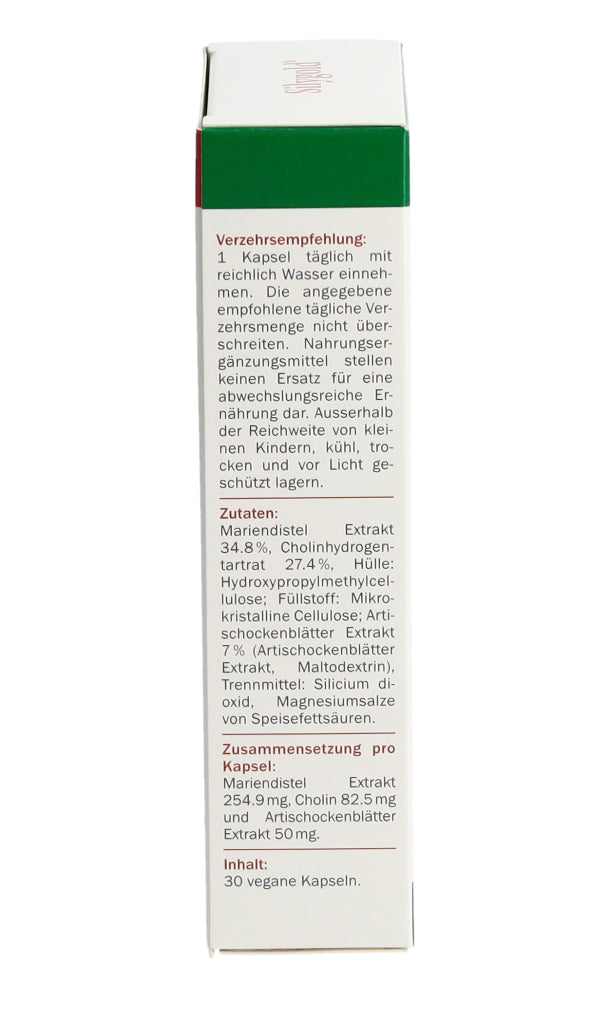 Mariendistel Extrakt 34.8%, Cholinhydrogentartrat 27.4 %, Hülle: Hydroxypropylmethylcellulose; Füllstoff: Mikrokristalline Cellulose; Artischockenblatter Extrakt 7% (Artischockenblatter Extrakt, Maltodextrin), Trennmittel: Silicium dioxid, Magnesiumsalze von Speisefettsauren. Pro Kapsel: Mariendistel Extrakt 254.9mg Cholin 82.5mg Artischockenblätter Extrakt 50mg.
