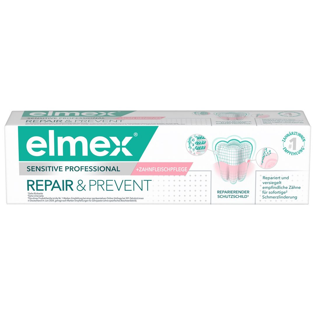 elmex Sensitive Professional Repair & Prevent Zahnpasta mit Pro-Argin Formel lindert und beugt neuen Schmerzen vor – sofort und anhaltend.