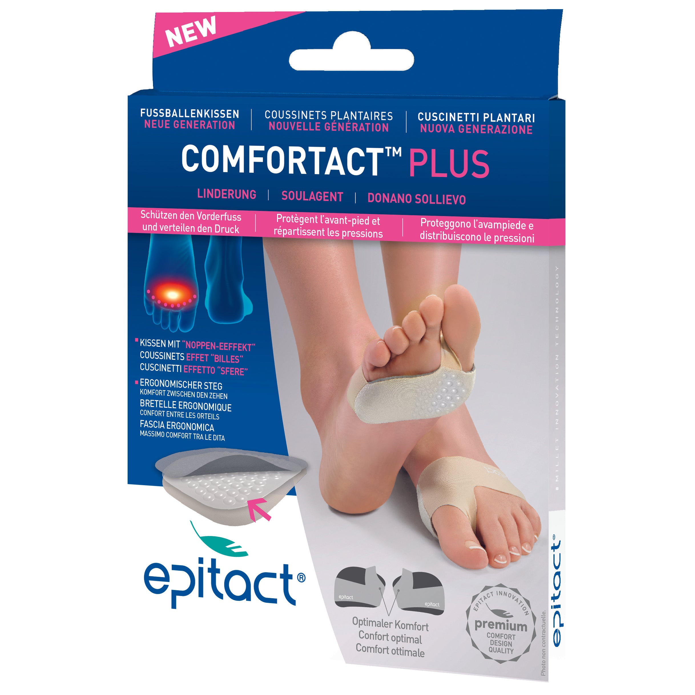 Entscheiden Sie sich für die Schutzpolster New Generation COMFORTACT™ PLUS von EPITACT® mit Perlenwirkung bei hohen Belastungen der Füsse und schaffen Sie dem schmerzhaften Fussballen Schmerzentlastung und besseren Laufkomfort.