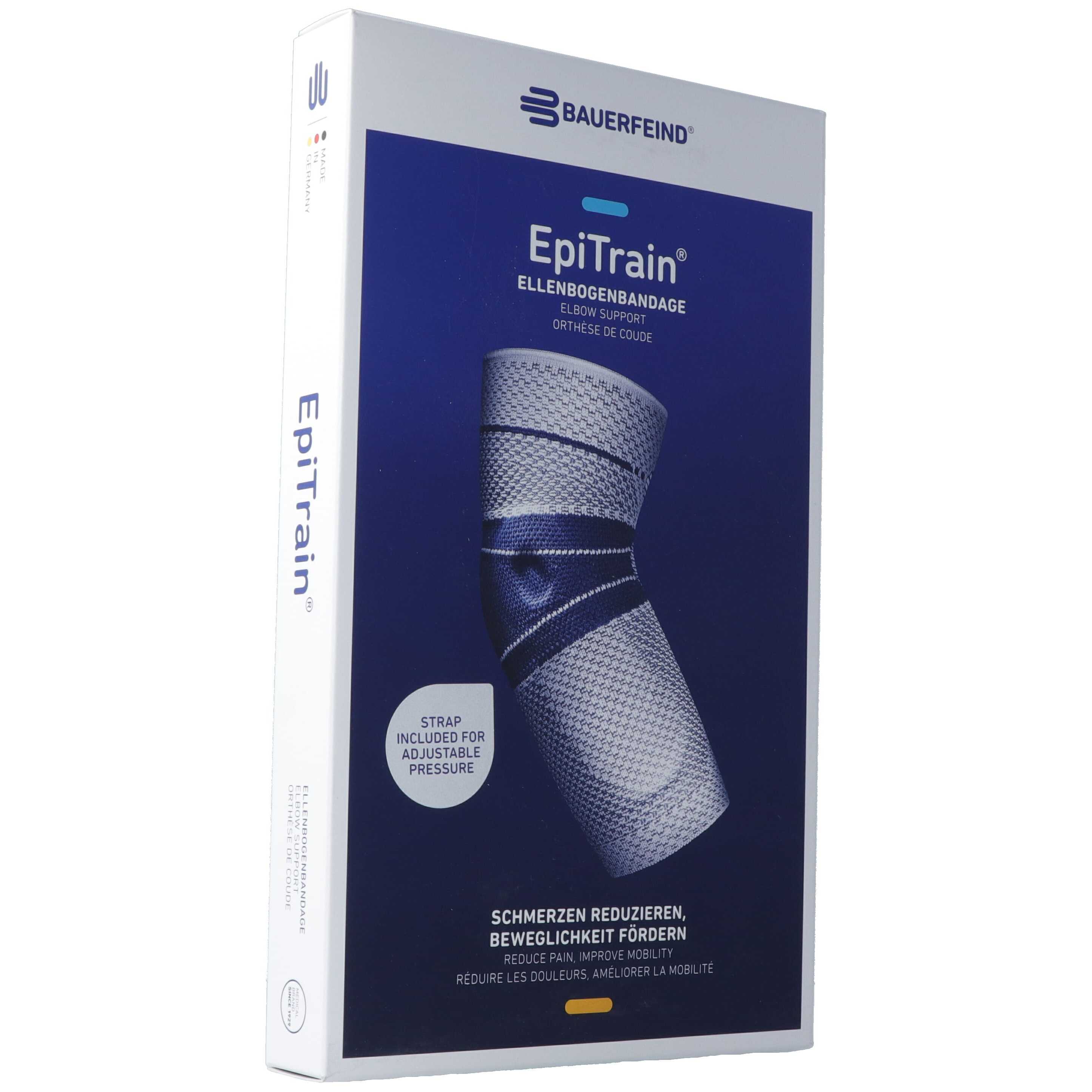 EpiTrain lindert Schmerzen im Ellenbogen und verbessert seine Beweglichkeit. Das wirkungsvolle Gestrick und speziell geformte Pelotten entlasten und sorgen für eine frühe Wiederaufnahme des Beweglichkeitstrainings. Die komfortable Bandage sitzt perfekt und verfügt über eine besonders weiche Zone in der Ellenbeuge. Schneller wieder schmerzfrei und mobil werden mit EpiTrain.