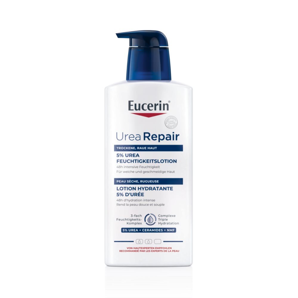 Eucerin Urea Repair Plus ist eine Lotion ohne Duftstoffe zur täglichen Pflege bei trockener bis extrem trockner Haut gedacht. Die reichhaltige Lotion zieht schnell ein, ohne dabei einen klebrigen Film auf der Haut zu hinterlassen. Sie reduziert den Feuchtigkeitsverlust und stärkt dabei die Hautbarriere, indem sie das Netzwerk der Aquaporine mit der naturidentischem Gluco-Glycerol Formel aktiviert und die Bildung neuer Aquaporine stimuliert. So werden tiefere epidermale Hautschichten optimal mit Feuchtigkeit versorgt. Der Feuchtigkeitsmangel wird mit 5 % Urea und weiteren Feuchthaltefaktoren (NMF) ausgeglichen, wobei die Feuchtigkeitsbindung in den oberen Hautschichten nachhaltig erhöht wird. Die Lotion stärkt zudem die Hautbarriere und fördert die hauteigene Feuchtigkeitsversorgung. Durch die keratolytische Wirkung wird die Abschuppung unterstützt, wodurch sich die Haut beruhigt. Das Spannungsgefühl der Haut wird deutlich gemindert und erhält wieder eine weiches, glattes und geschmeidiges Hautgefühl, sowie ein gesundes Aussehen.