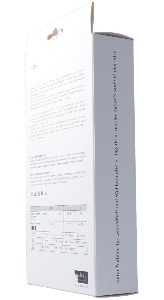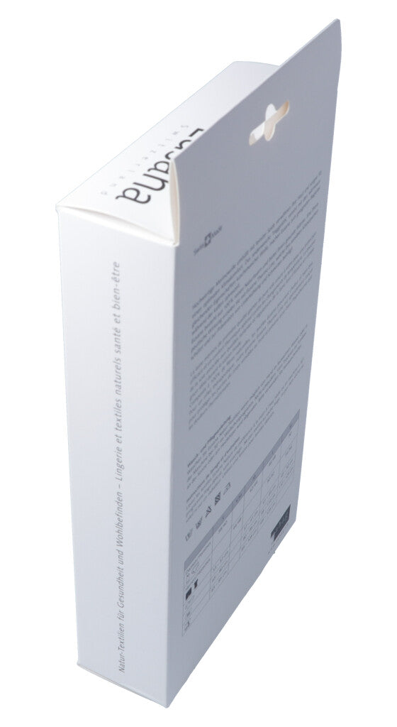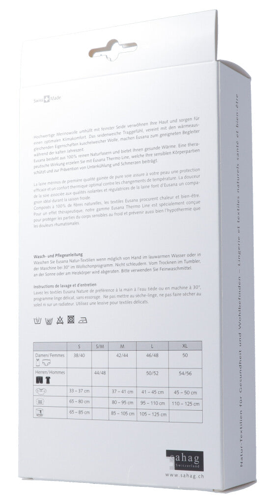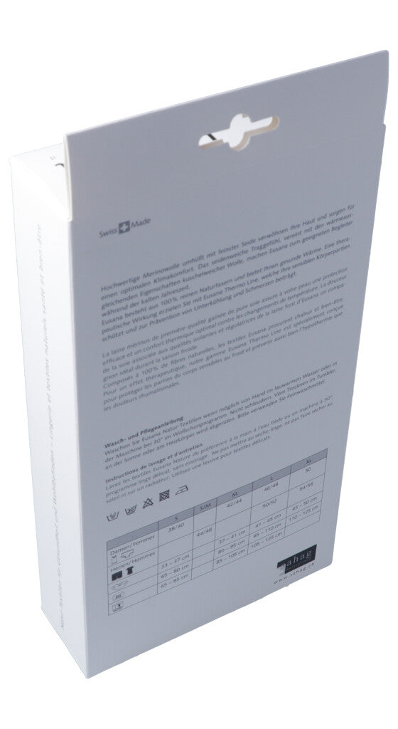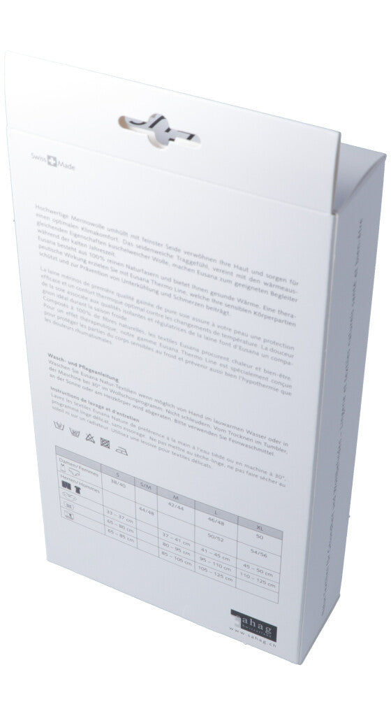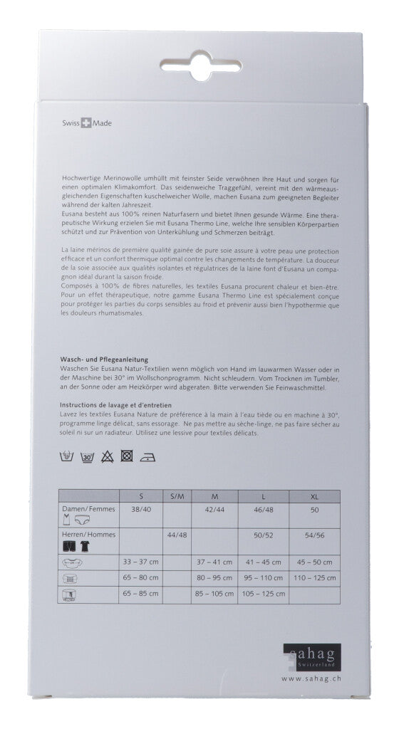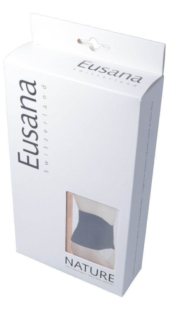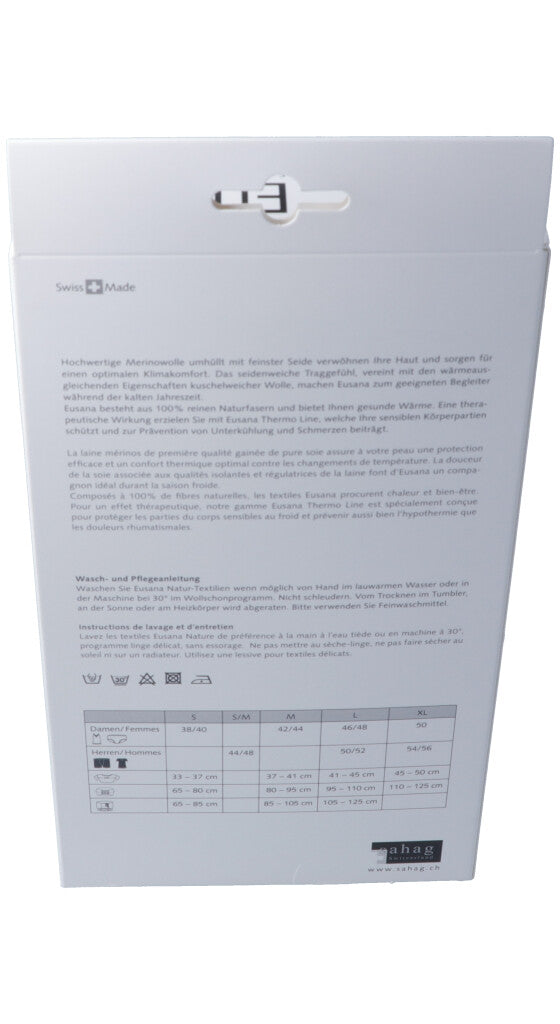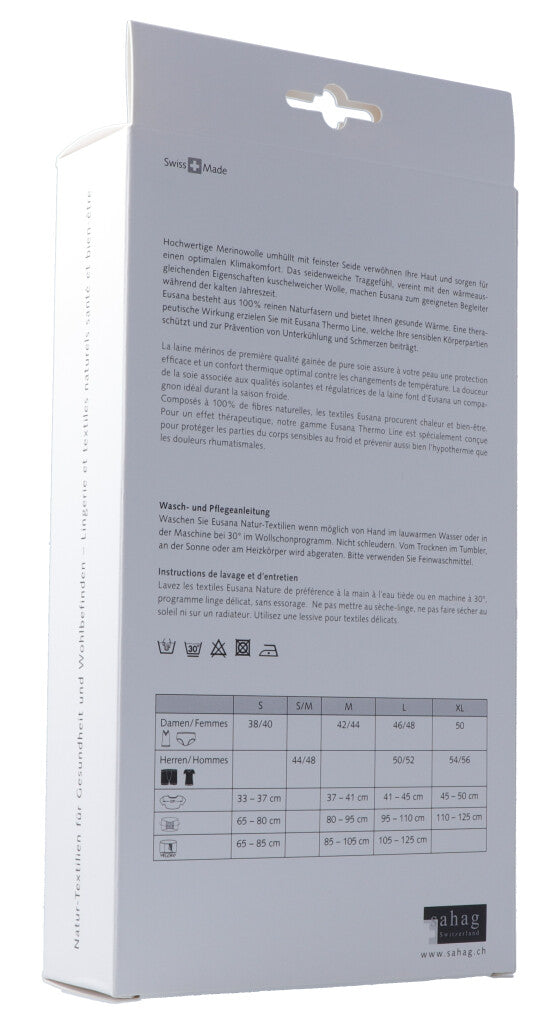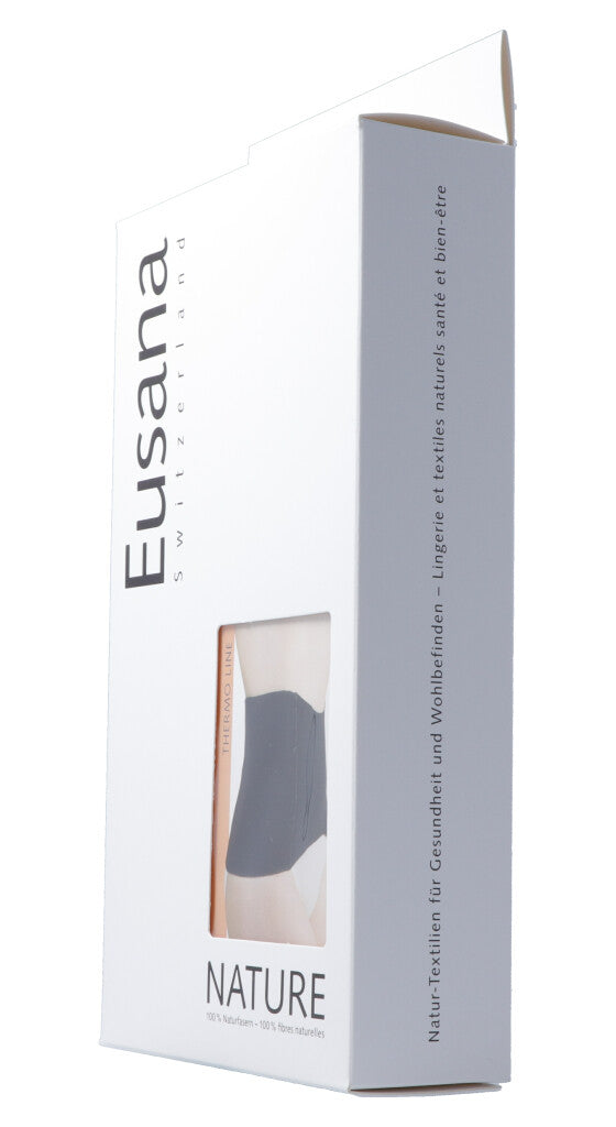 Hochwertige Merinowolle umhüllt mit feinster Seide verwöhnen Ihre Haut und sorgen für einen optimalen Klimakomfort. Das seidenweiche Traggefühl, vereint mit den wärmeausgleichenden Eigenschaften kuschelweicher Wolle, machen Eusana zum geeigneten Begleiter während der kalten Jahreszeit. Eusana besteht aus 100% reinen Naturfasern und bietet Ihnen gesunde Wärme. Eine therapeutische Wirkung erzielen Sie mit Eusana Thermo Line, welche Ihre sensiblen Körperpartien schützt und zur Prävention von Unterkühlung und Schmerzen beiträgt.