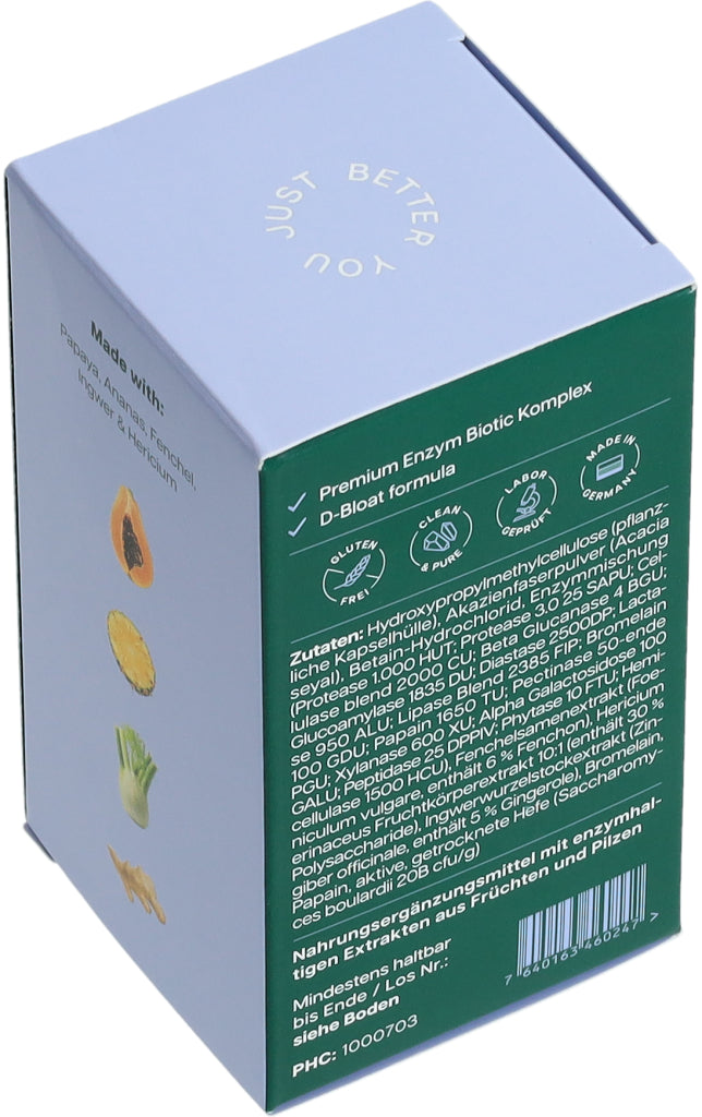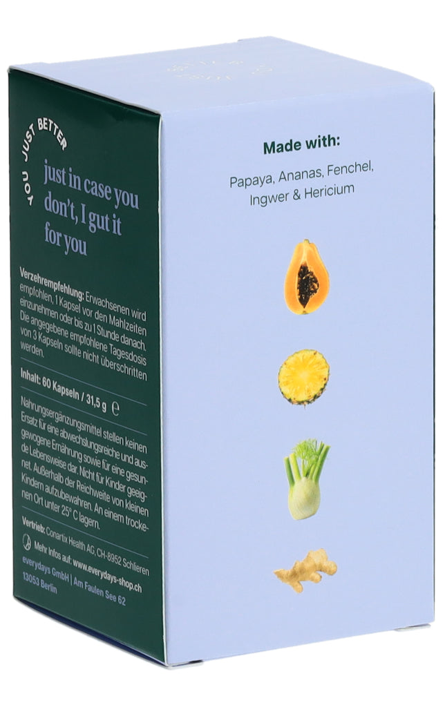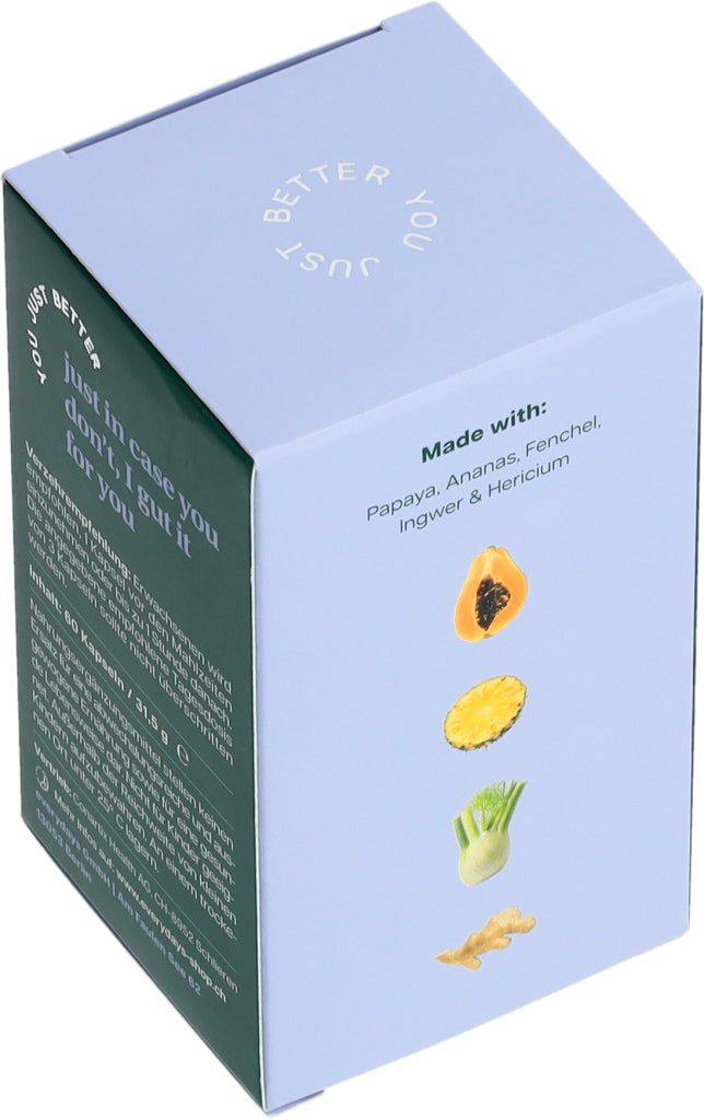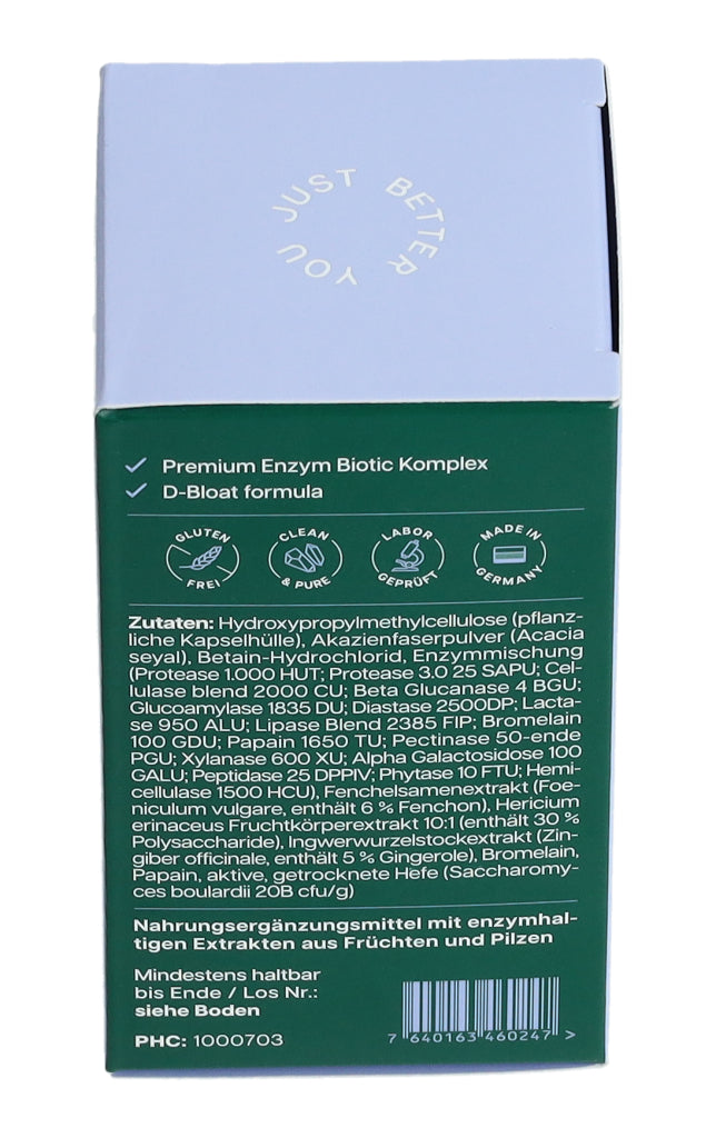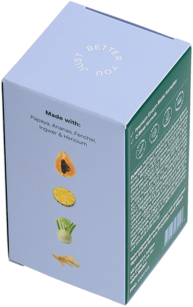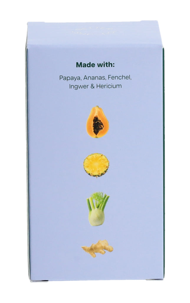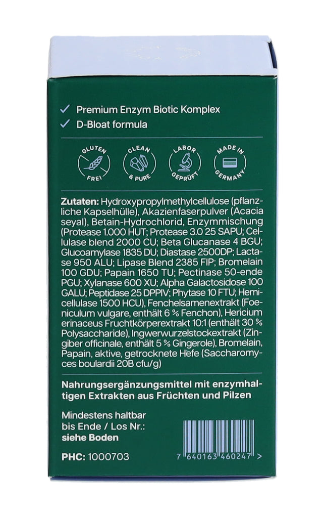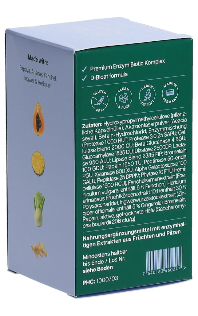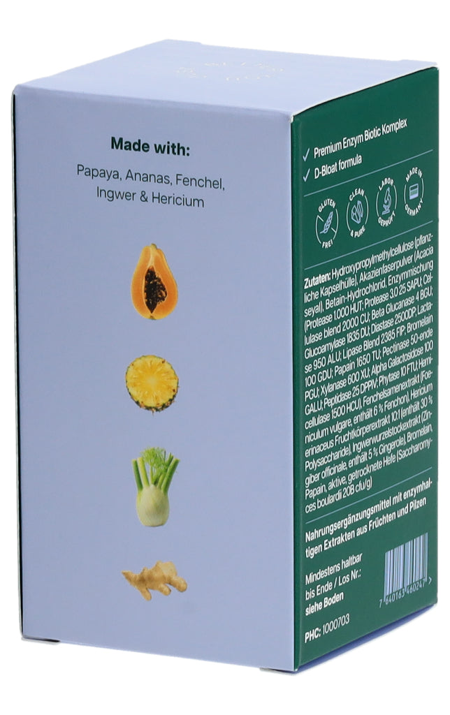 Betain HCL 60mg (Betain 57.6mg), Enzymmischung mit Full Spectrum Protease 50mg (Protease 70’000 HUT, Protease 3.0 25 SAPU, Cellulase Blend 2’000 CU, Beta Glucanase 4 BGU, Glucoamylase 1835 DU, Diastase 2500 DP, Lactase 950 ALU, Lipase Blend 2385 FIP, Bromelain 100 GDU,Papain 1650 TU, Pectinase 50 PGU, Xylanase 600 XU, Alpha Galactosidase 100 GALU,Peptidase 25 DPPIV, Phytase 10 FTU, Hemicellulase 1500 HCU), Fenchel Extrakt (4:1) 40mg, Hericium Erinaceus Extrakt 40mg (Polysaccharide 12mg, Beta-Glucane 2mg), Bromelain 600gdu/g 40mg, Papain 6000 USP-U/mg, 40mg Ingwer Extrakt (5% Gingerole; Zingiber Officinale; Wurzel) 40mg, Saccharomyces Boulardii 20B cfu/g 20mg.