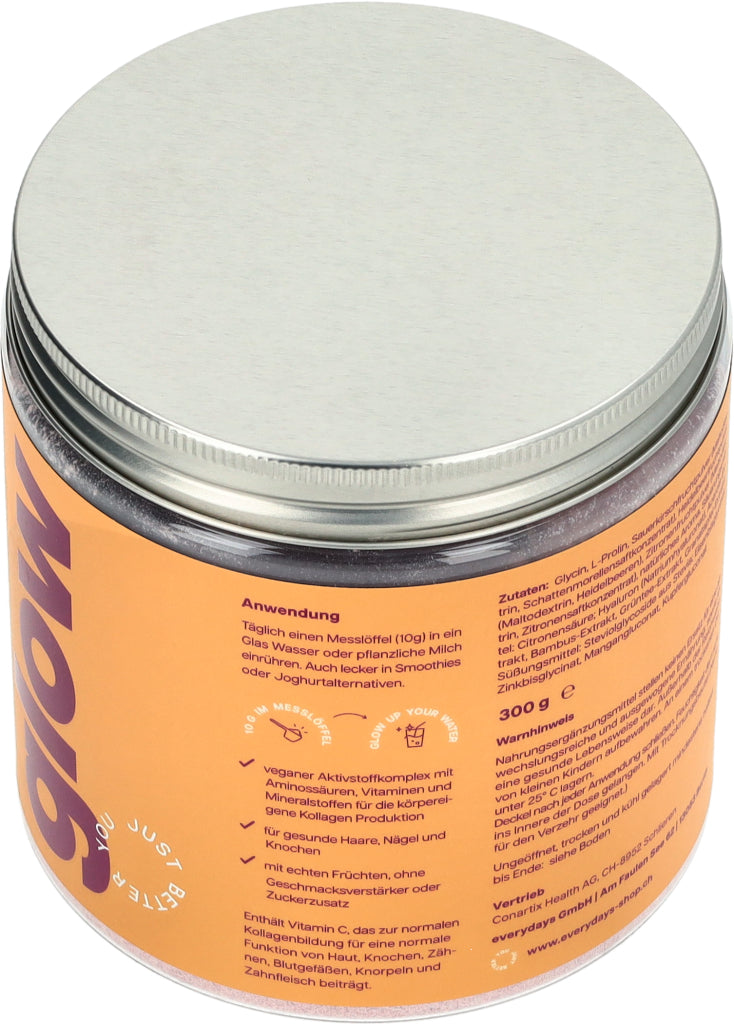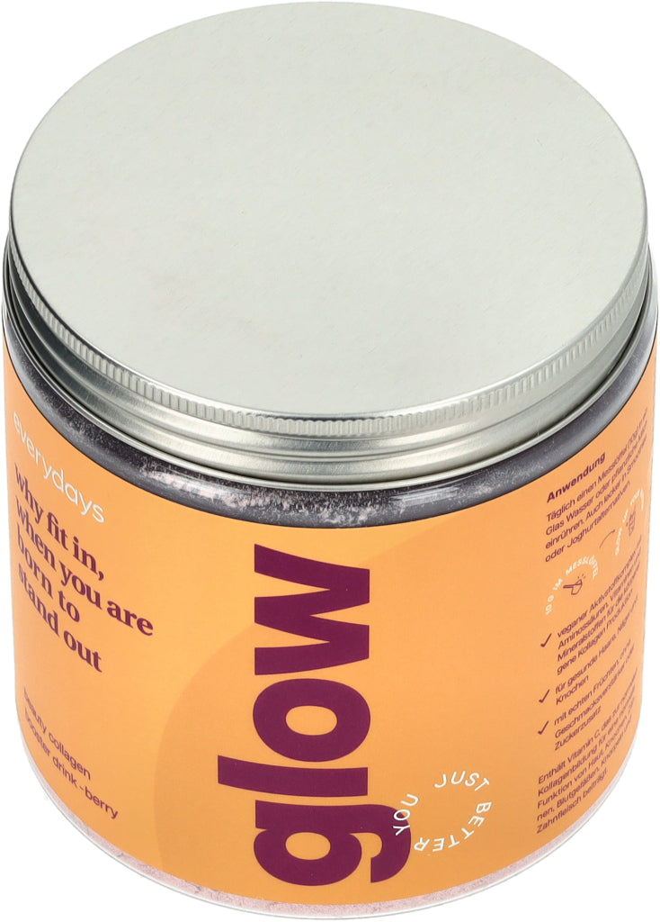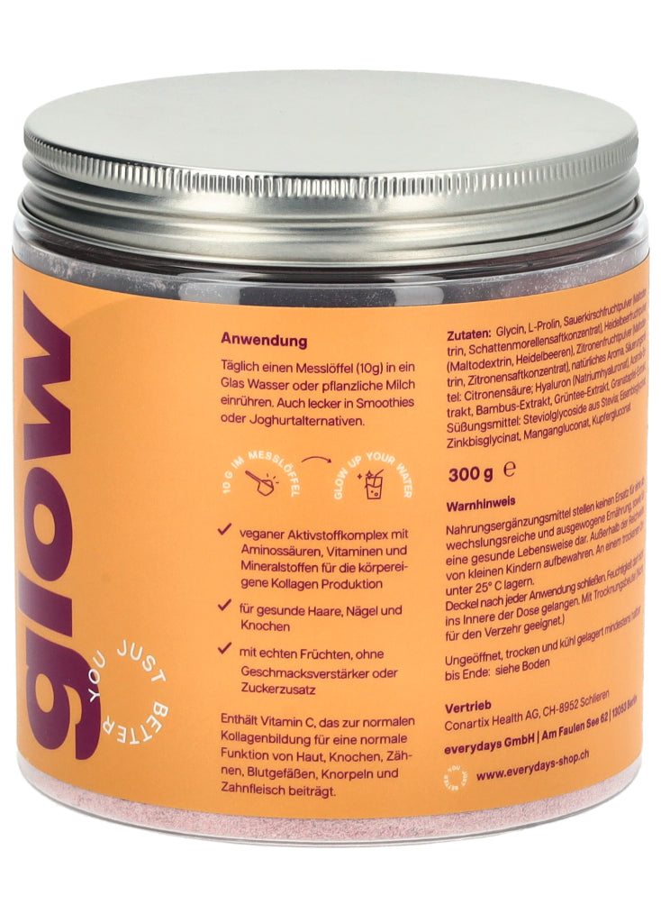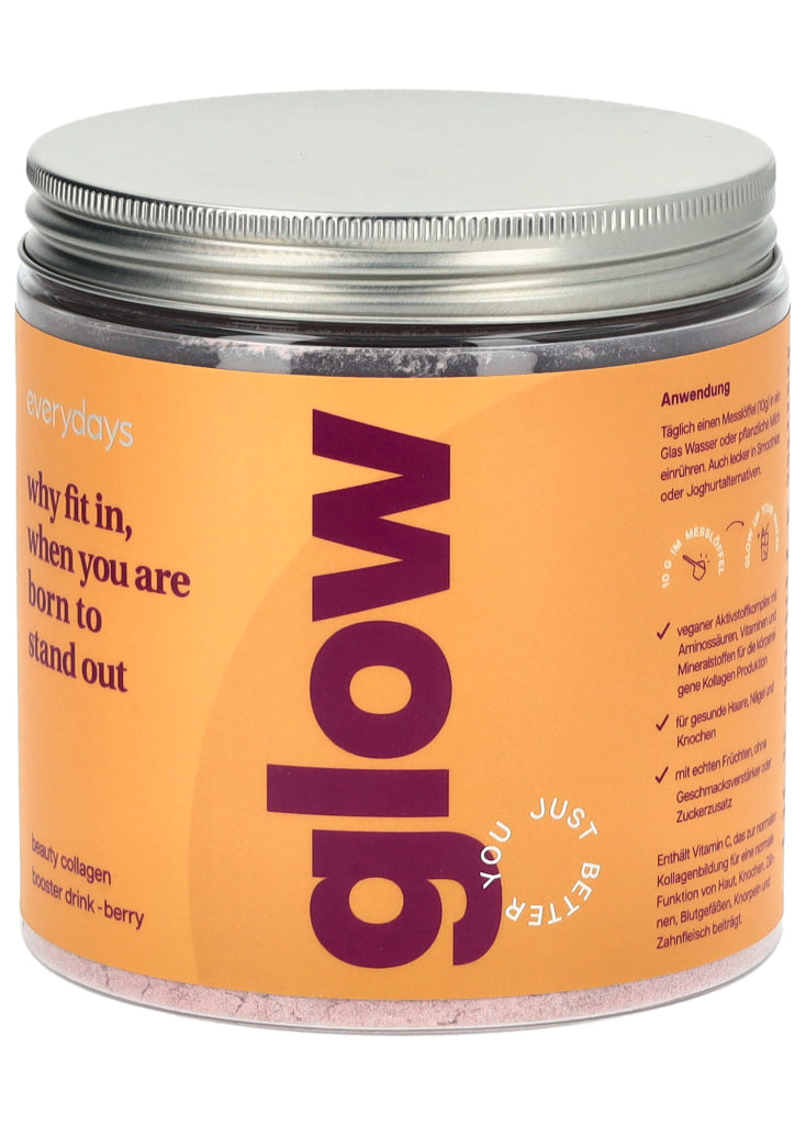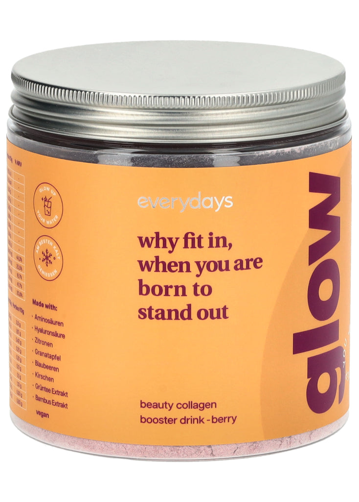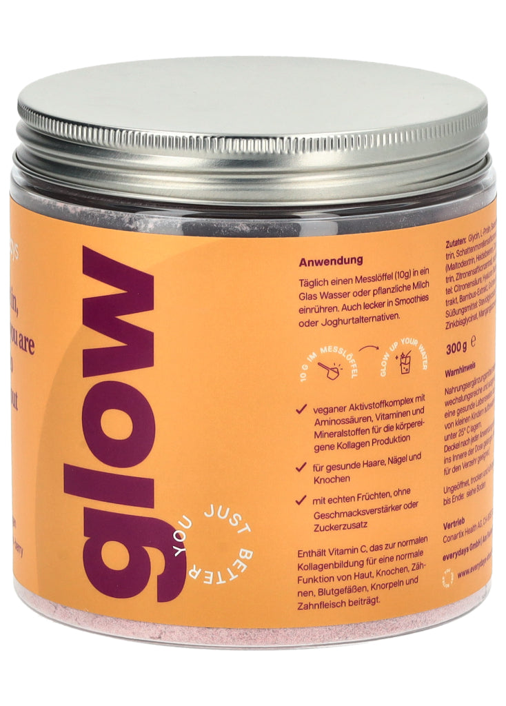 everydays Glow ist der feinschmeckende, vegane Kollagen-Booster mit hochdosierter, niedermolekularer Hyaluronsäure. Einfach 10 g in 300 - 500 ml Wasser einrühren und fertig ist der fruchtig-beerige Beauty-Drink.