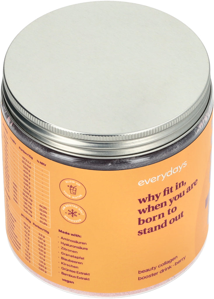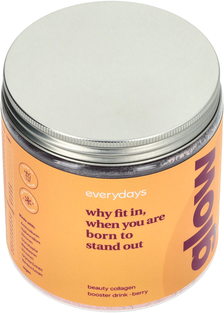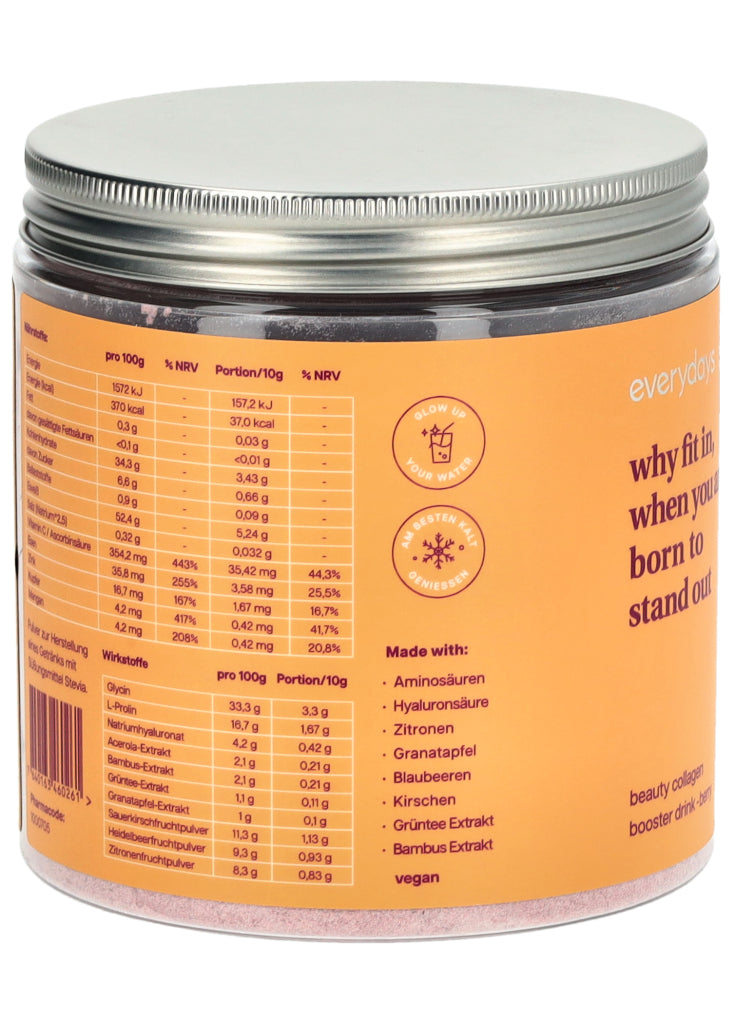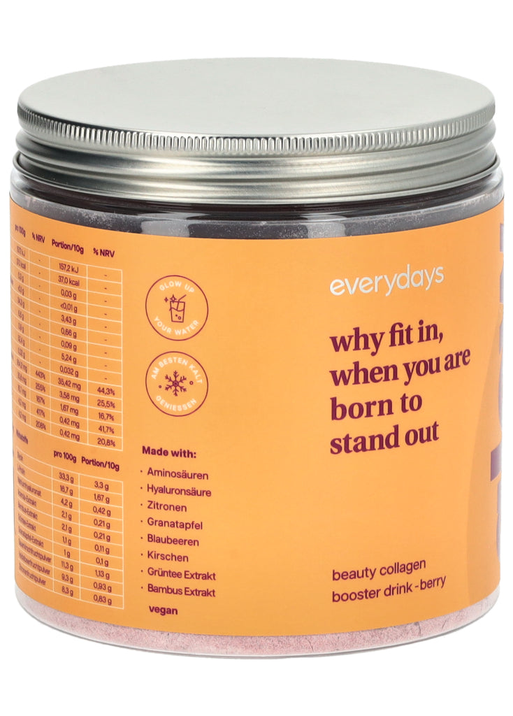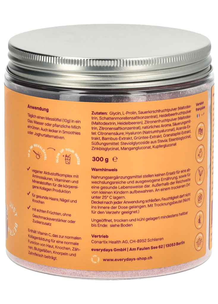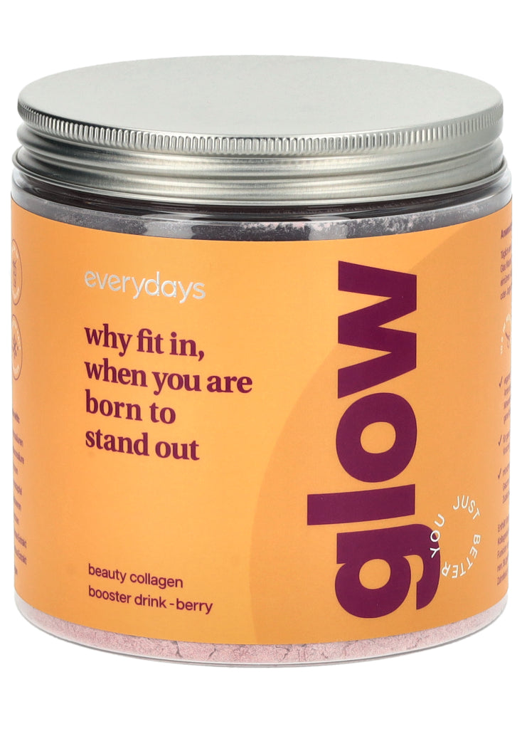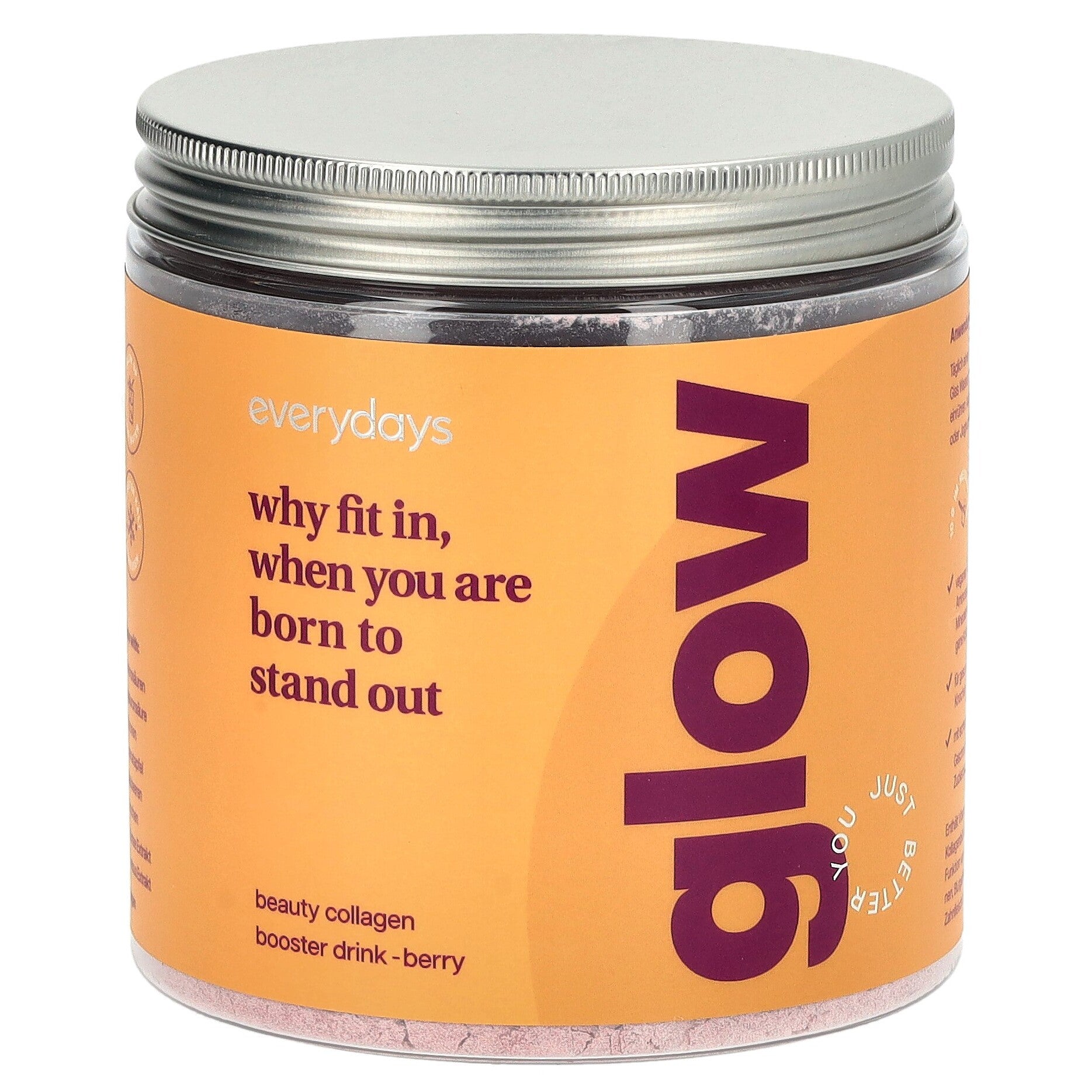 everydays Glow ist der feinschmeckende, vegane Kollagen-Booster mit hochdosierter, niedermolekularer Hyaluronsäure. Einfach 10 g in 300 - 500 ml Wasser einrühren und fertig ist der fruchtig-beerige Beauty-Drink.